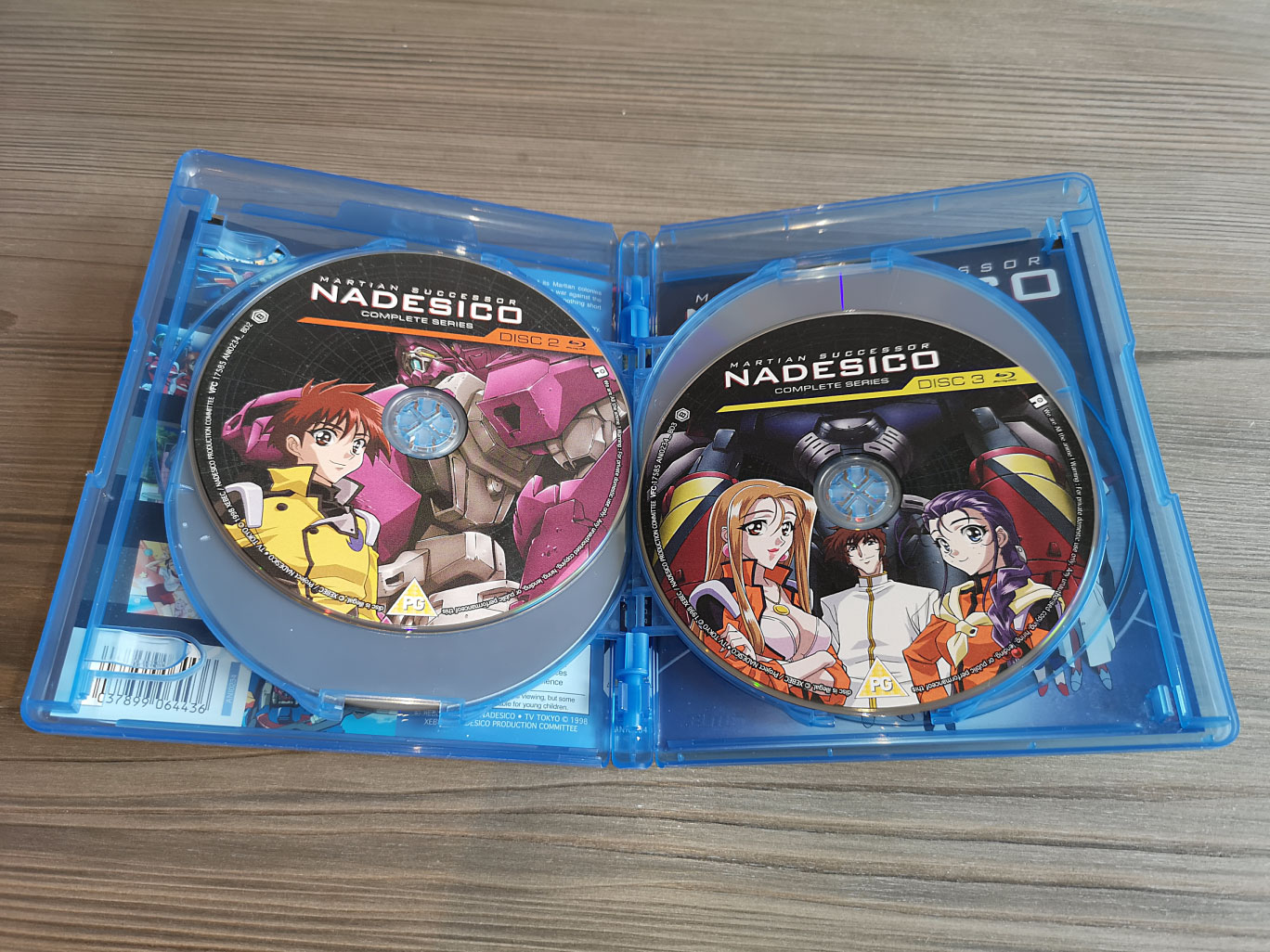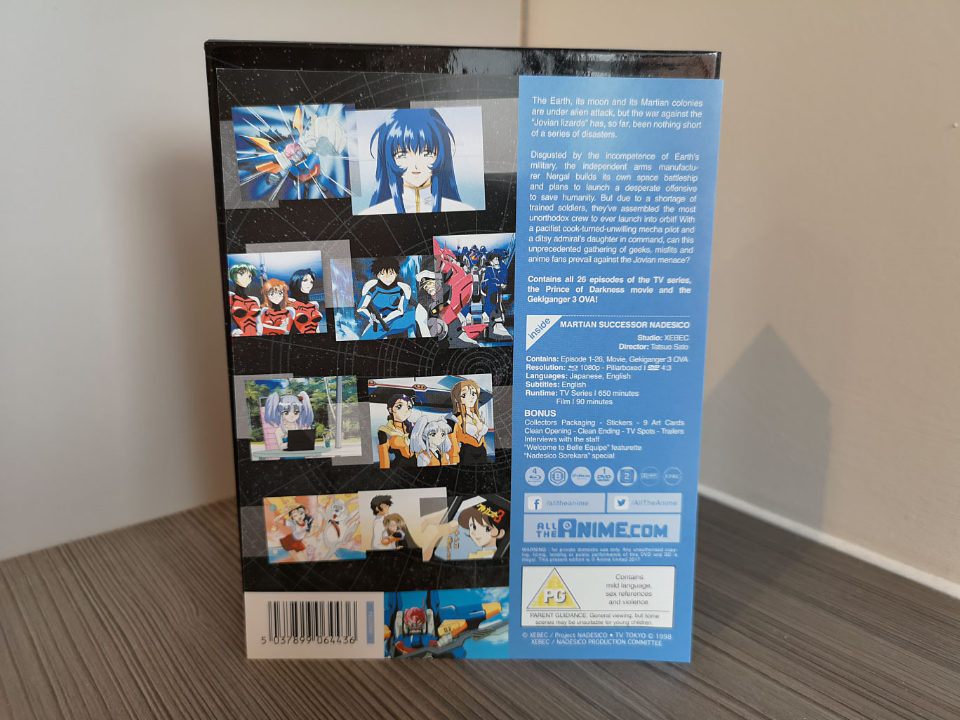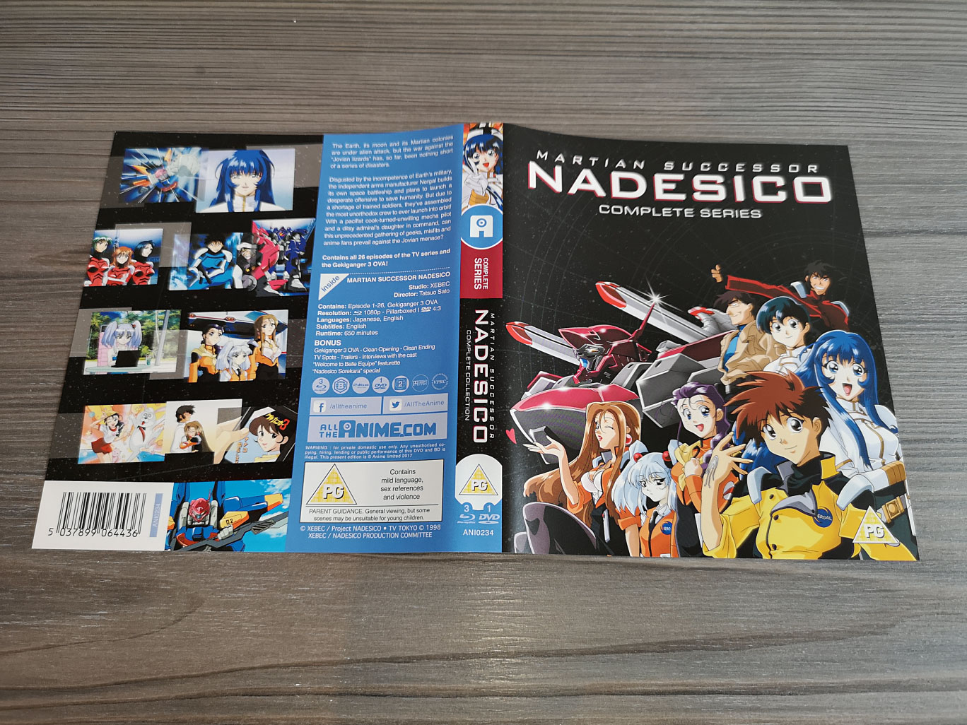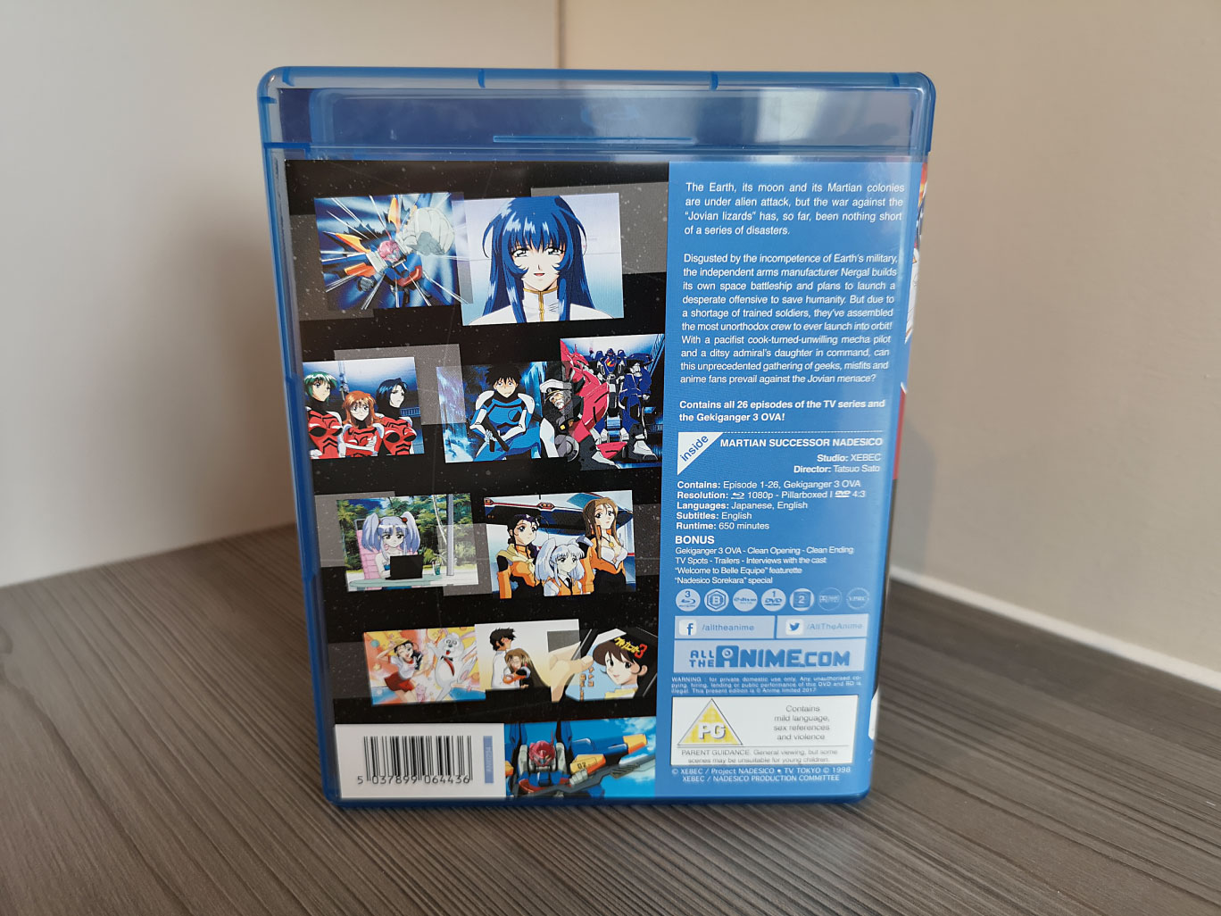 Released in August 2017, Martian Successor Nadesico from Anime Limited contains the entire series (episodes 1-26) across three Blu-ray discs, with an additional DVD disc dedicated to the Gekigangar 3 OVA and a fourth Blu-ray disc dedicated to Nadesico the Movie: Prince of Darkness. Audio options available include the main Japanese language with English subtitles and the ADV Films English dub. The yellow subtitles are unlockable during playback, and the region is locked to B for Blu-ray and 2 for DVD in NTSC format.