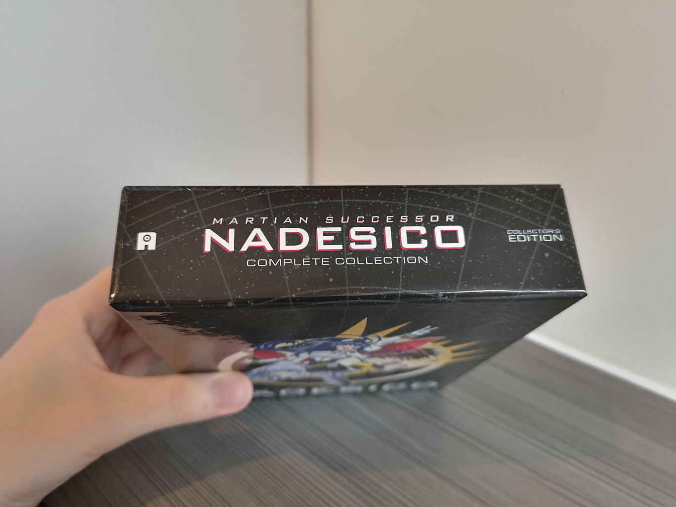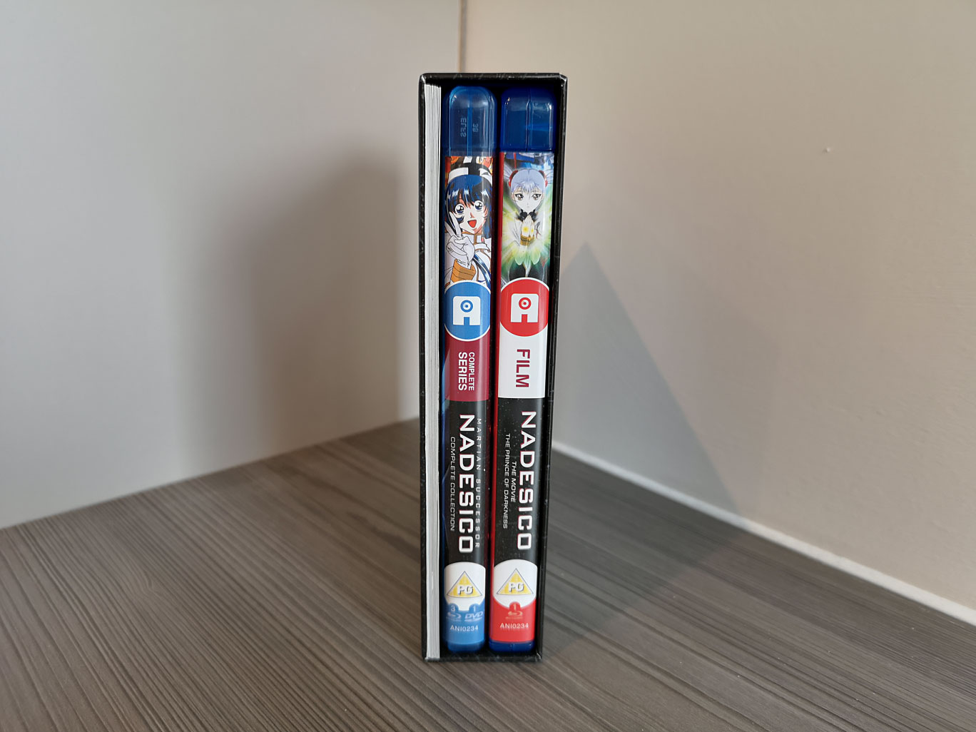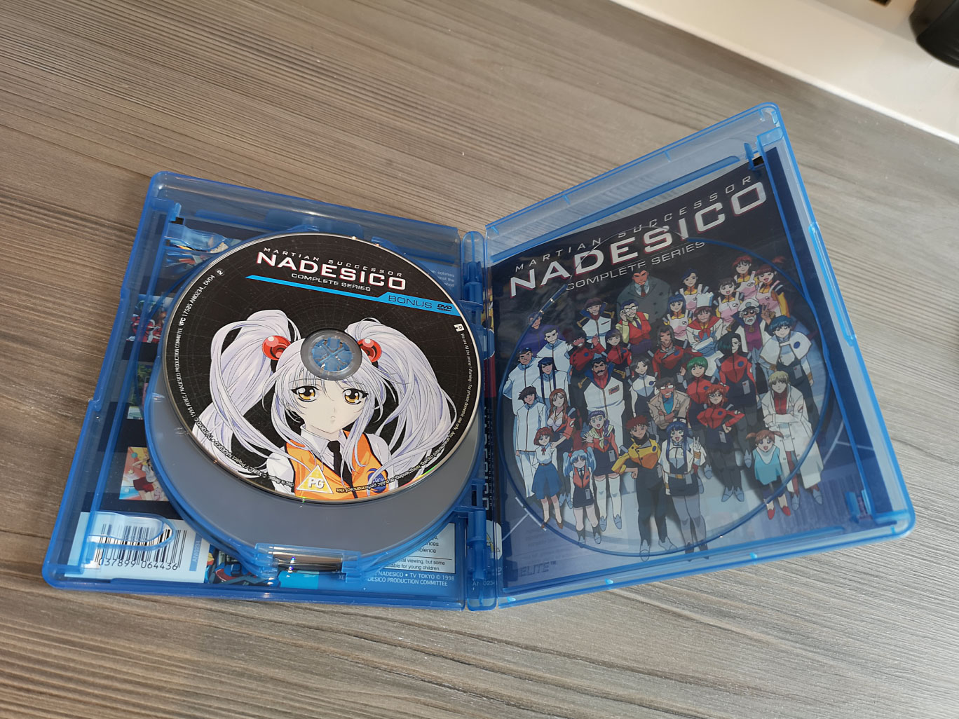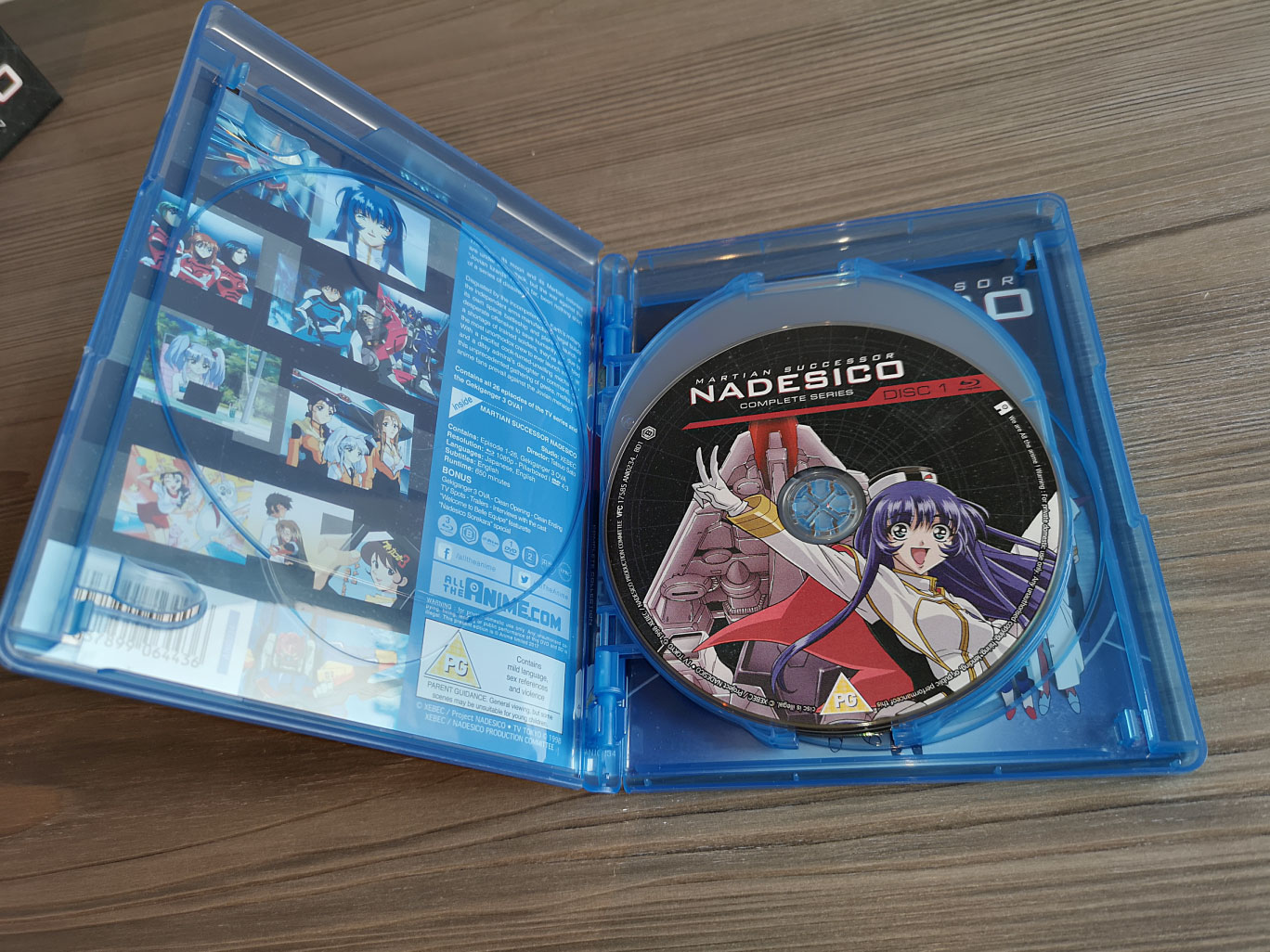 Released in August 2017, Martian Successor Nadesico from Anime Limited contains the entire series (episodes 1-26) across three Blu-ray discs, with an additional DVD disc dedicated to the Gekigangar 3 OVA and a fourth Blu-ray disc dedicated to Nadesico the Movie: Prince of Darkness. Audio options available include the main Japanese language with English subtitles and the ADV Films English dub. The yellow subtitles are unlockable during playback, and the region is locked to B for Blu-ray and 2 for DVD in NTSC format.