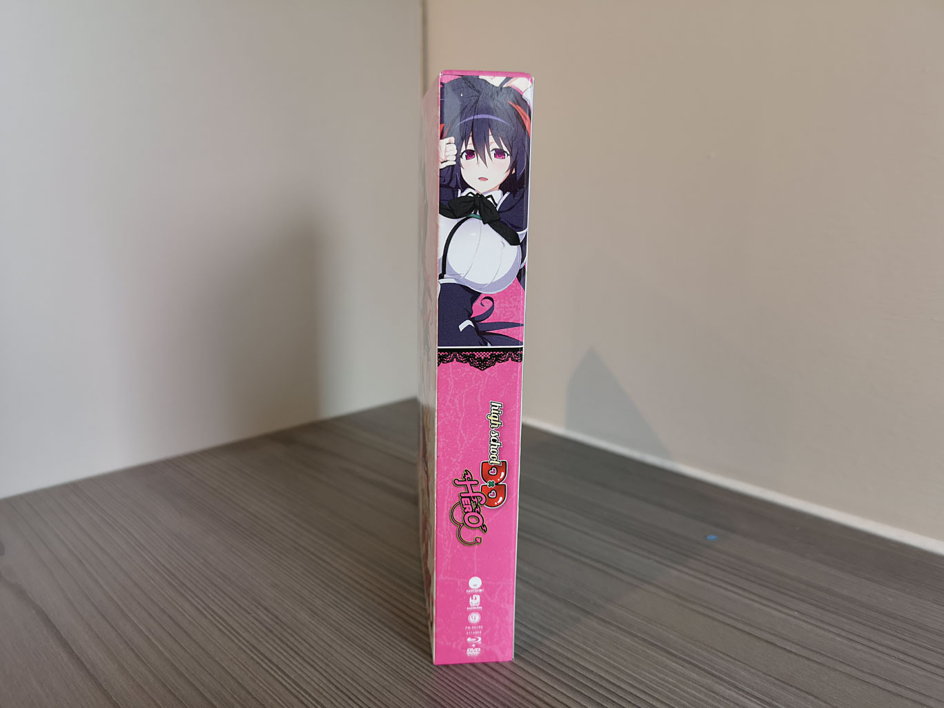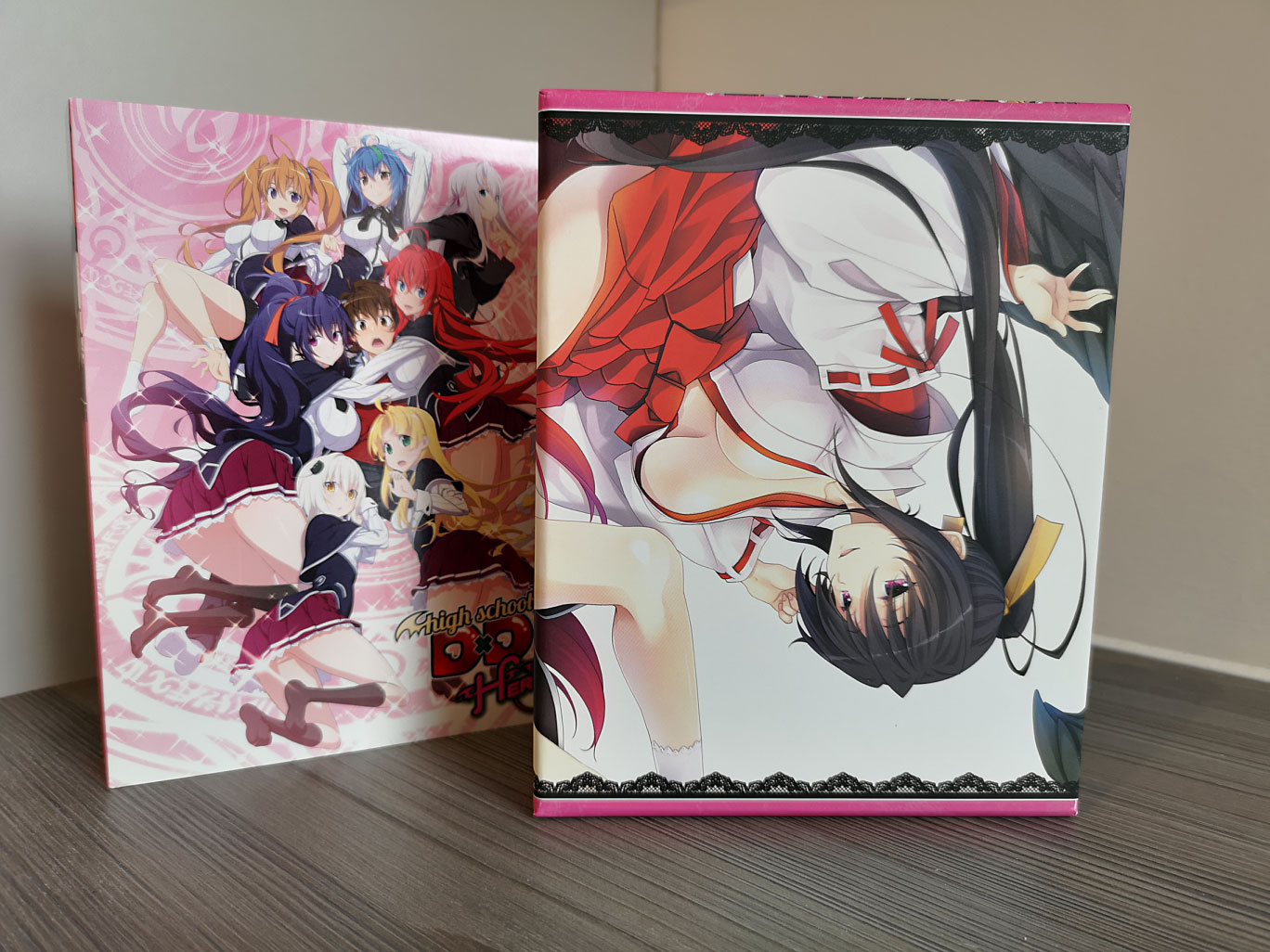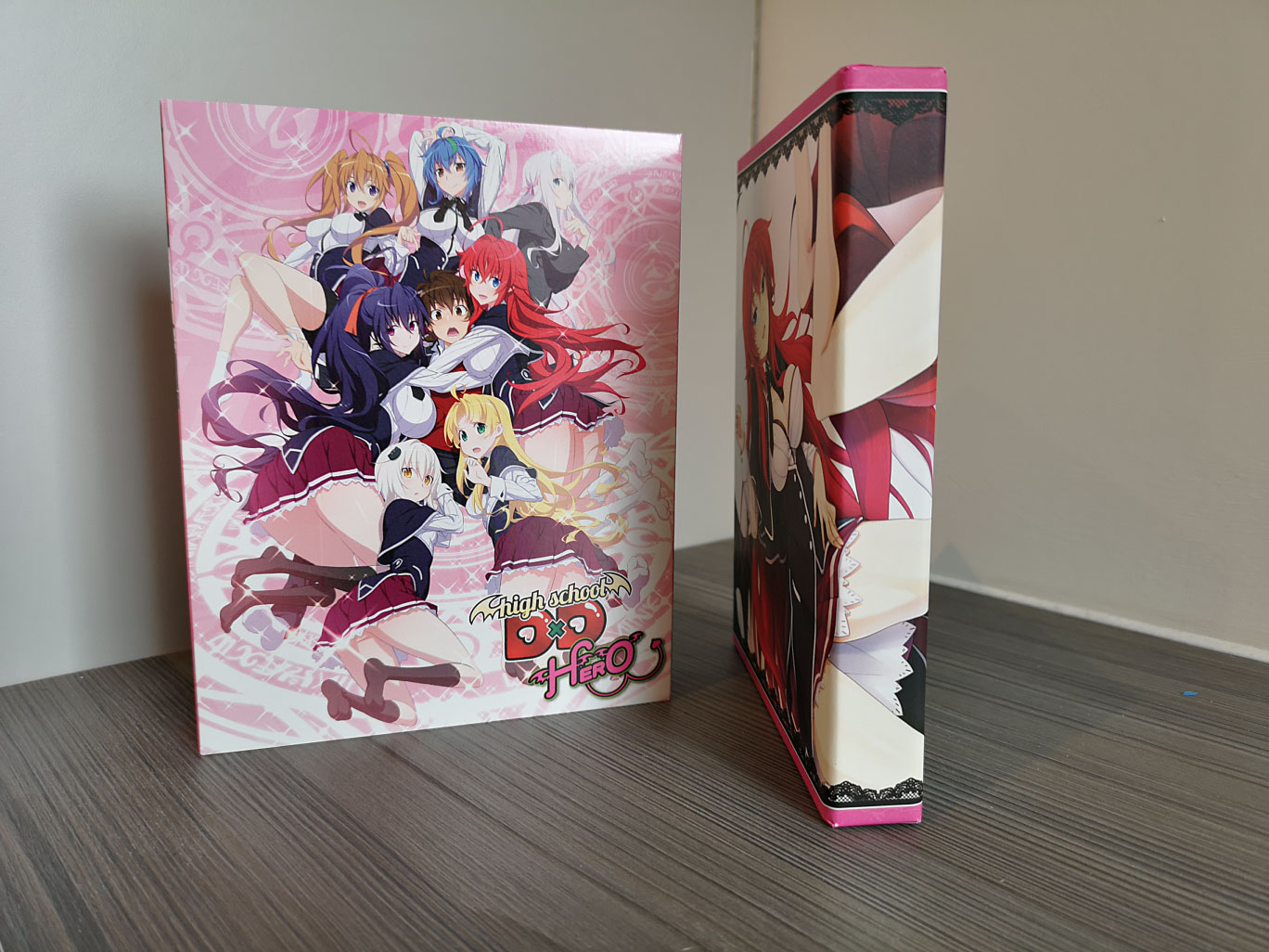 Included in this limited edition are as follows; a booklet featuring character information and fanservice artwork, a light novel called High School DxD 0 which was included in the Japanese Blu-ray volumes of this season, a fabric poster, and four uncensored art cards. The main series, which is held in a single Blu-ray case, and the booklet are housed inside a rigid box with a slipcover. The fabric poster and art cards are housed in a cardboard box. In addition, both that cardboard box and the light novel are placed outside of the rigid box set.