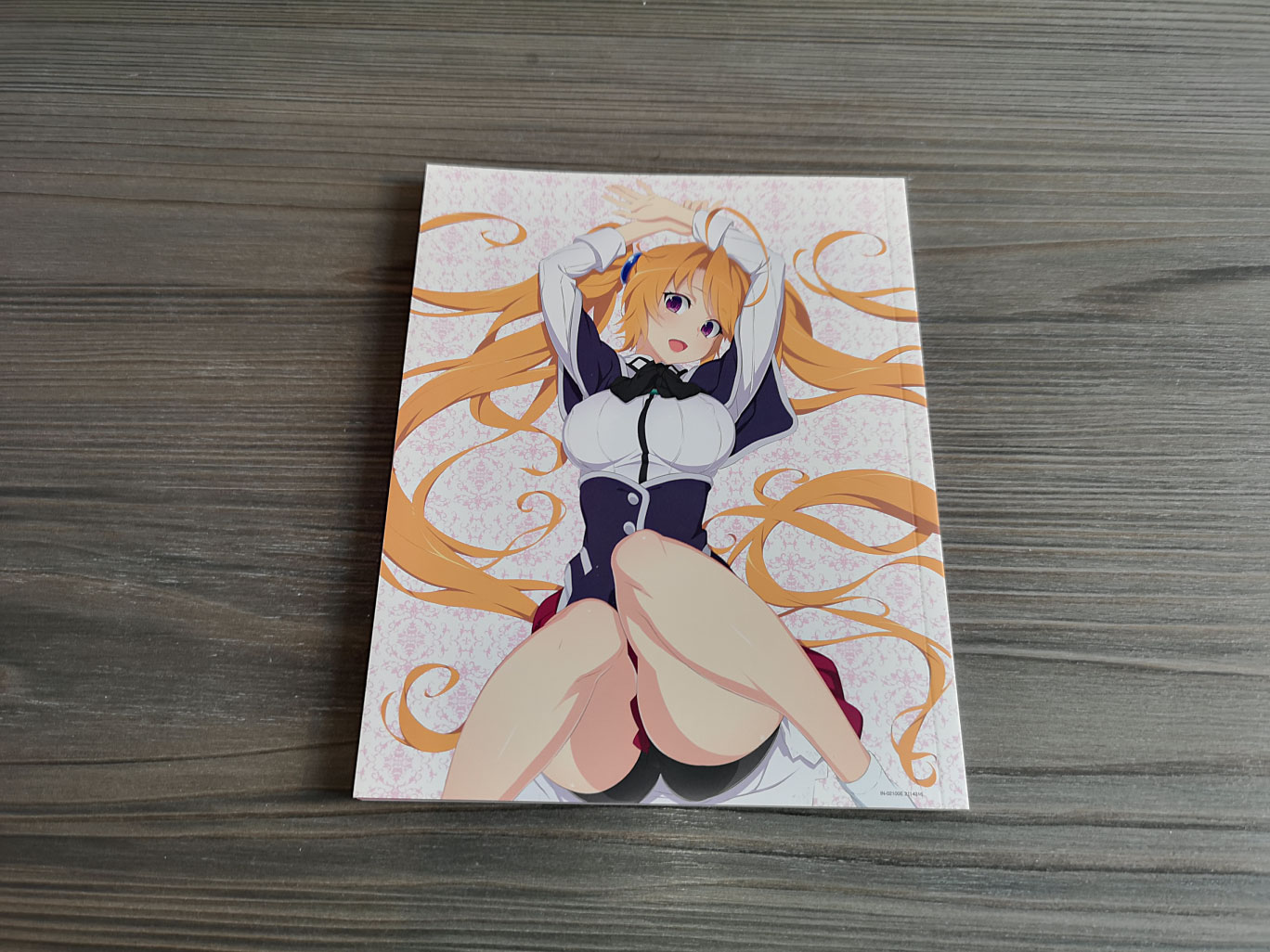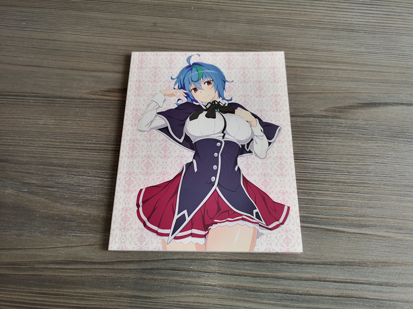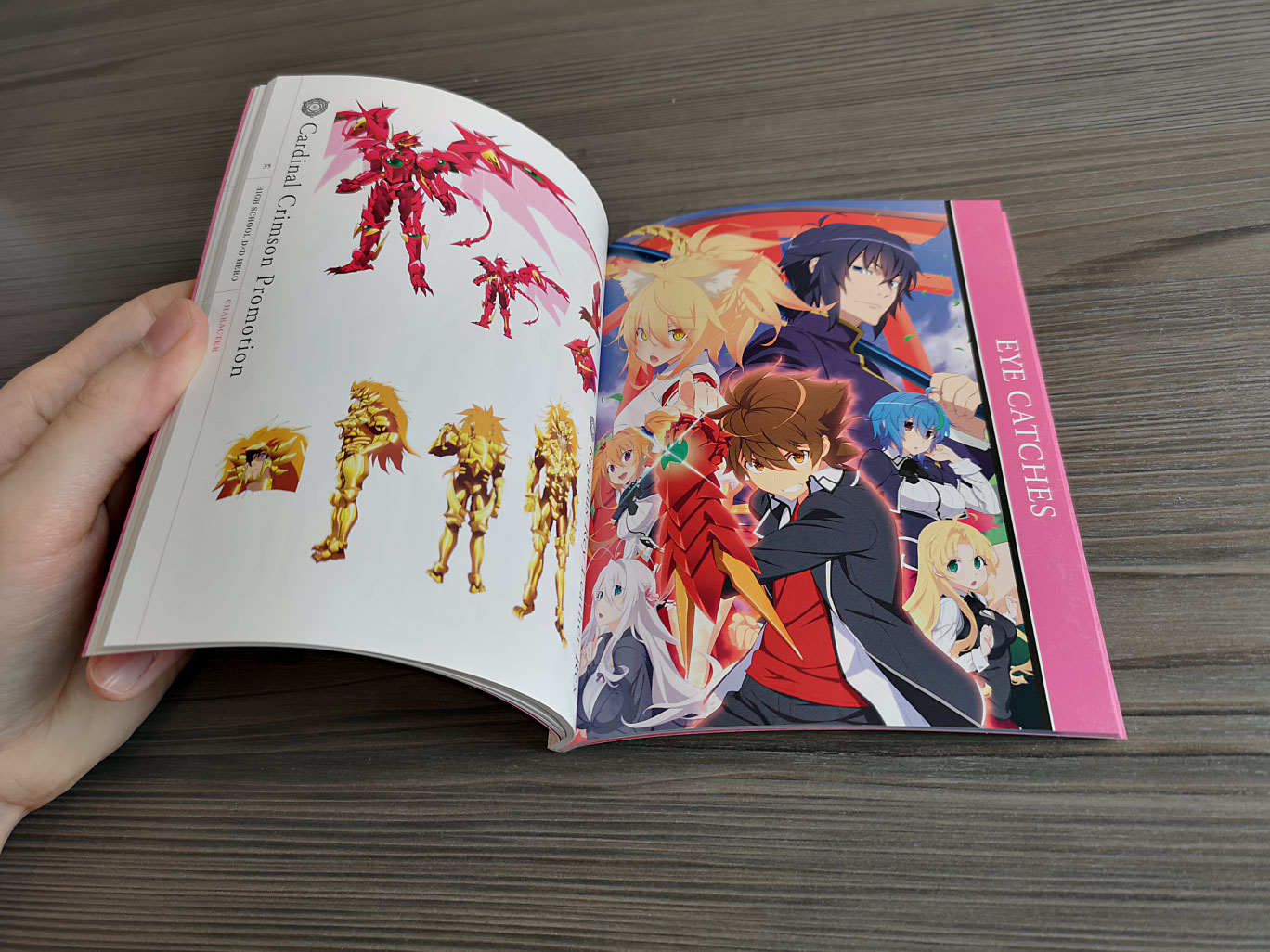 Included in this limited edition are as follows; a booklet featuring character information and fanservice artwork, a light novel called High School DxD 0 which was included in the Japanese Blu-ray volumes of this season, a fabric poster, and four uncensored art cards. The main series, which is held in a single Blu-ray case, and the booklet are housed inside a rigid box with a slipcover. The fabric poster and art cards are housed in a cardboard box. In addition, both that cardboard box and the light novel are placed outside of the rigid box set.