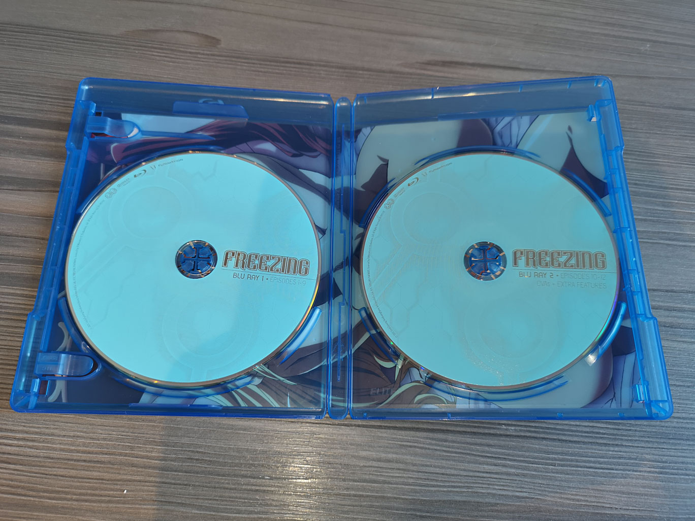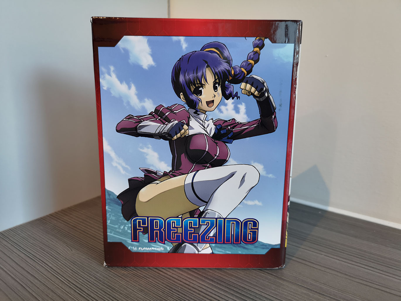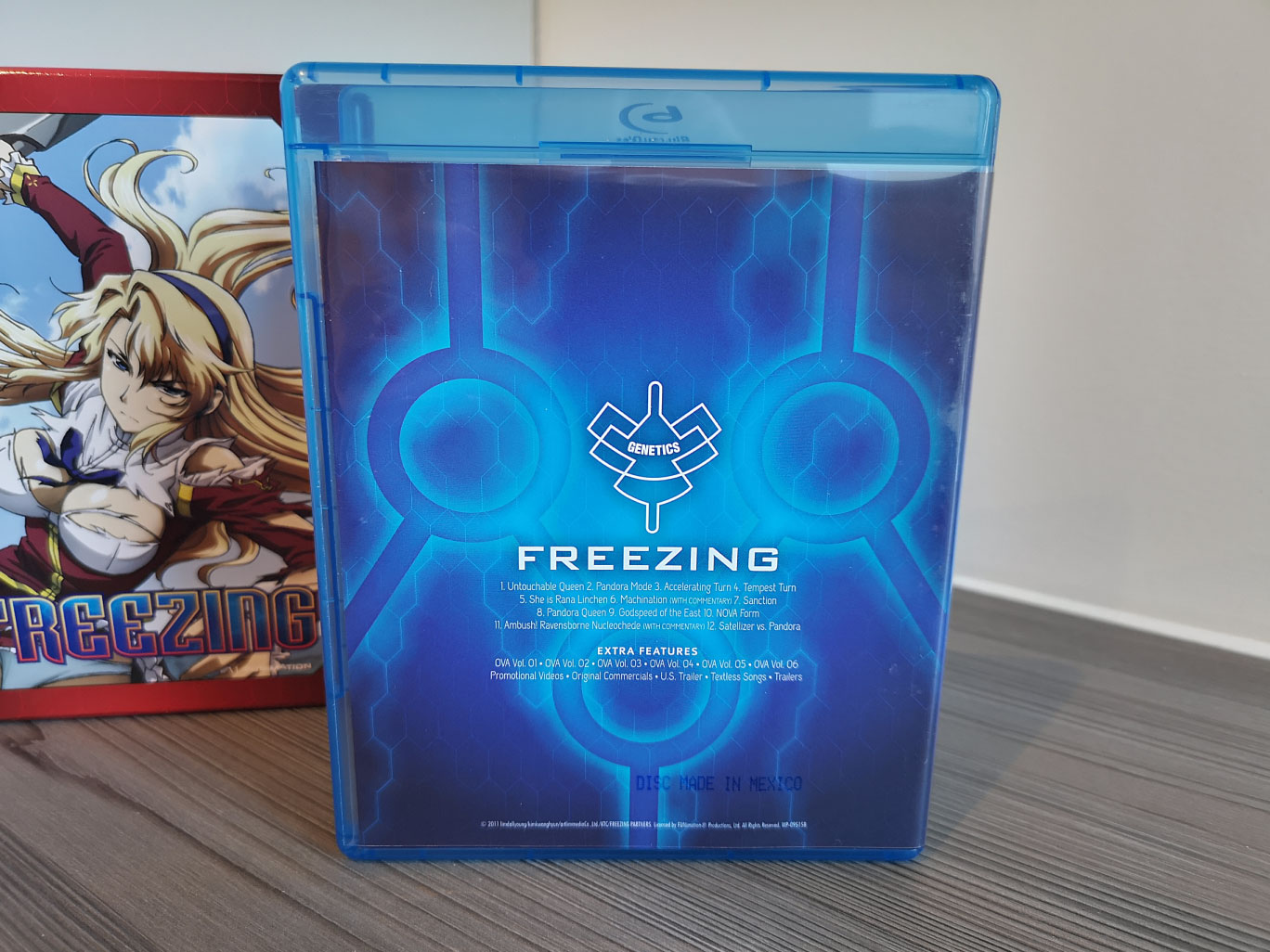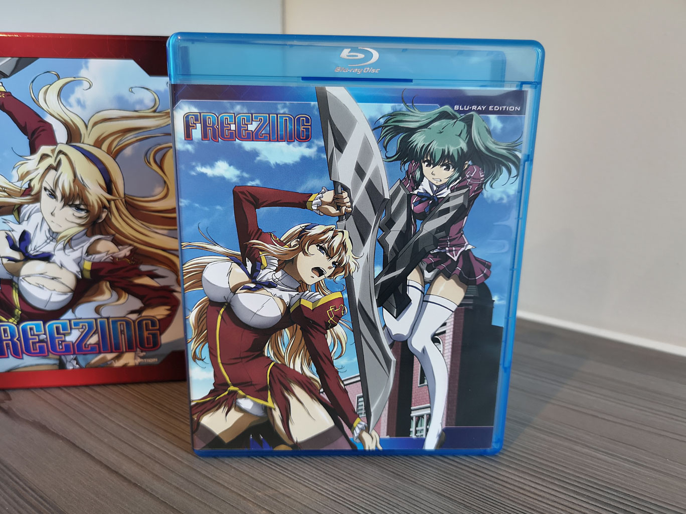 Released in August 2012, Freezing from Funimation contains the entire first season (12 episodes total) across two Blu-ray discs and two DVD discs using its own master. The audio options available include the Funimation English dub and the original Japanese audio with English subtitles. The white subtitles are unlockable during playback, and the Blu-ray discs are compatible with Regions A & B Blu-ray players and Regions 1, 2 & 4 DVD players. The DVD discs are in NTSC format.