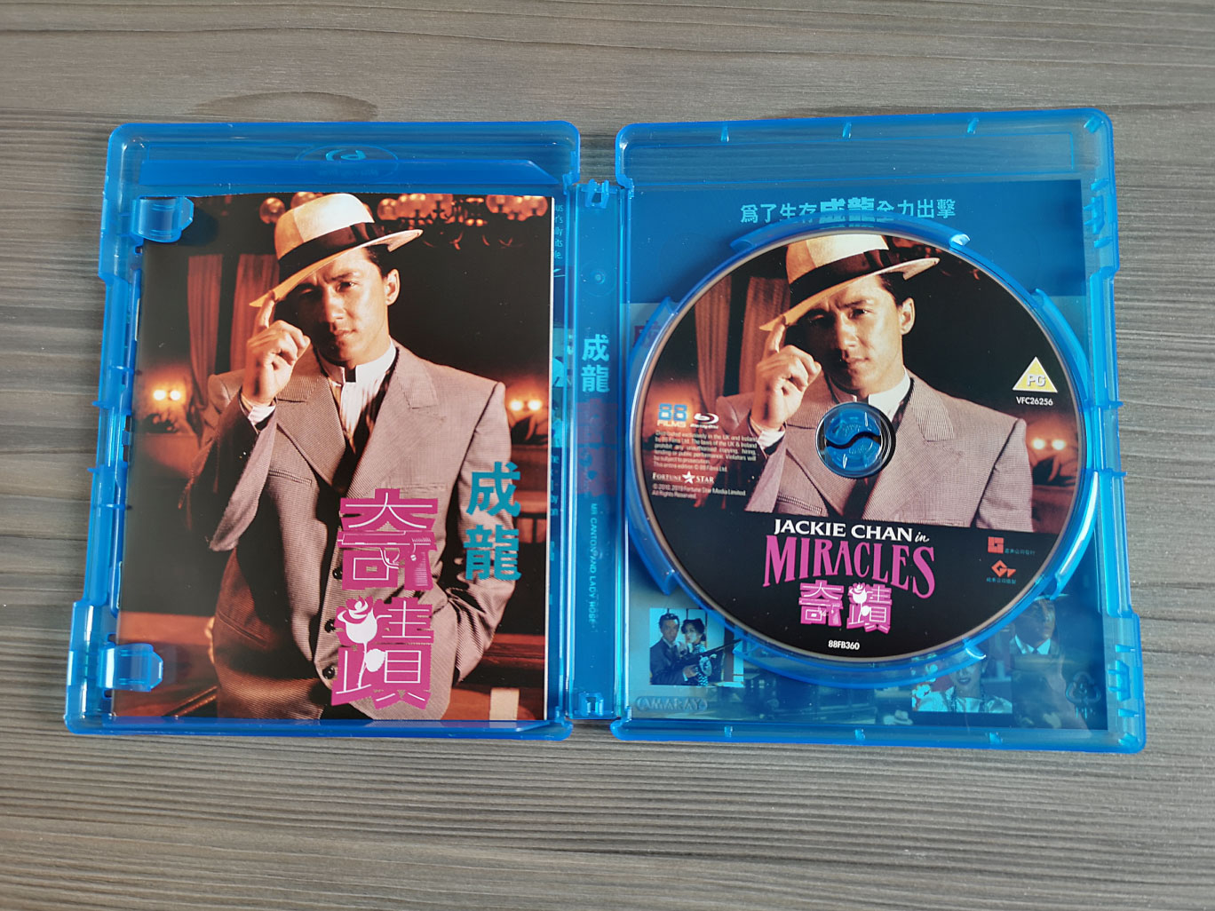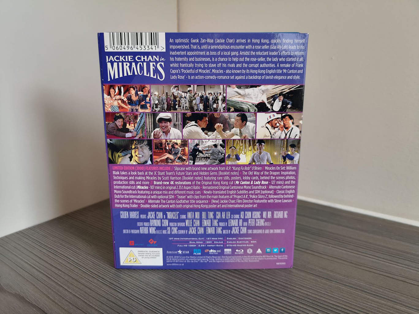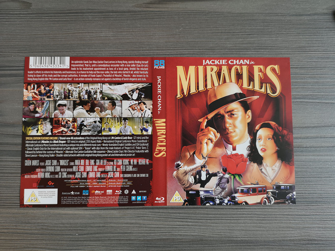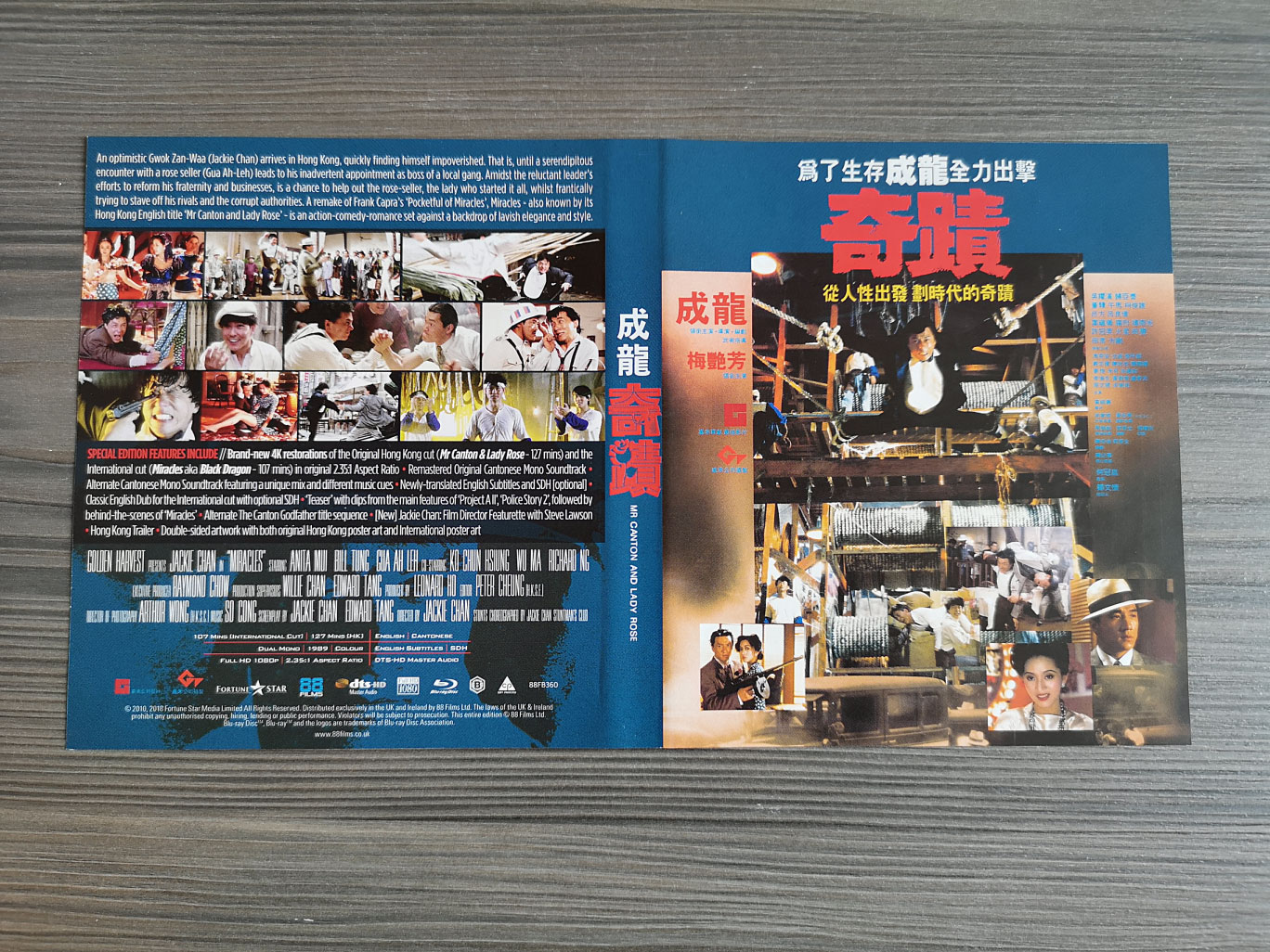 The audio options available feature the main Cantonese language with newly translated English subtitles as well as the English dub. This release includes both the original Hong Kong version (Mr Canton and Lady Rose) running at 127 minutes and also the International version (Miracles) that ran at 107 minutes, using the 4K transfer at its original 2.35:1 aspect ratio. The Blu-ray disc is Region B locked and the subtitles are unlockable during playback.