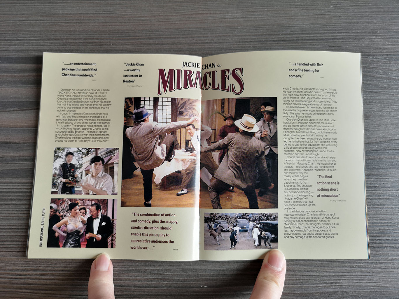“An optimistic Gwok Zan-Waa (Jackie Chan) arrives in Hong Kong, quickly finding himself impoverished. That is, until a serendipitous encounter with a rose seller (Gua Ah-Leh) leads to his inadvertent appointment as boss of a local gang. Amidst the reluctant leader’s efforts to reform their fraternity and businesses, is an endeavour to share his new-found fortune with the bestower, all whilst trying to stave off rivals and the authorities. A remake of Frank Capra’s ‘Pocketful of Miracles’, Miracles – also known by its Hong Kong English title ‘Mr Canton and Lady Rose’ – is an action-comedy-romance set against a backdrop of lavish elegance and style.”