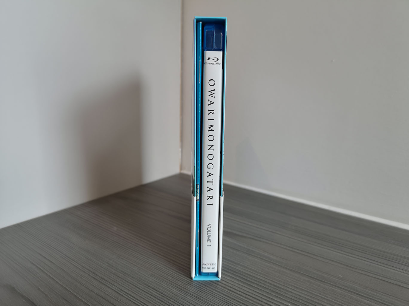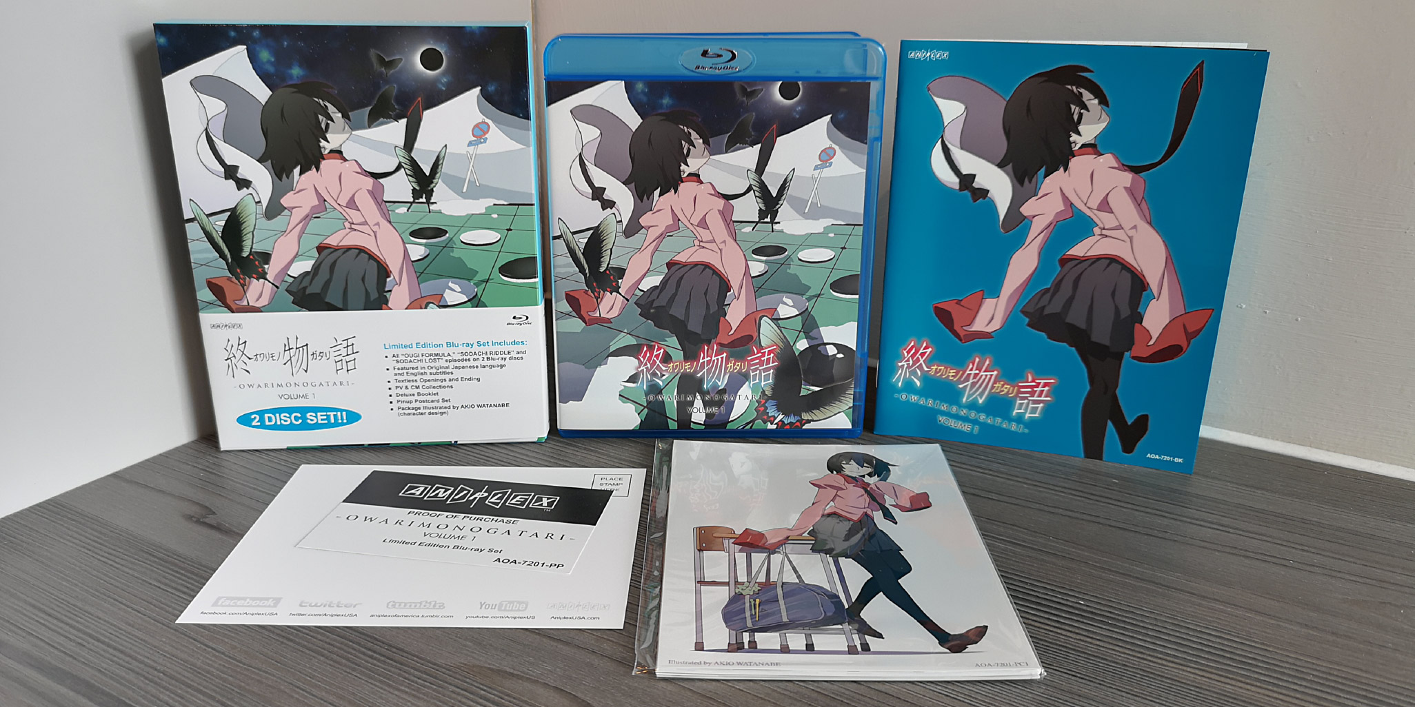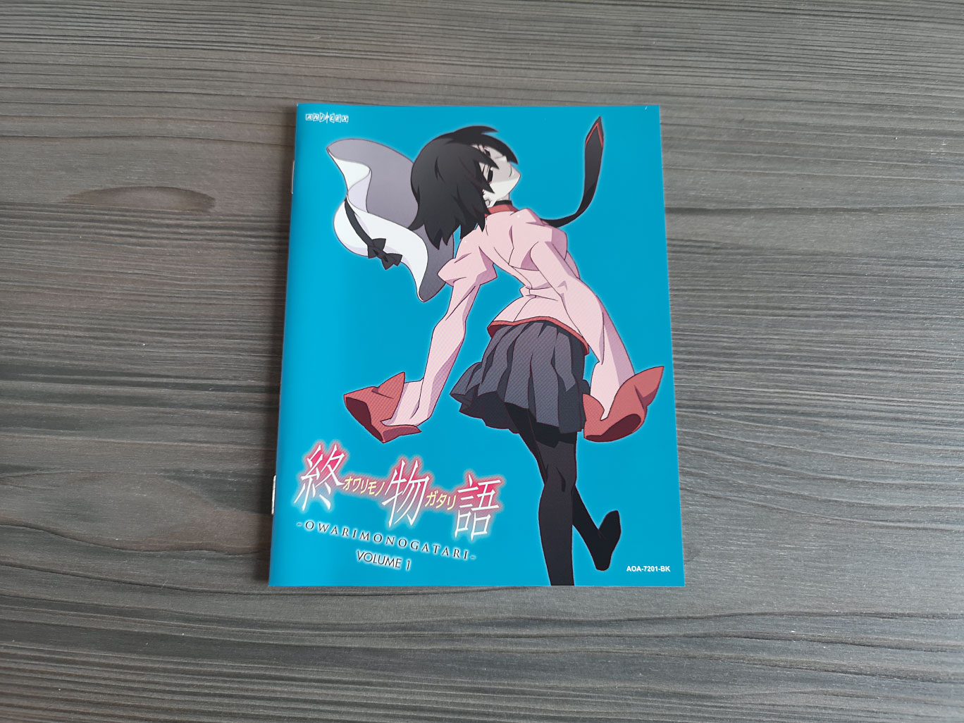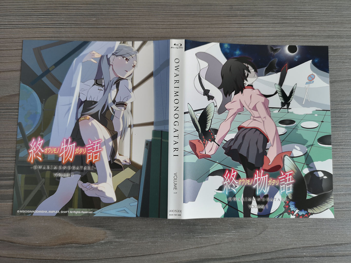 Aniplex of America released the Monogatari franchise in volume type sets that include a strong thick cardboard box with a Blu-ray Amaray case, a booklet and a set of cards. Owarimonogatari continues this trend. The Aniplex Proof of Purchase card is included with this package.