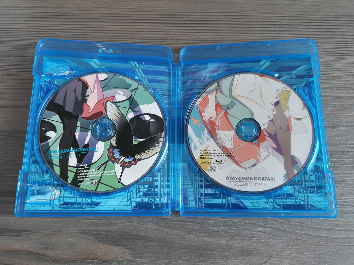 The limited edition release for Owarimonogatari Volume 1 contains episodes 1 to 7 across two Blu-ray discs, with Ougi Formula and Sodachi Riddle story arcs on the first disc and Sodachi Lost story arc on the second disc. The authoring and encoding were done by Aniplex.