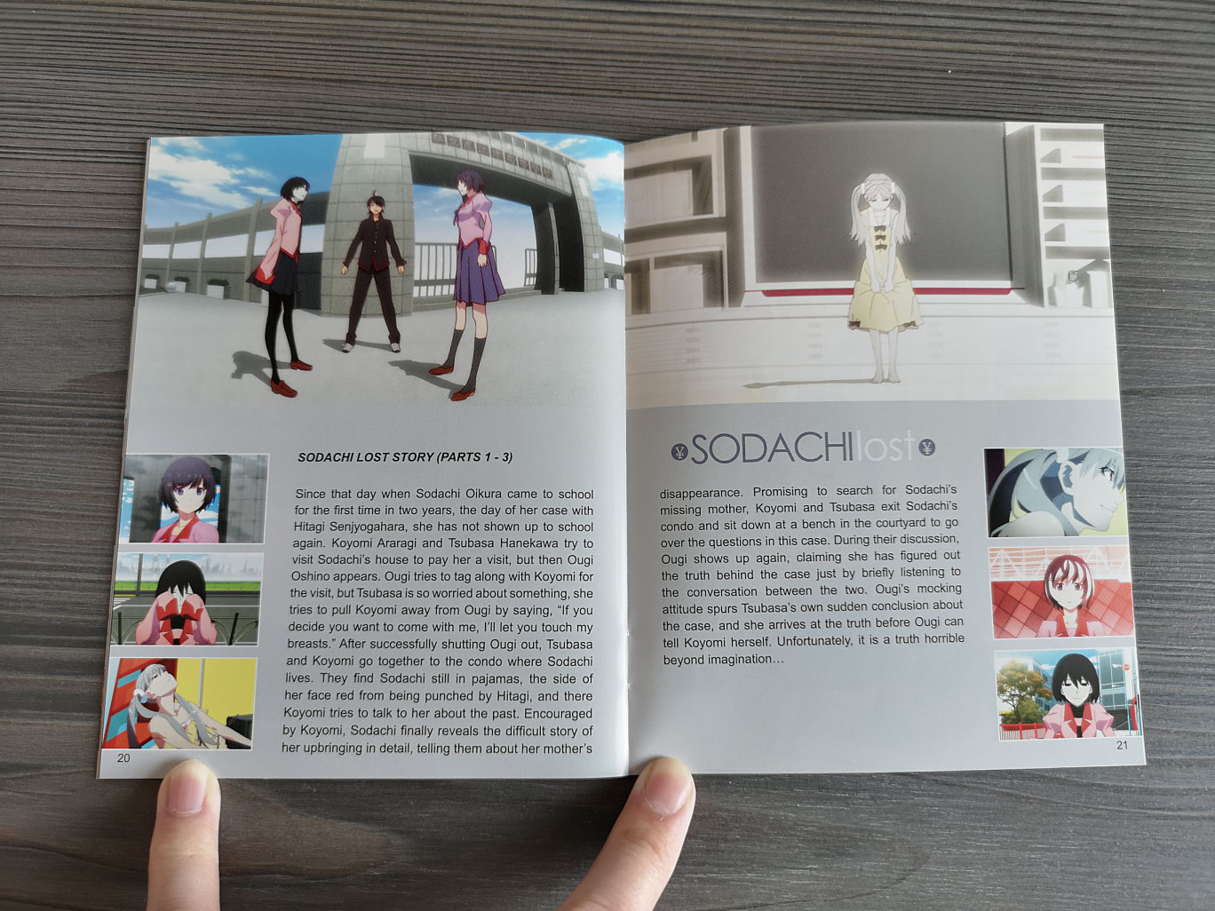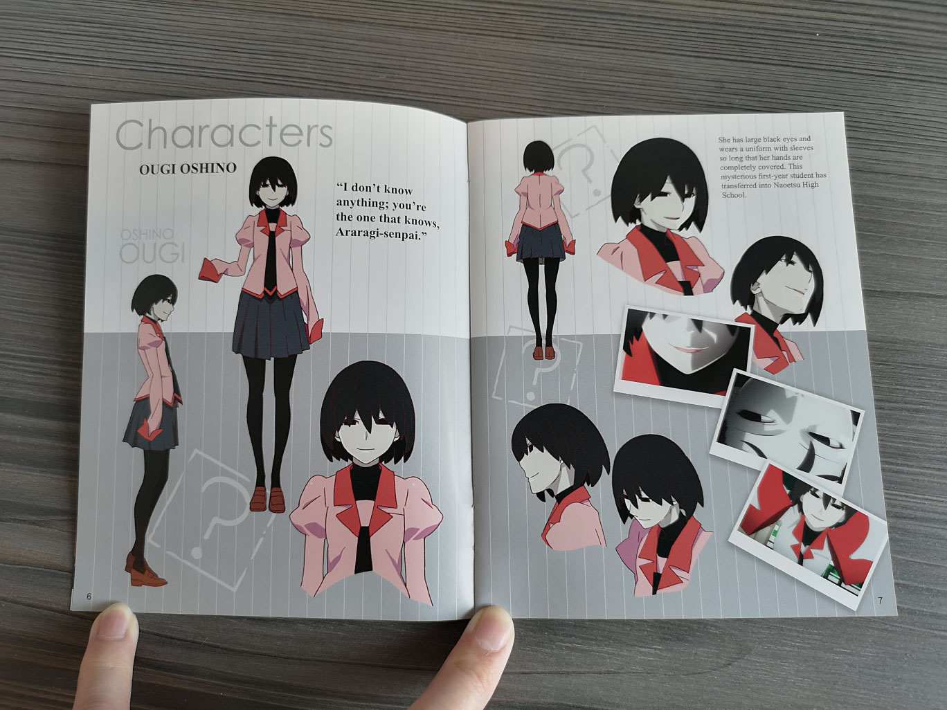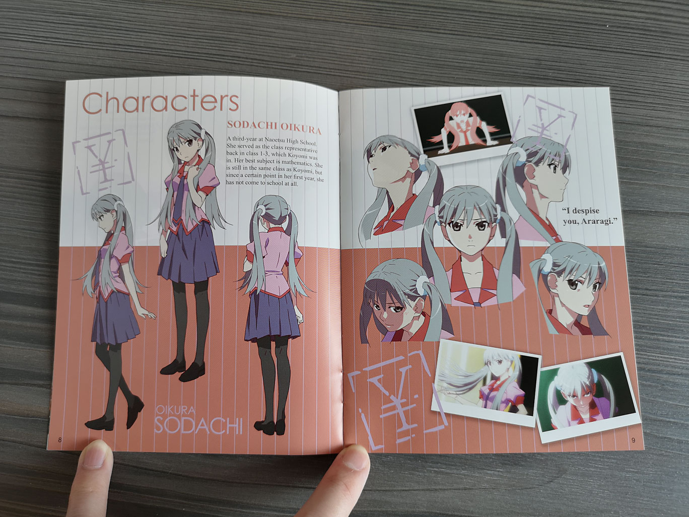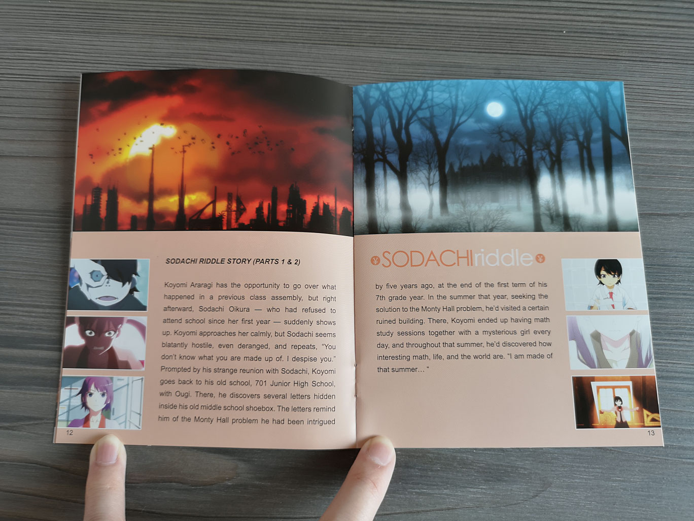 The first season of Owarimonogatari has been split across two volumes. Volume 1 adapts three story arcs from the 15th novel; Ougi Formula, Sodachi Riddle and Sodachi Lost. I won’t be mentioning any spoilers, however the plot synopsis and photos of the booklet below will have them.