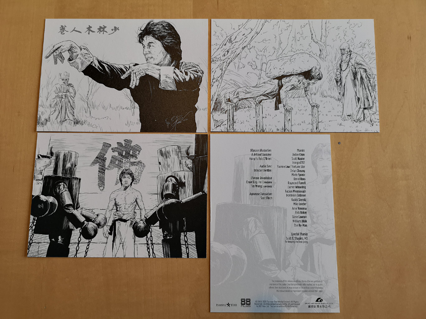 Shaolin Wooden Men comes with a slipcase, fold-out poster and art cards made exclusively for this release. This style is similar to 88 Films’ previous titles like Dragon Lord and Spiritual Kung Fu.