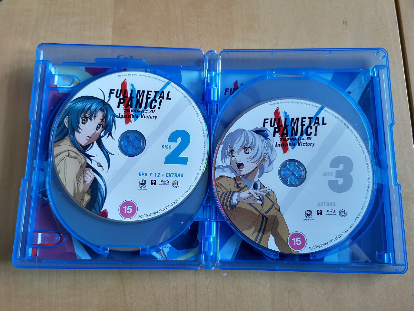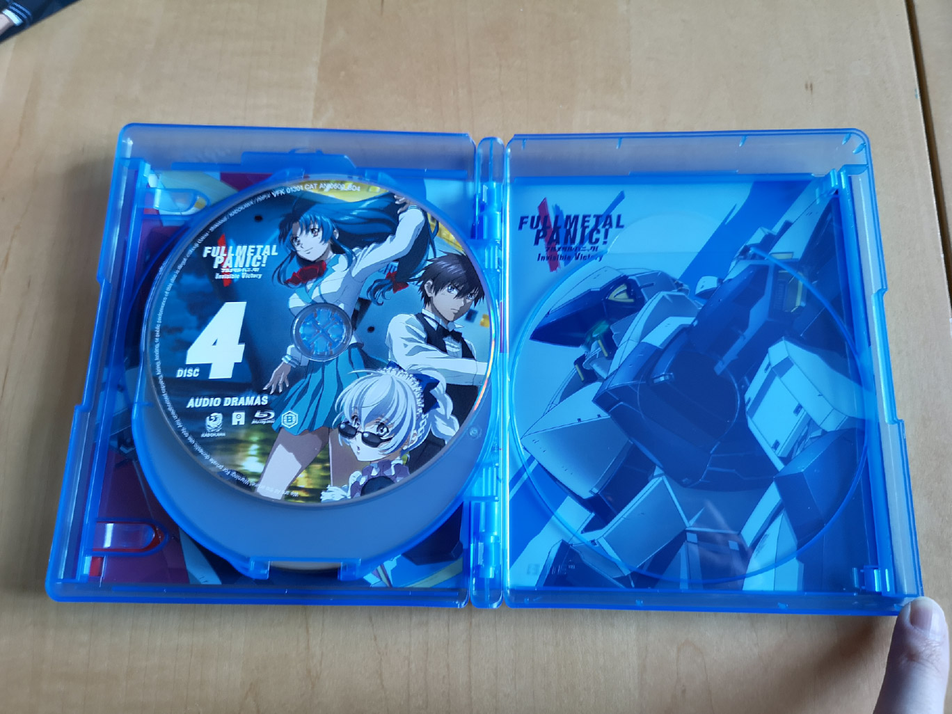 | Discs | Full Metal Panic! Invisible Victory: 3 (2 BD-50s, 1 BD-25) Full Metal Panic! Audio Dramas: 1 BD-25 |