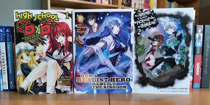 So the books I have chosen were the first volume of High School DxD which was just recently released, the third volume of How a Realist Hero Rebuilt the Kingdom, and the second volume of Is it Wrong to Try to Pick Up Girls in a Dungeon?. One of these was picked up during a Wordery sale and the rest were from other sites. There were stock issues and pricing issues so the selection was harder to sort out for this batch.