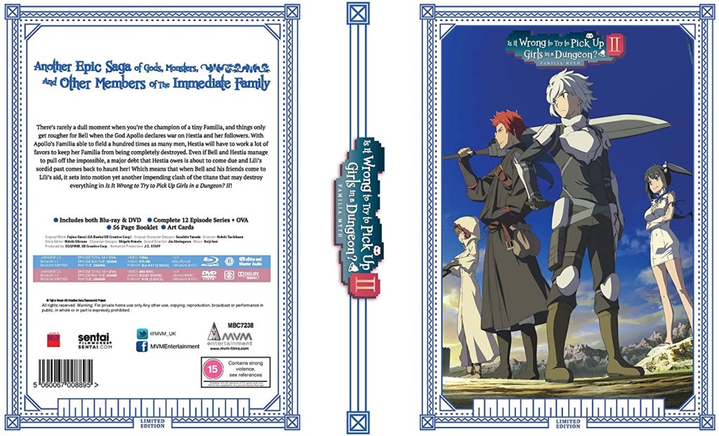 | Is it Wrong to Try to Pick Up Girls in a Dungeon? II £79.99 SRP / Collector’s Edition Blu-ray & DVD combo pack release £34.99 SRP / Regular DVD release English & Japanese audio with English subtitles Episodes 1-12 & OVA CE: Amazon: £59.99 / AOL: £55.99 / UP1: £55.49 DVD: Amazon: £25.99 / AOL: £24.49 / UP1: £24.09 |
