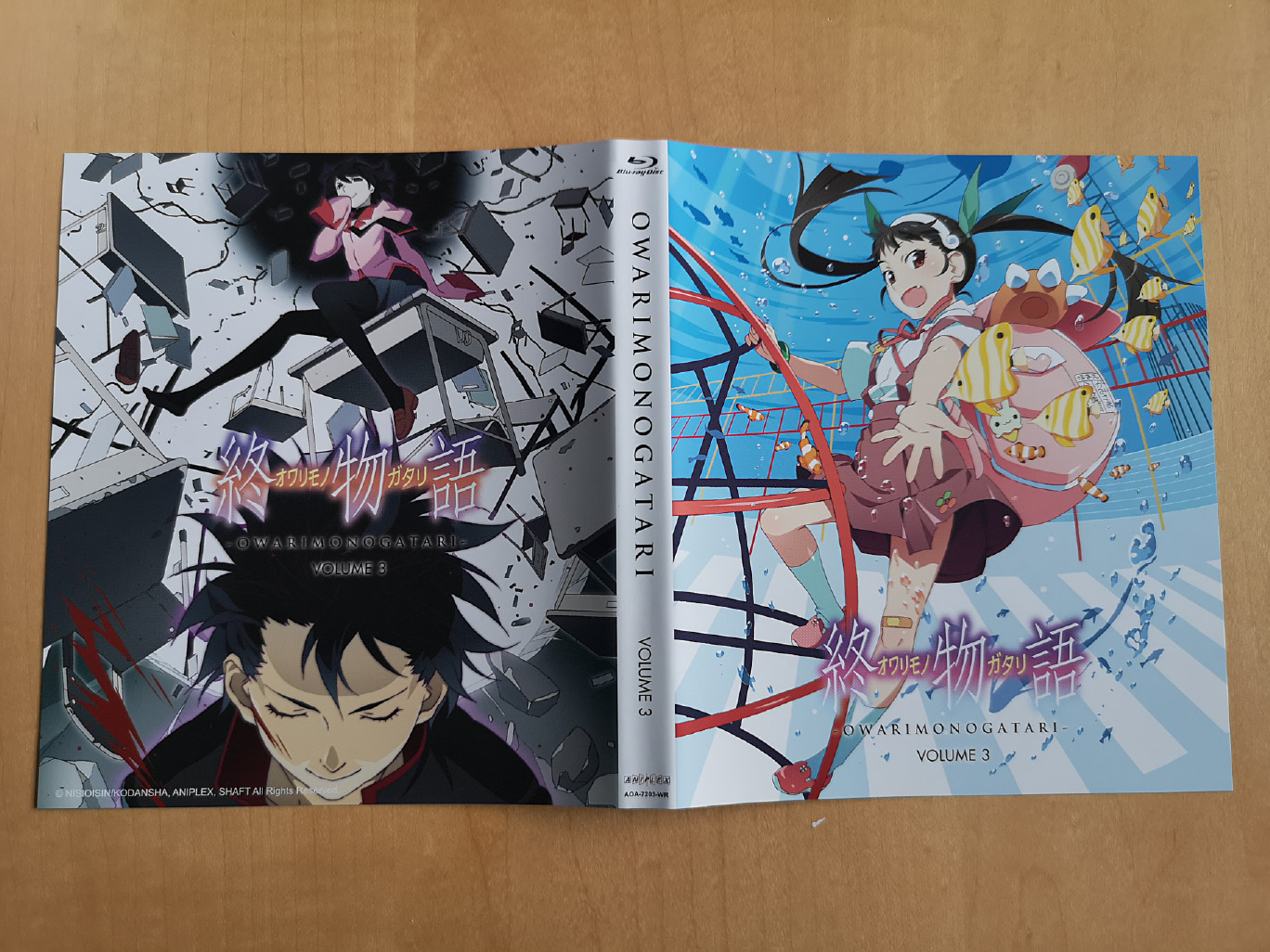Aniplex of America released the Monogatari franchise in volume type sets that include a strong thick cardboard box with a Blu-ray Amaray case, a booklet and a set of cards. Owarimonogatari Volume 3 continues this trend. The Aniplex Proof of Purchase card is included with this package.