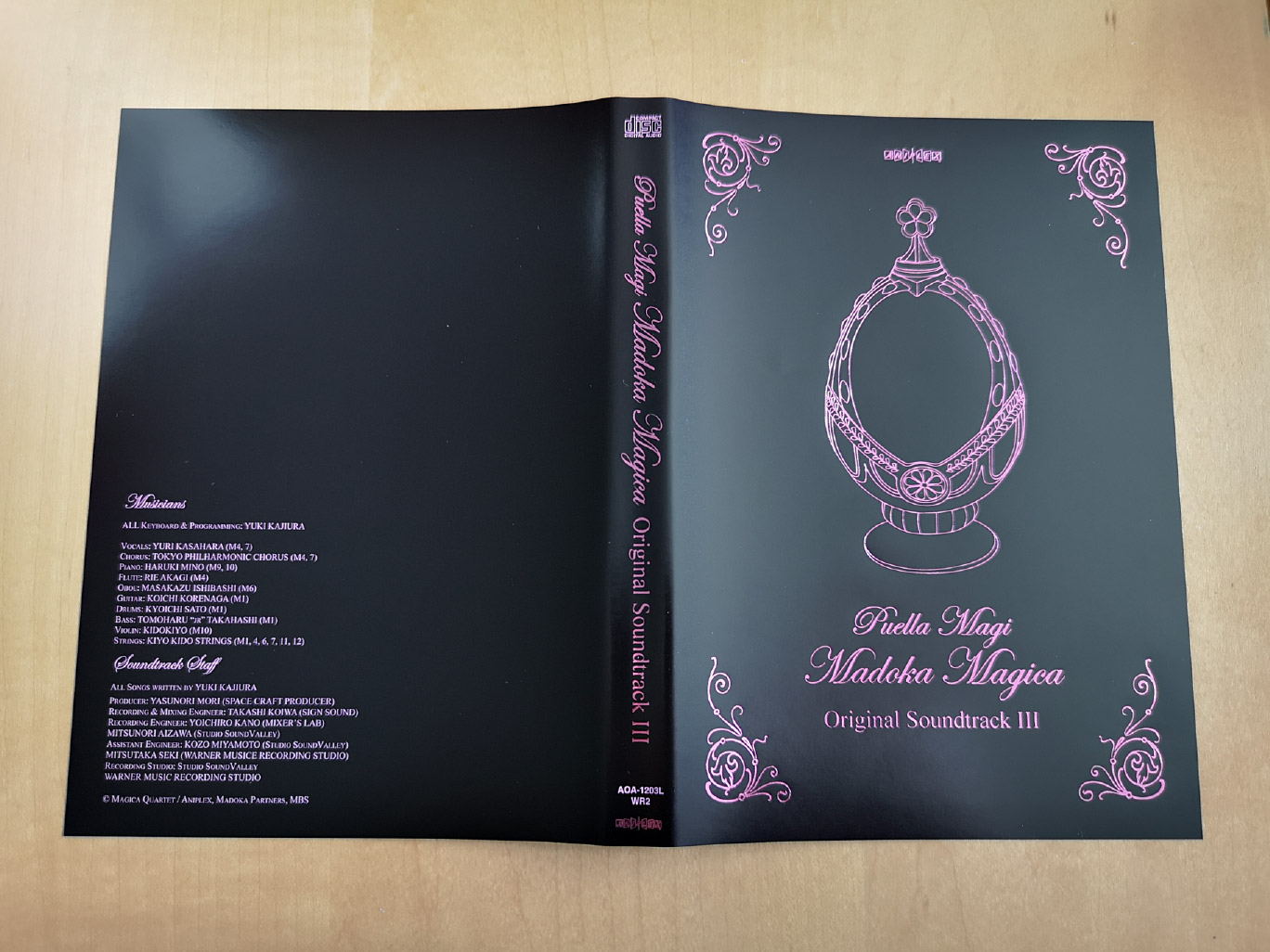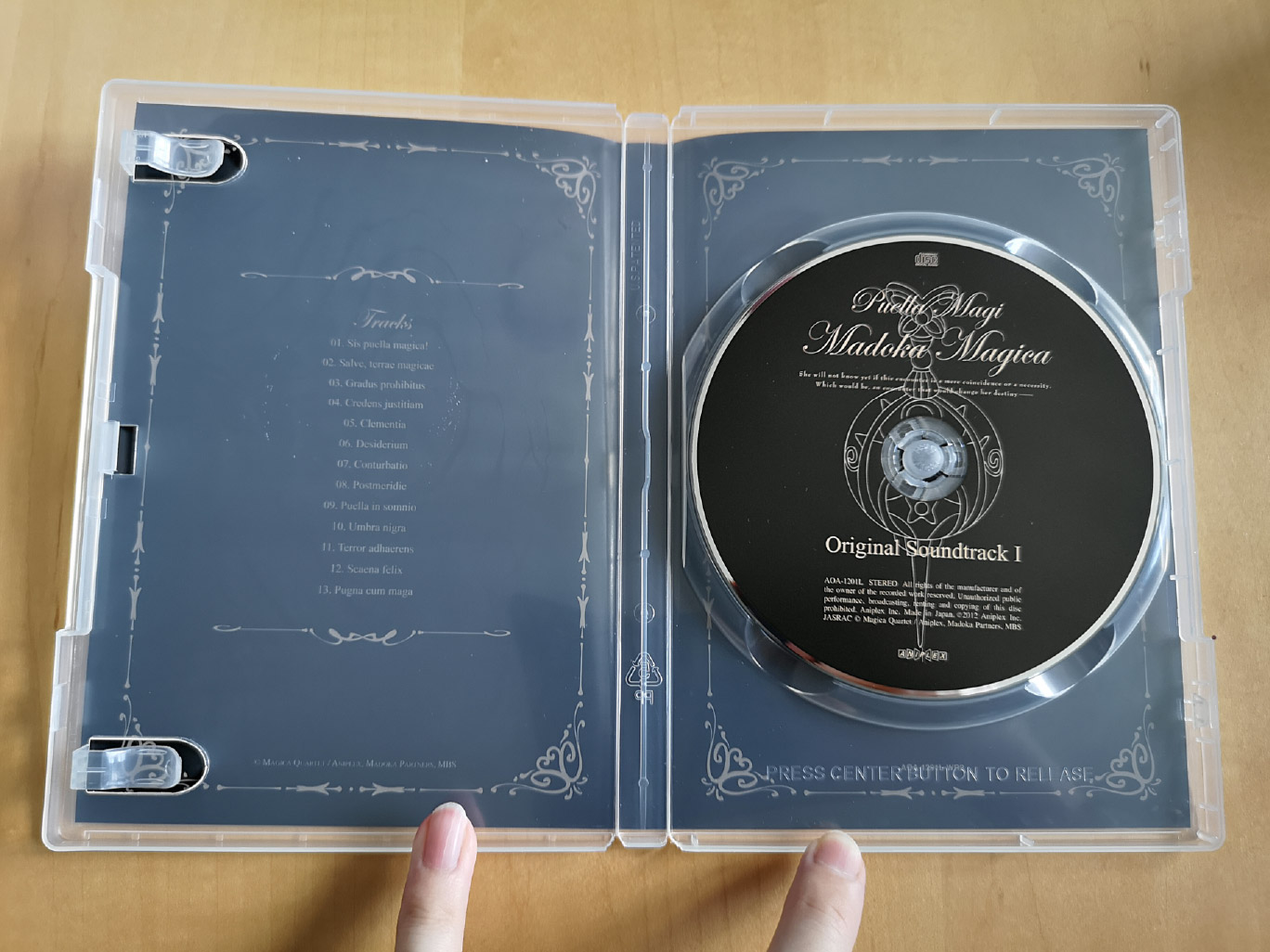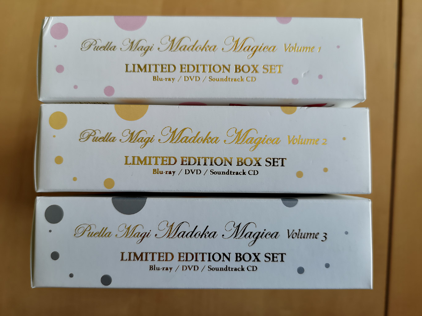 Puella Magi Madoka Magica was released in three parts with each having roughly the same amount of physical contents and packaging. For each volume you have a cardboard box (not rigid) with two DVD cases housing the discs; one case for the Blu-ray & DVD, and another for the Original Soundtrack CD composed by Yuki Kajiura.