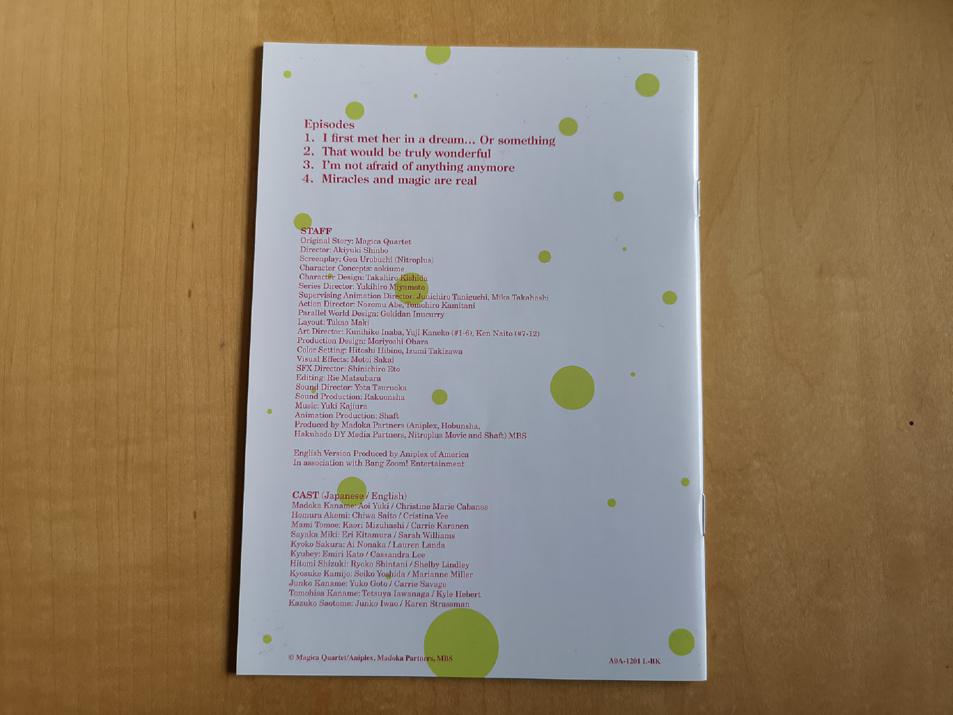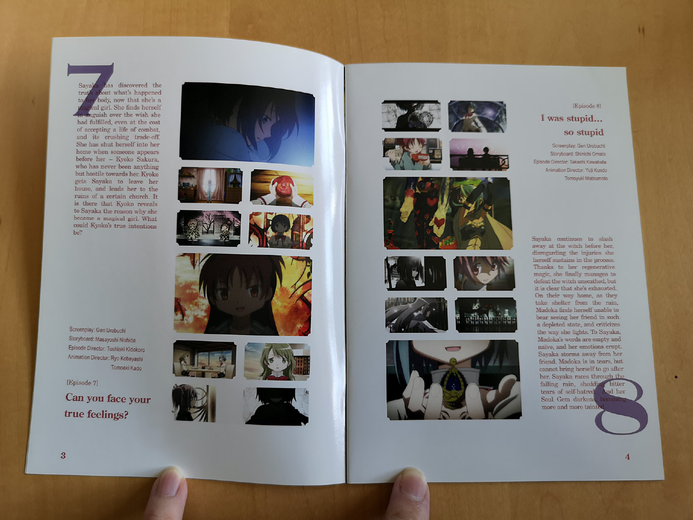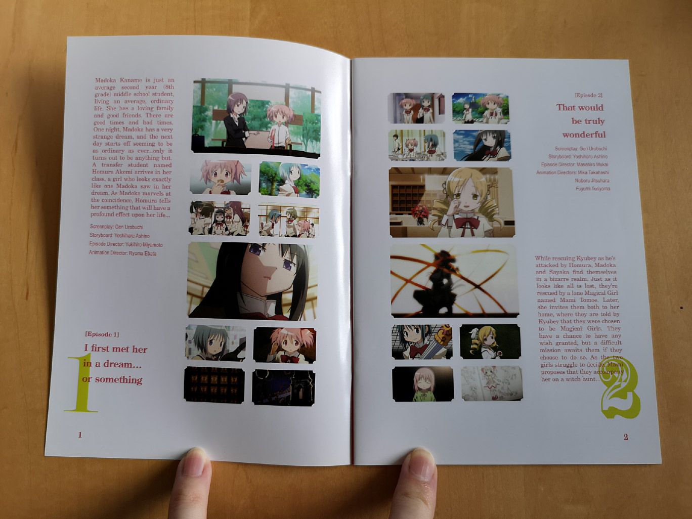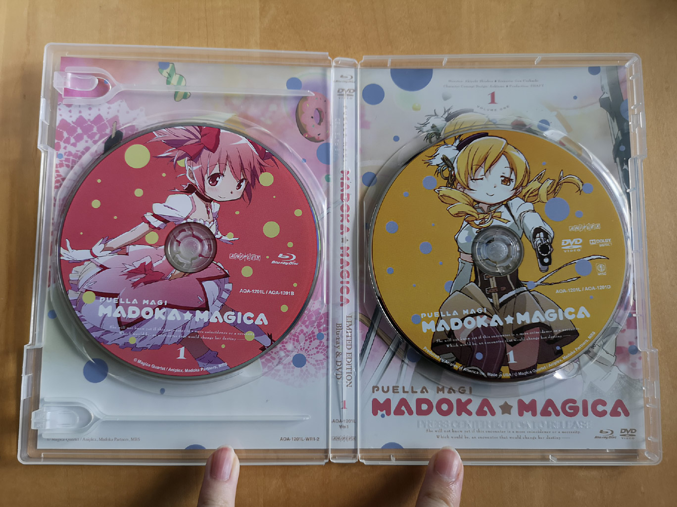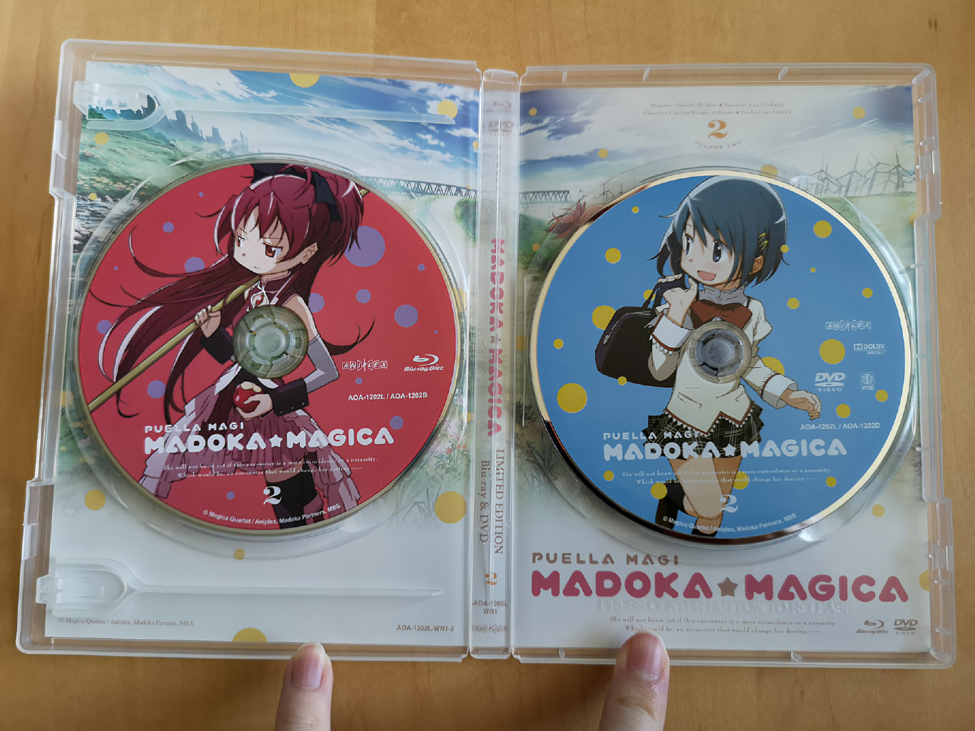 The limited edition releases for Puella Magi Madoka Magica was split across three volumes, and there’s some slight tweaks between them. Volume 1 contains episodes 1-4 across a single Blu-ray and DVD disc, Volume 2 contains episodes 5-8 across a single Blu-ray and DVD disc, and Volume 3 contains episodes 9-12 across a single Blu-ray and DVD disc.