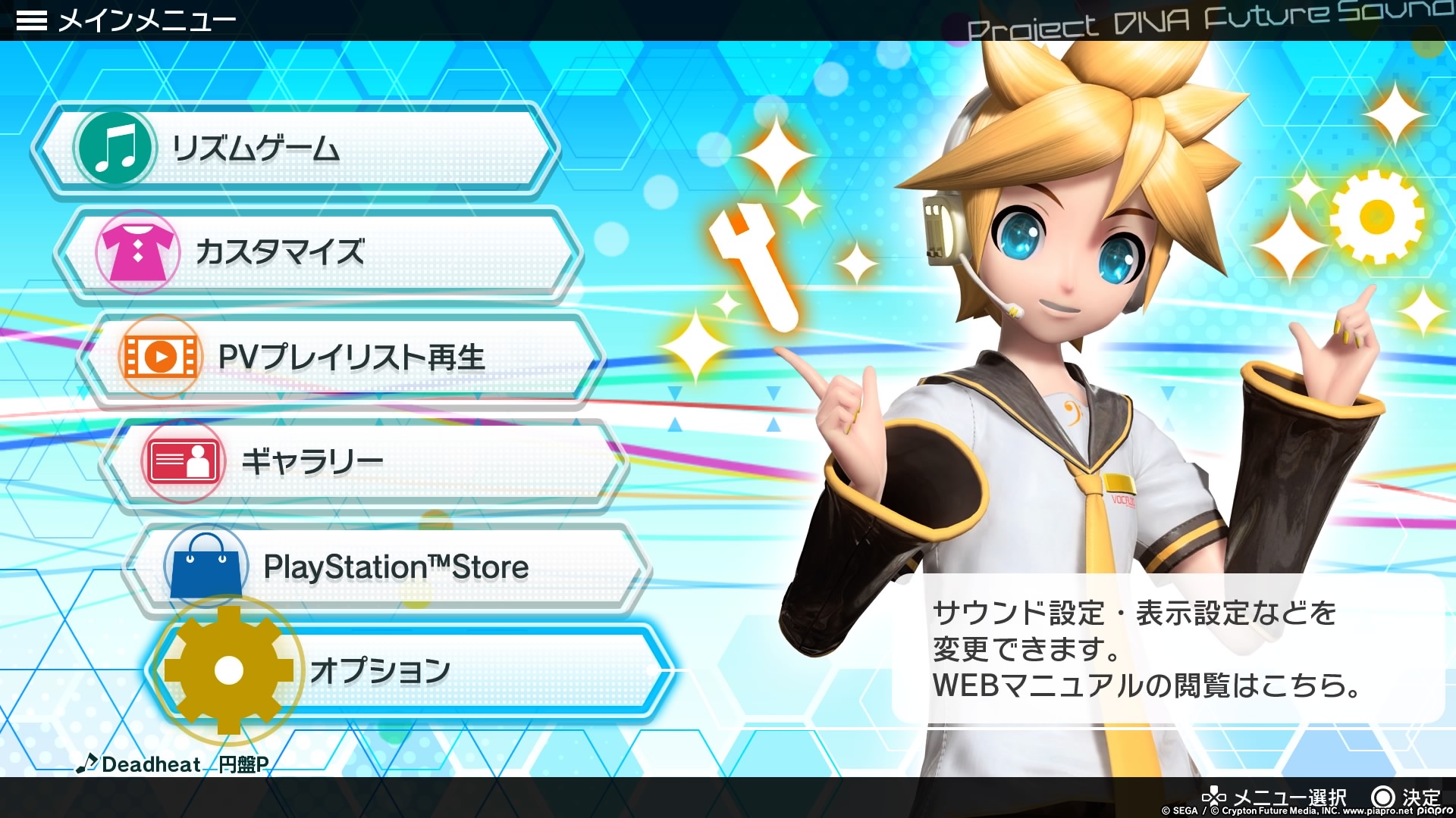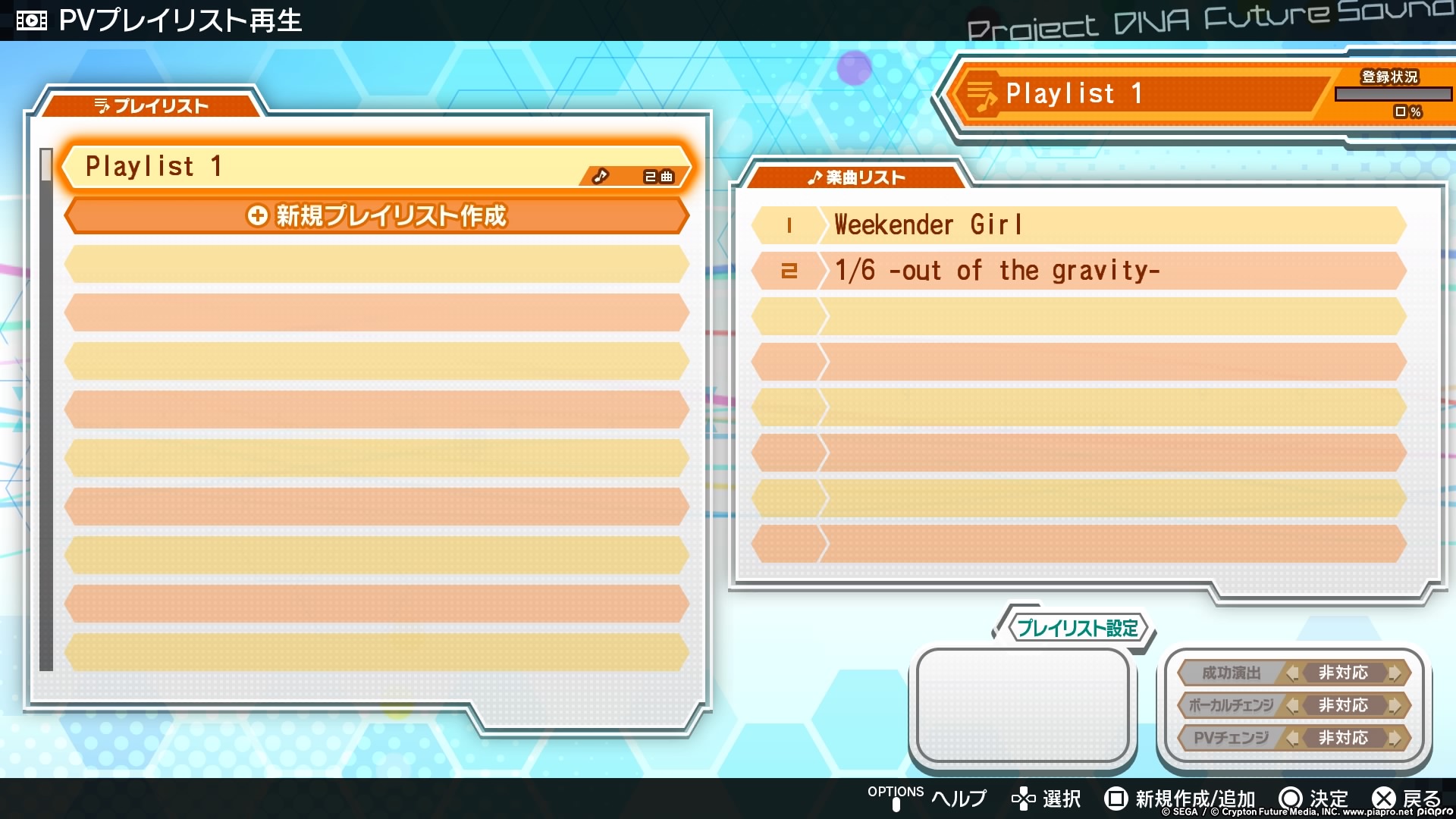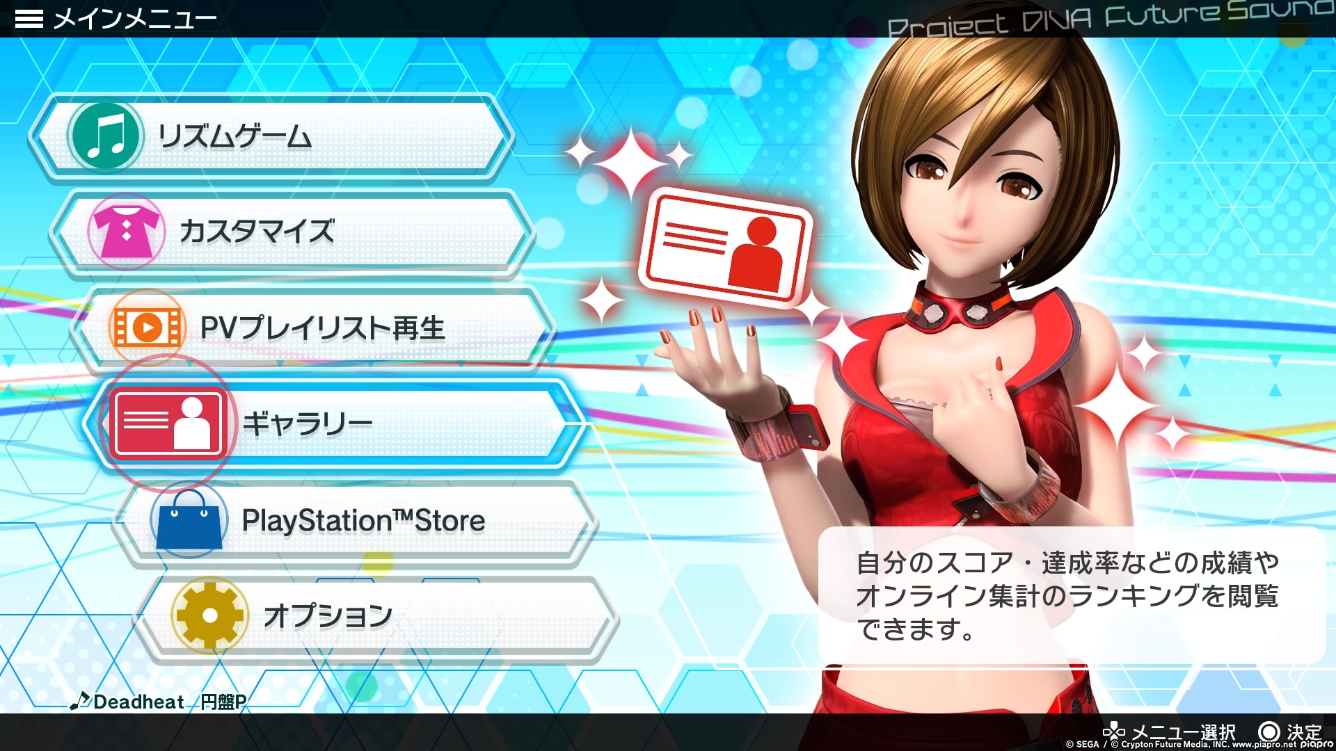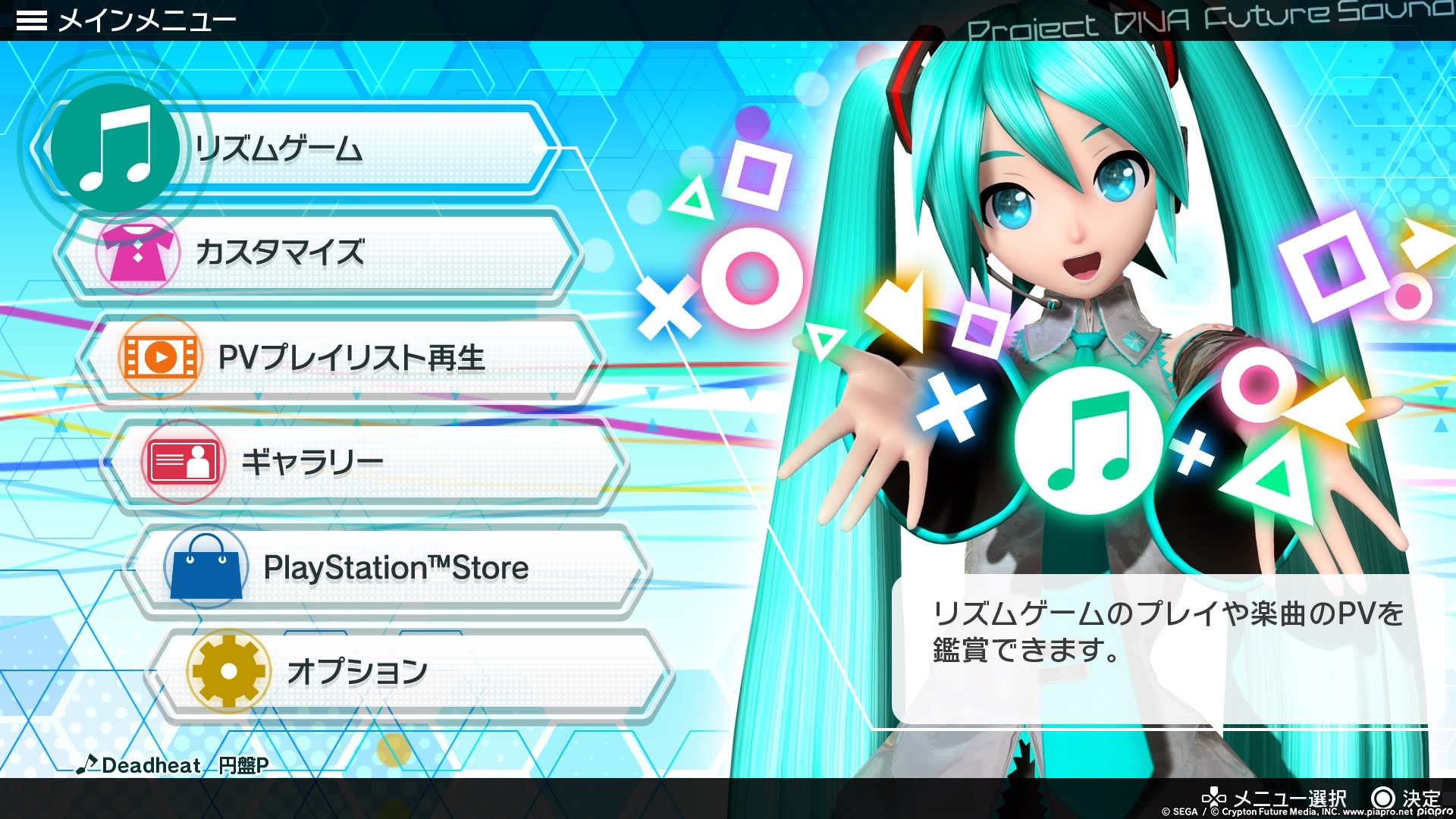 The Project DIVA games are pretty simple to understand if you were importing the Japanese versions. The main menus are split between the song list and a few options. There’s no story mode whatsoever. The top option covers the Setlist that allows you to choose a song to play, the second option is for customising your vocaloid’s costumes, the third option is viewing a playlist of Music Videos for specific songs, the fourth option is a record of the game’s progression, the fifth option is the PlayStation Store to download extra content (though if you’re like me who’s using a UK account on a Japanese copy, you’ll have to manually go to the Japanese store to download and access the content due to regional differences), and the fifth option is the options/settings.