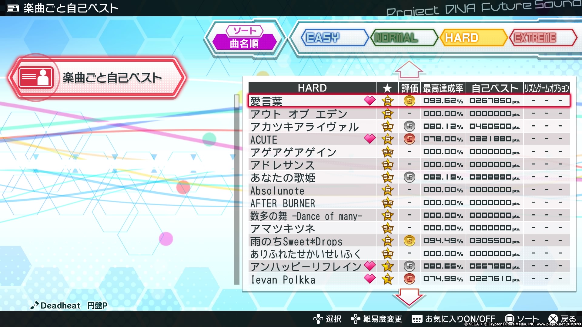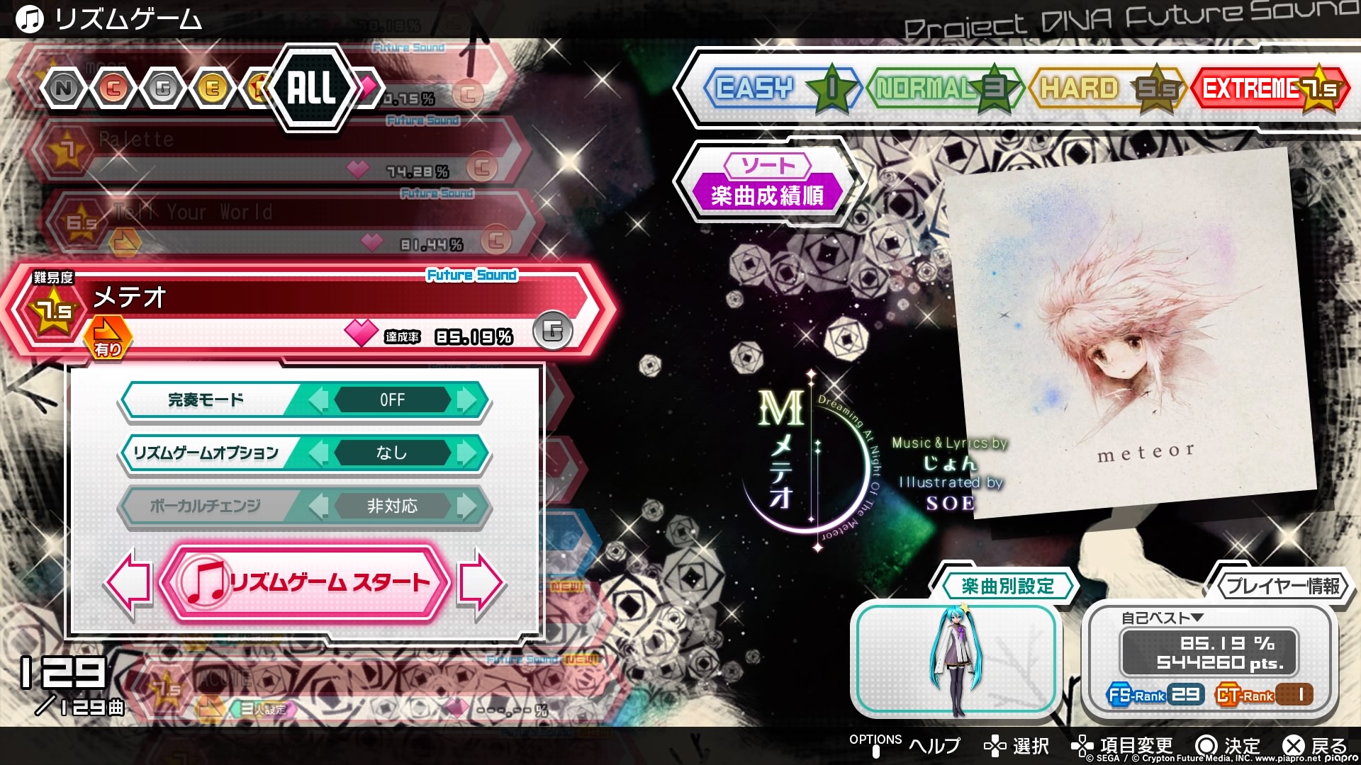 In the game’s setlist menu, you will be able to view all of the songs that are available in the game. You can change the order of the list between name, difficulty (stars), and vocaloid artist using Square, while L1 & R1 can change the options of the sort (from Easy to Extreme for instance). You can also press the touch button to favourite the song. The difficulty of the song is shown by the star on the left side of the song option, and when you finish a song, a small percentage will be displayed on the bottom right part of the song option which can go as high as over 100% sometimes. The right side of the song option will also display the rank you achieved. Pressing Triangle on any song will bring up the customisation menu where you can change which character or module you want to use for that particular song.