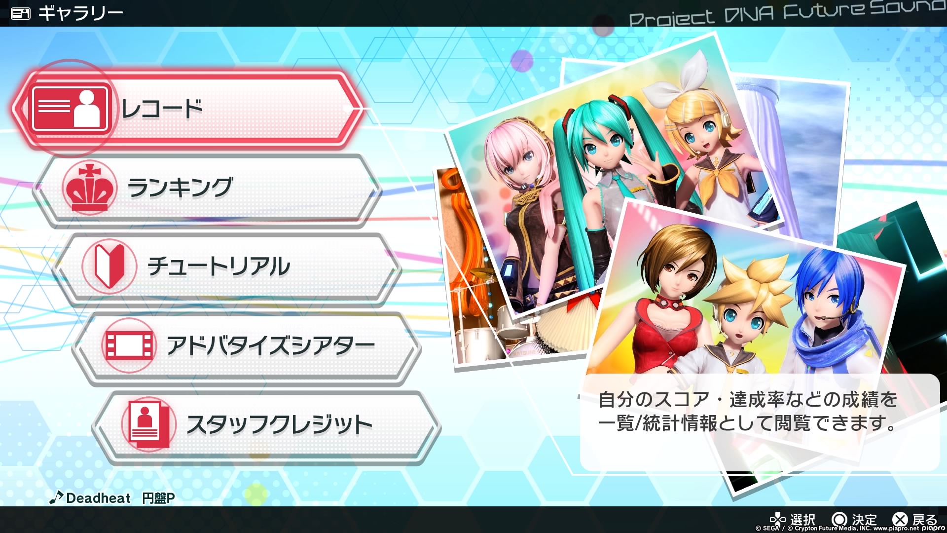 In the record menu you have five options. The first option covers the records of your progress such as high scores, which is split into three different sub-options but the general idea is the same between each. The second option is for online rankings which is split into different sub-options as well, between overall song list rankings, Future Sound rankings, Colorful Tone rankings, Survival Course rankings and Share Score Data. The third option is the game’s tutorial, the fourth option is the opening sequences for the Project DIVA Arcade game, and the fifth option is the game’s credits.