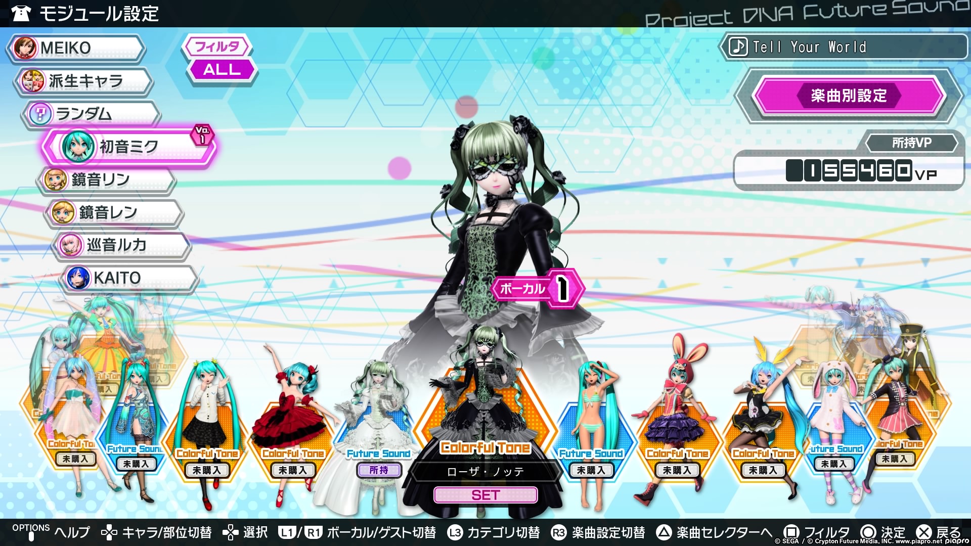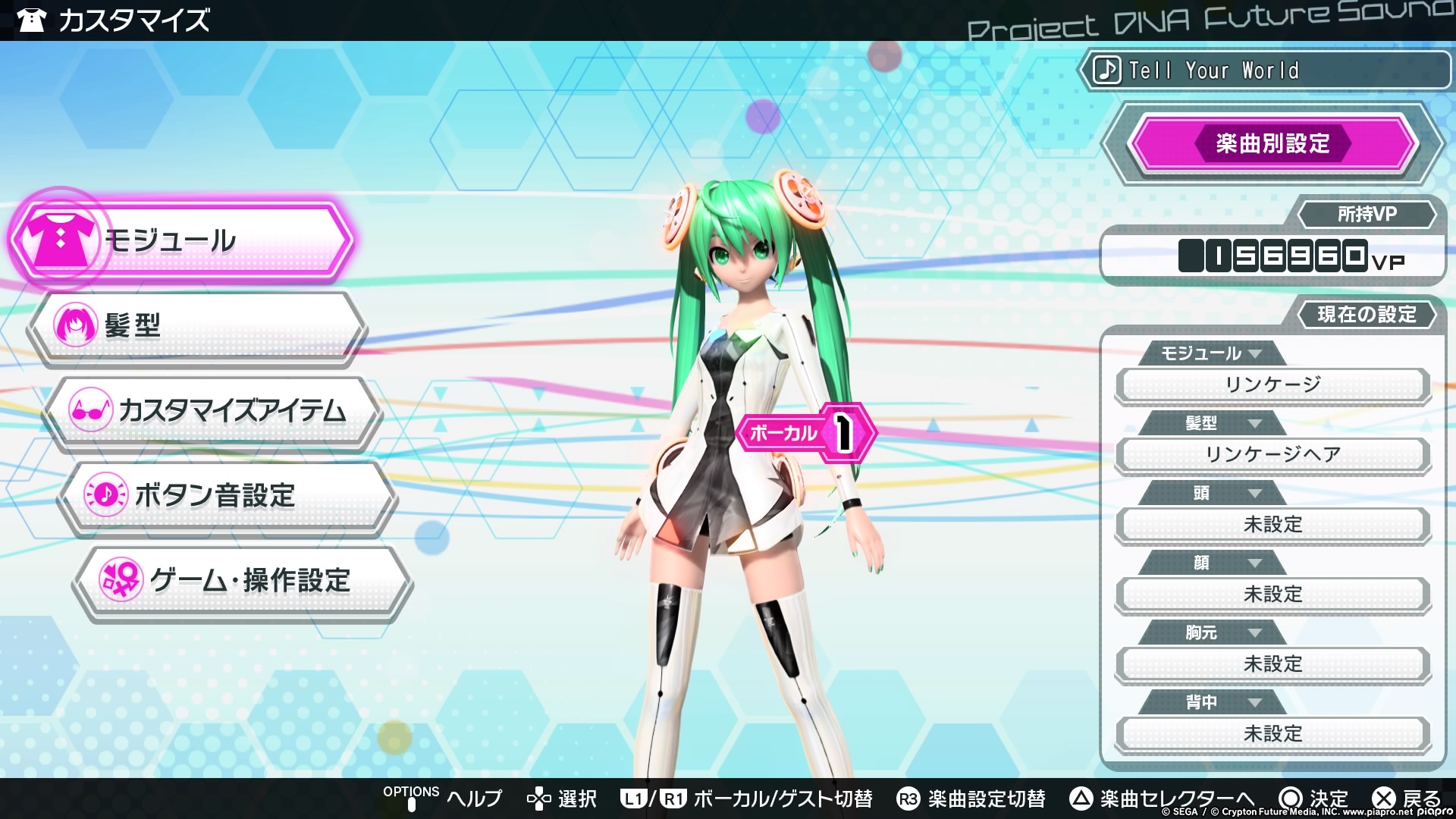 In the customise menu you can change the modules of the vocaloids. The first option covers the modules themselves which are basically costumes from each song, and you can sort it by different characters. The second and third options cover the add-ons for the characters like hats and hairstyles which can also be accessed in the modules section. The fourth option is the sound customisation for the button presses and slides, and the fifth option is the button customisation.