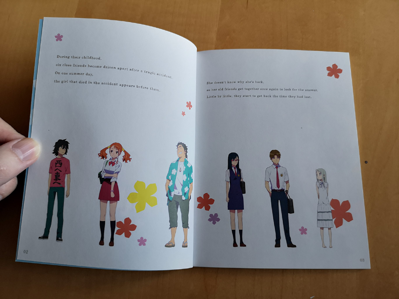 “Jinta Yadomi and his group of childhood friends had become estranged after a tragic incident split them apart. Now in their high school years, an unexpected surprise forces each of them to confront their guilt over what happened that day. They must overcome the burdens of their past, and come to terms with years of shame, hard feelings, and heartaches.”