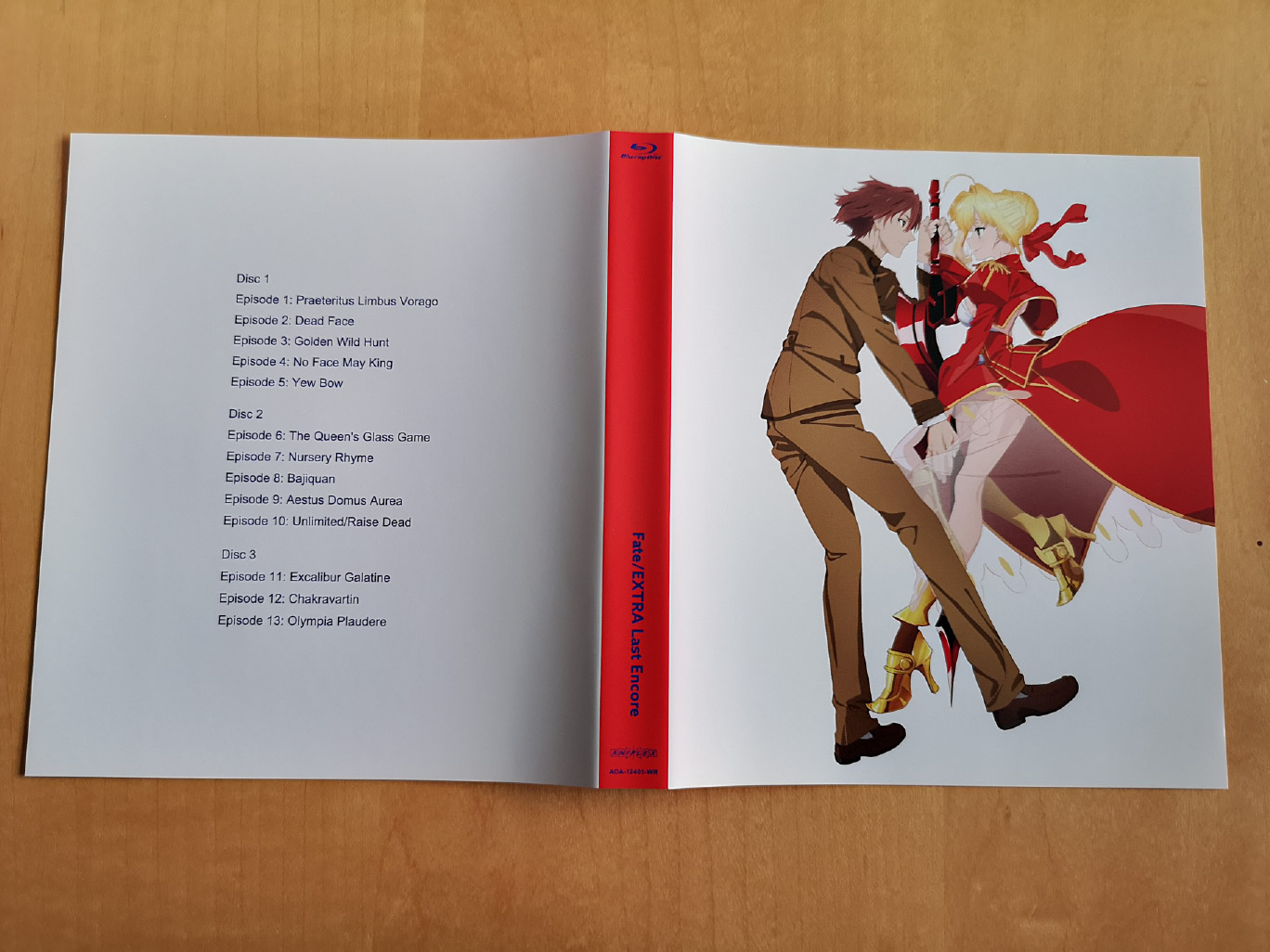 The Aniplex Blu-ray releases for Fate/EXTRA Last Encore contains episodes 1-13 across three Blu-ray discs, which were authored/encoded by Aniplex. The first two discs cover Oblitus Copernican Theory while the third disc covers Illustrias Geocentric Theory. The audio options available for the Aniplex of America release include Japanese with English subtitles and a Bang Zoom! Entertainment English dub.