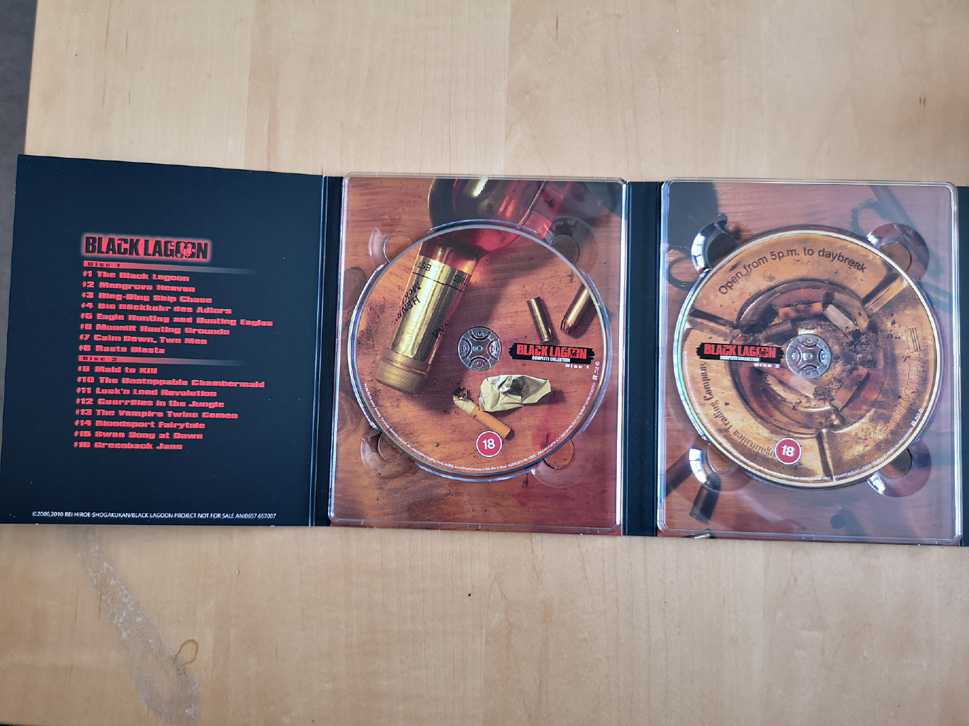 The limited edition release for Black Lagoon contains all 12 episodes for The First Barrage and all 12 episodes for The Second Barrage across three Blu-ray discs, alongside all 5 OVA episodes for Roberta’s Blood Trail on a single Blu-ray disc. All the discs were authored and encoded by Funimation.