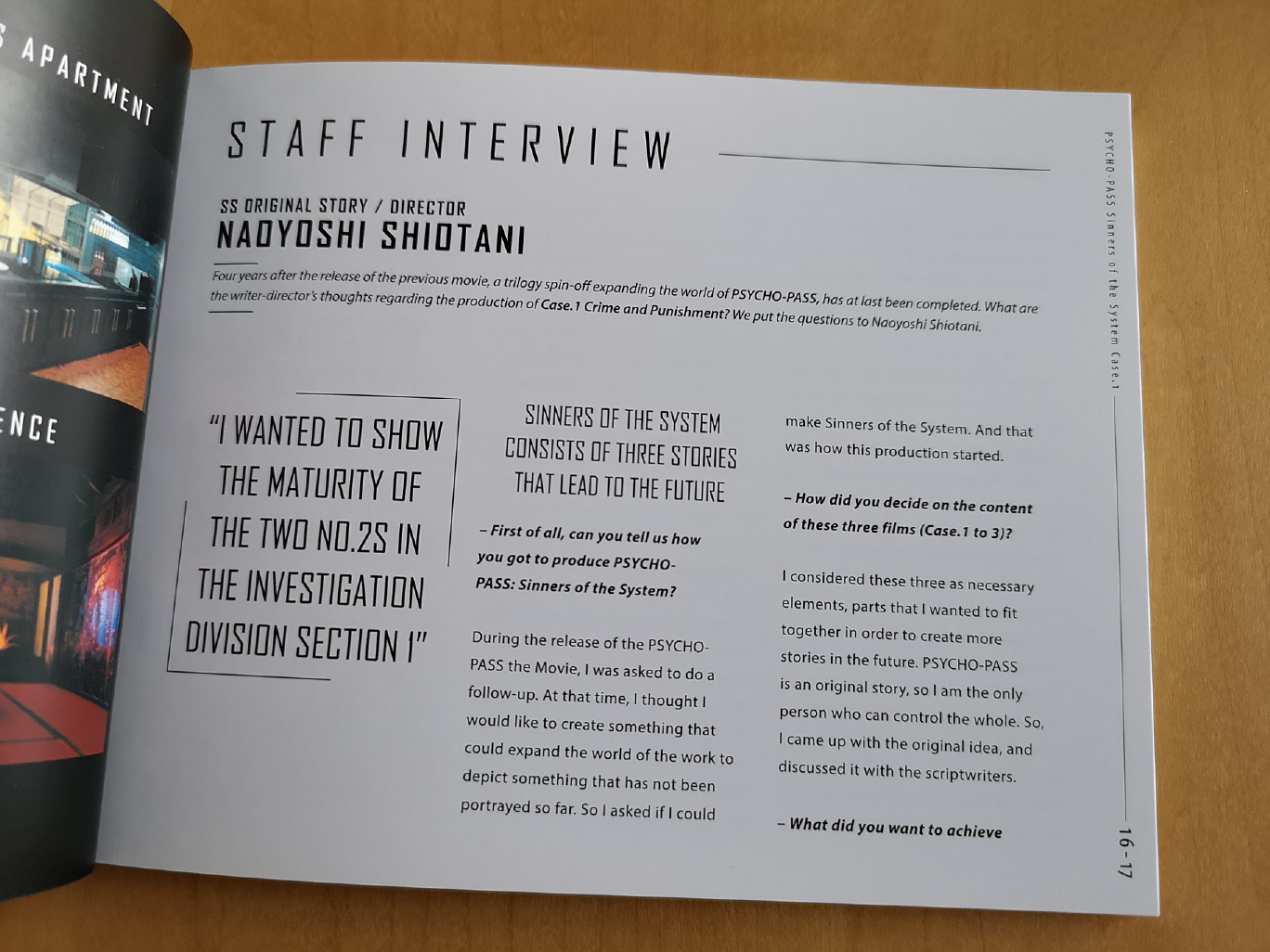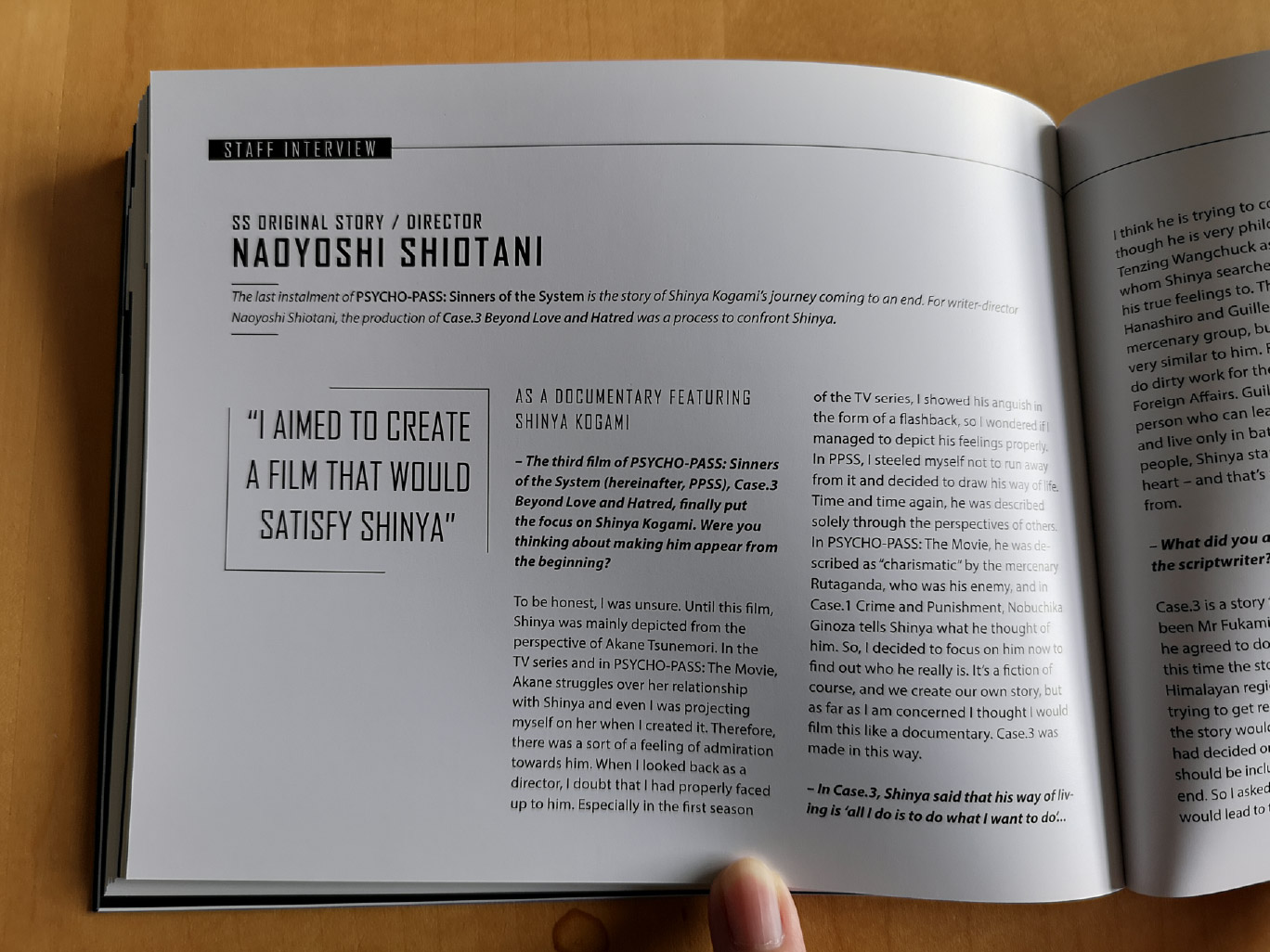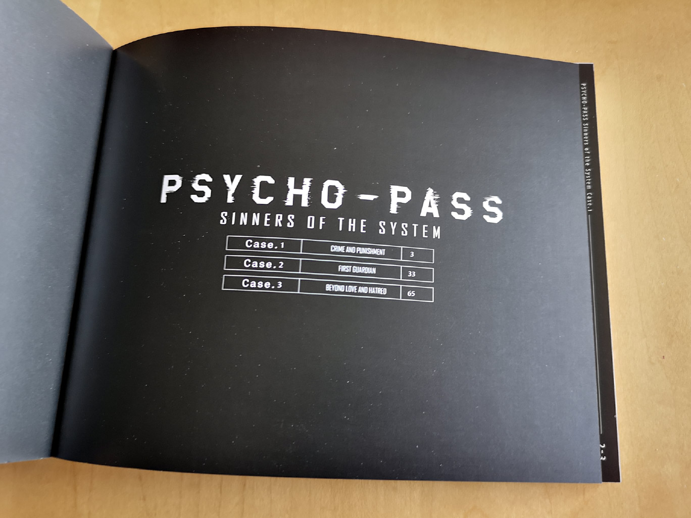 Psycho-Pass: Sinners of the System (サイコパス SS), also known as Psycho-Pass SS, is a 2019 original theatrical anime film series by studio Production I.G. The staff credits include director Naoyoshi Shiotani, screenplay writer Ryō Yoshigami for Case 1 and Makoto Fukami for Cases 2 & 3, character designer Hisashi Abe and music composer Yugo Kanno, and the films was theatrically released in Japanese theaters in January & February 2019.