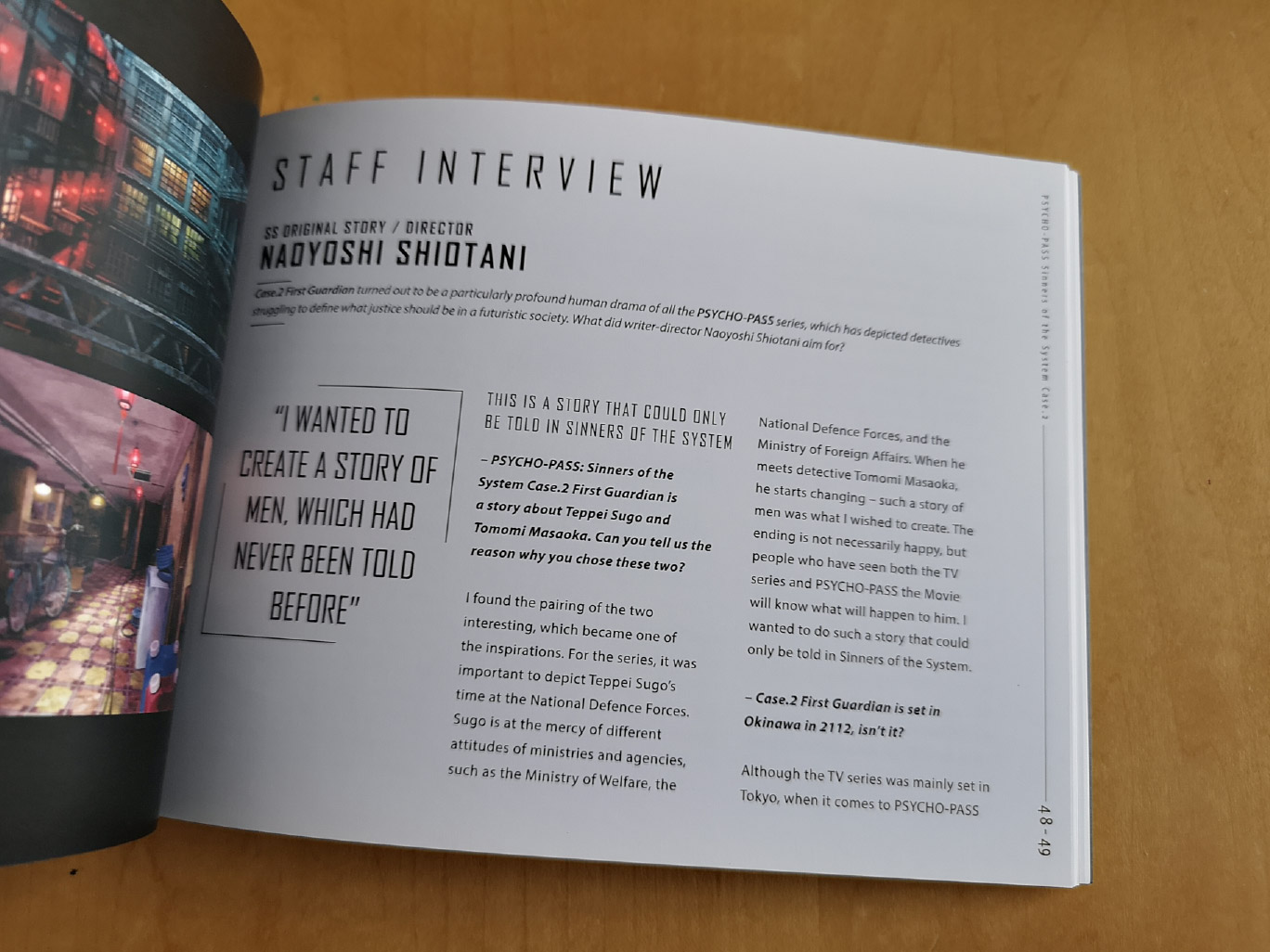 “In the winter of 2117, a runaway vehicle crashes into the the Public Safety Bureau Building. The driver is identified as Izumi Yasaka, a psychological counsellor at the Sanctuary, a Latent Criminal Isolation Facility in Aomori Prefecture. But right before her interrogation, Enforcer Mika Shimotsuki and Inspector Nobuchika Ginoza are tasked with promptly escorting Yasaka back to Aomori. What awaits them there is a false Paradise.”Case 2: First Guardian