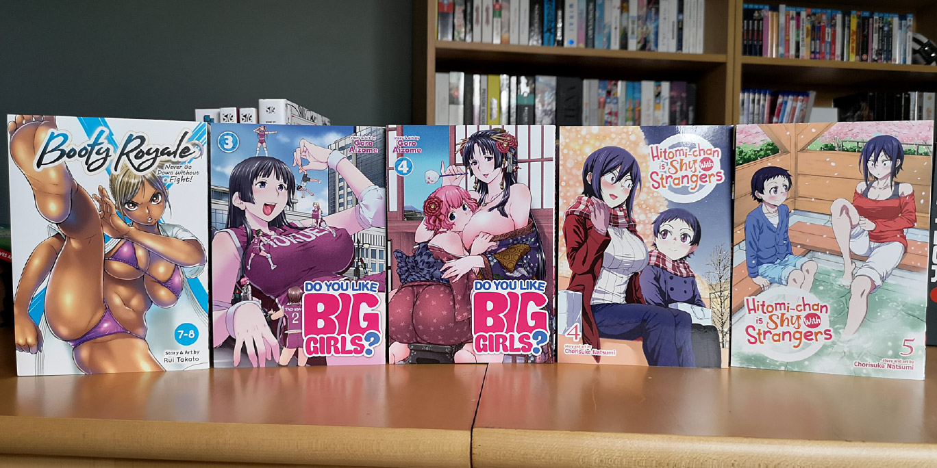 The choice to focus on Seven Seas is due to these volumes being available for a pretty decent range and were available to ship together. We have Booty Royale: Never Go Down Without a Fight! Omnibus 4 (covers Volumes 7 & 8), Do You Like Big Girls? Volumes 3 & 4, and Hitomi-chan is Shy with Strangers Volumes 4 & 5. DYLBG Volume 3 arrived on Wednesday due to timing delays. These are mostly up to date on the English releases, and I say that because the next volume is out pretty soon for the latter two titles.