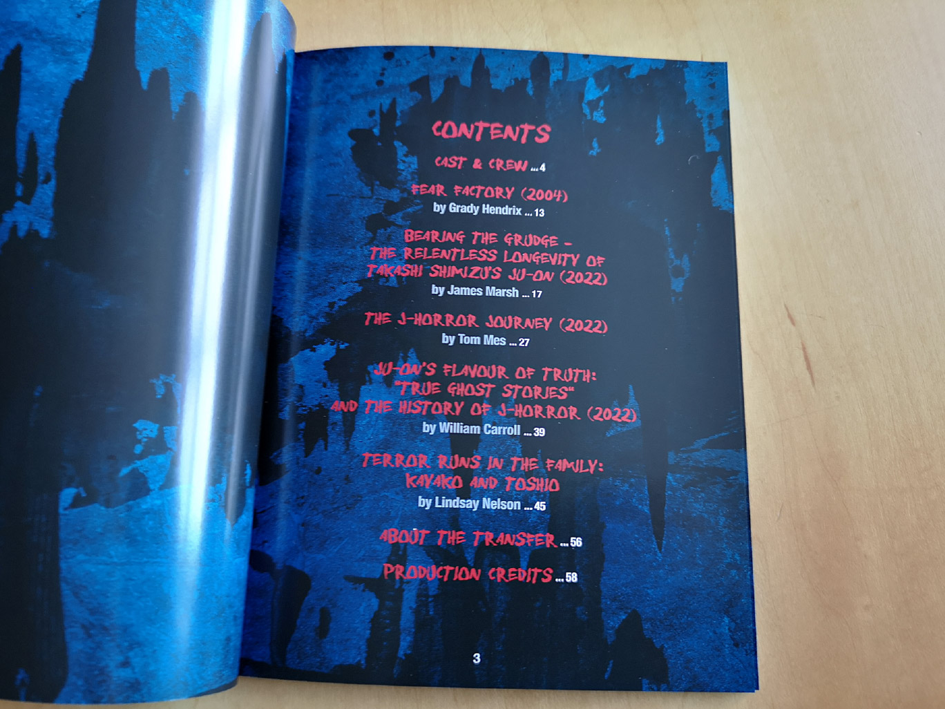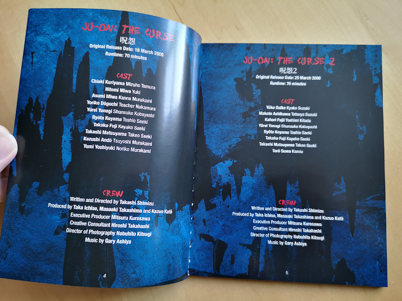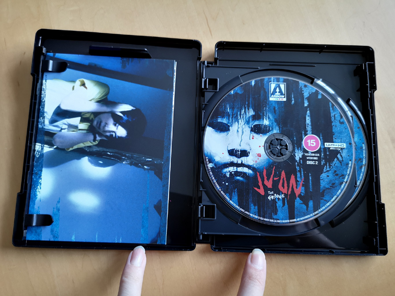 The rigid box set includes three Blu-ray Amaray case and one 4K Ultra HD Amaray case. The UHD case houses both the 4K Ultra HD and Blu-ray discs for Ju-On: The Grudge, while the Amaray cases house the Blu-ray discs for the other films. All four cases house a set of art cards as well. Also included inside the box is a booklet and fold-out poster. The booklet features essays written by Grady Hendrix, James Marsh, Tom Mes, William Carroll and Lindsay Nelson.