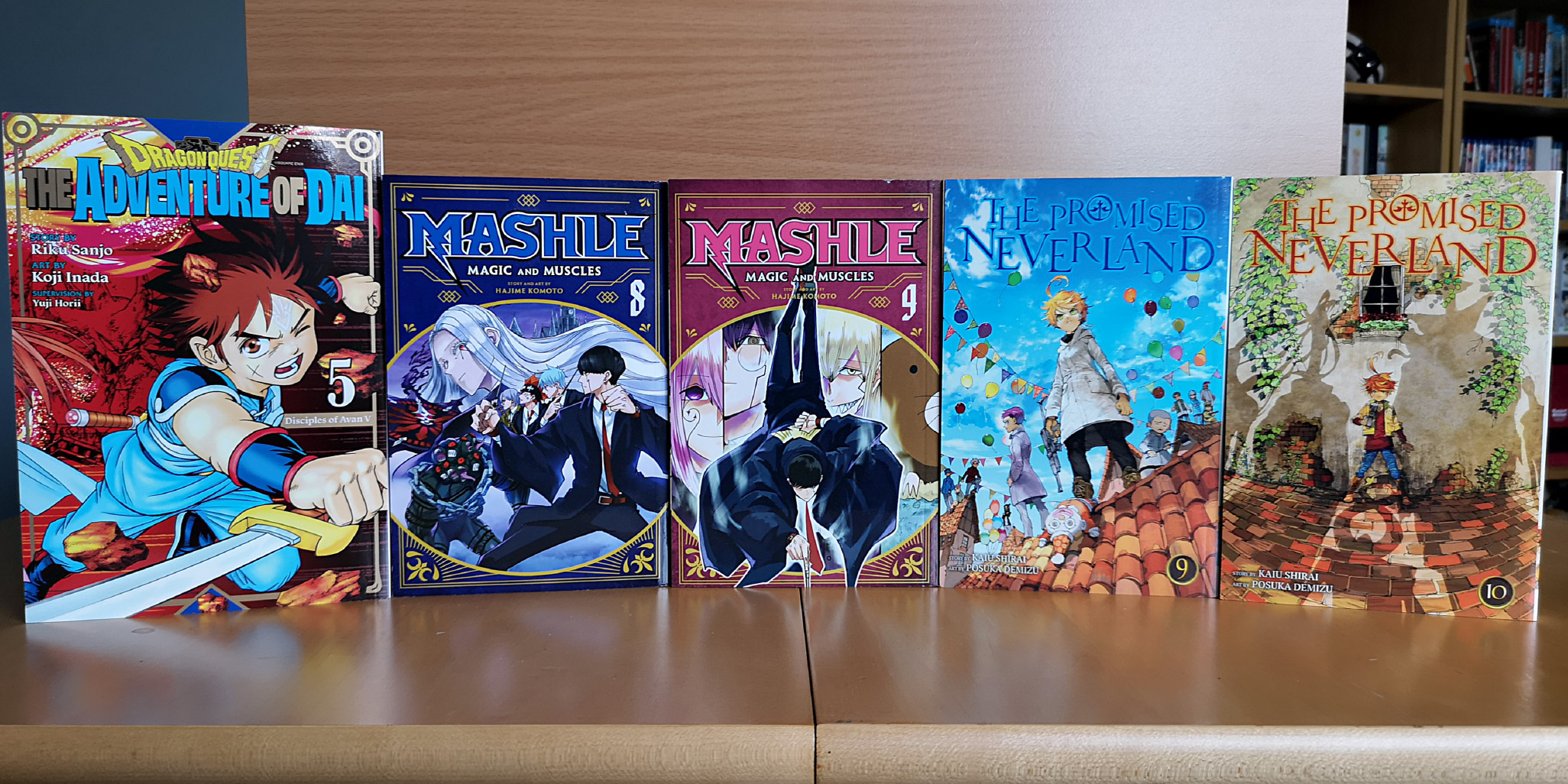 The titles I chose were Dragon Quest: The Adventure of Dai Volume 5, Mashle: Magic & Muscles Volumes 8 & 9, One Punch Man Volumes 7, 8, 9 & 10, and The Promised Neverland Volumes 9 & 10.