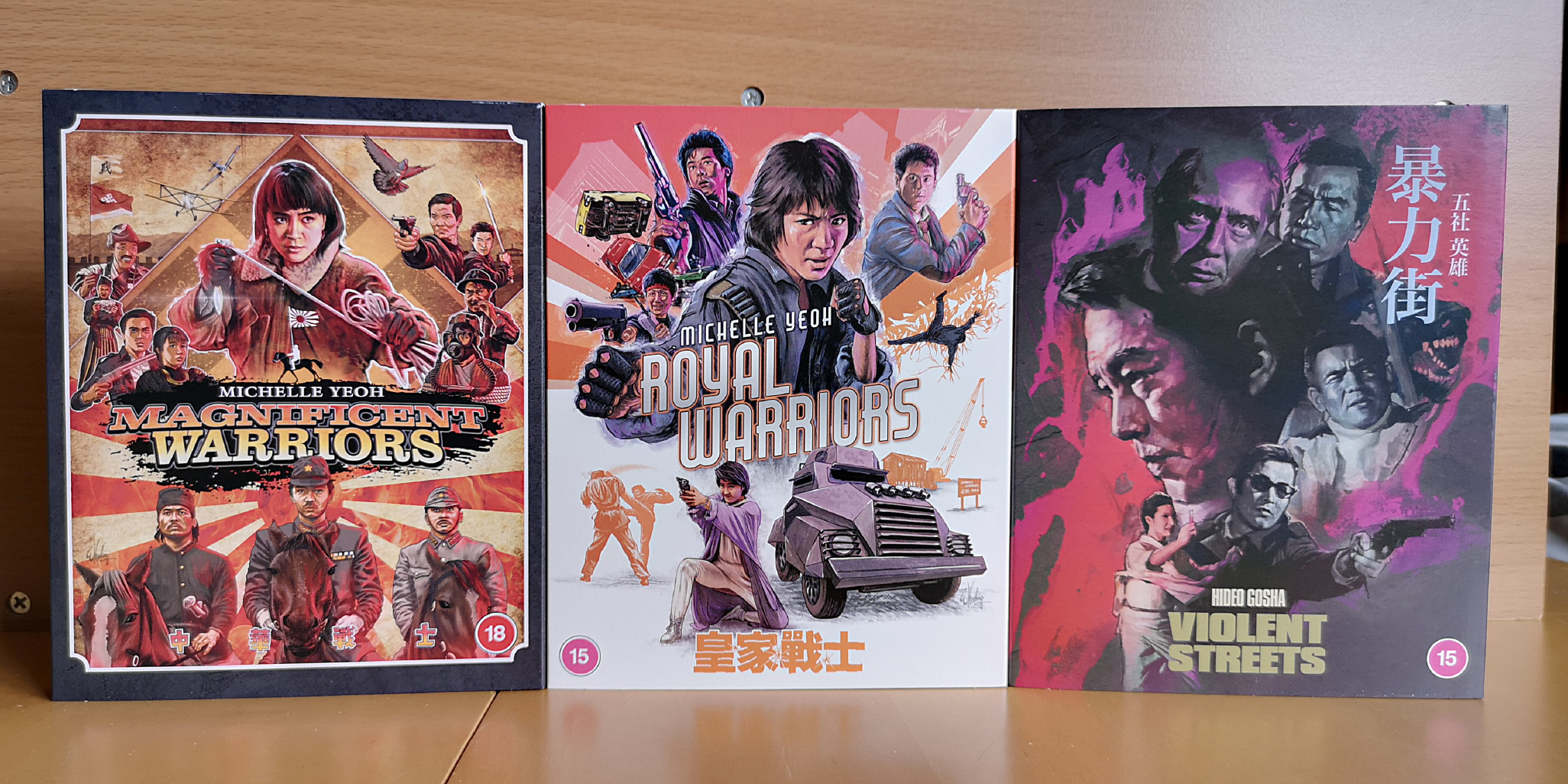 Next we have the two releases from February. David Chung’s 1987 film Magnificent Warriors (中華戰士), also starring Michelle Yeoh, was among the titles announced by Eureka many months ago with Yes Madam and Royal Warriors so it’s now here. Coincidently 88 Films are also releasing this film for the US market.