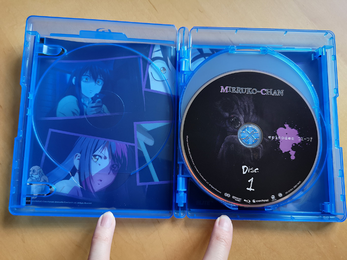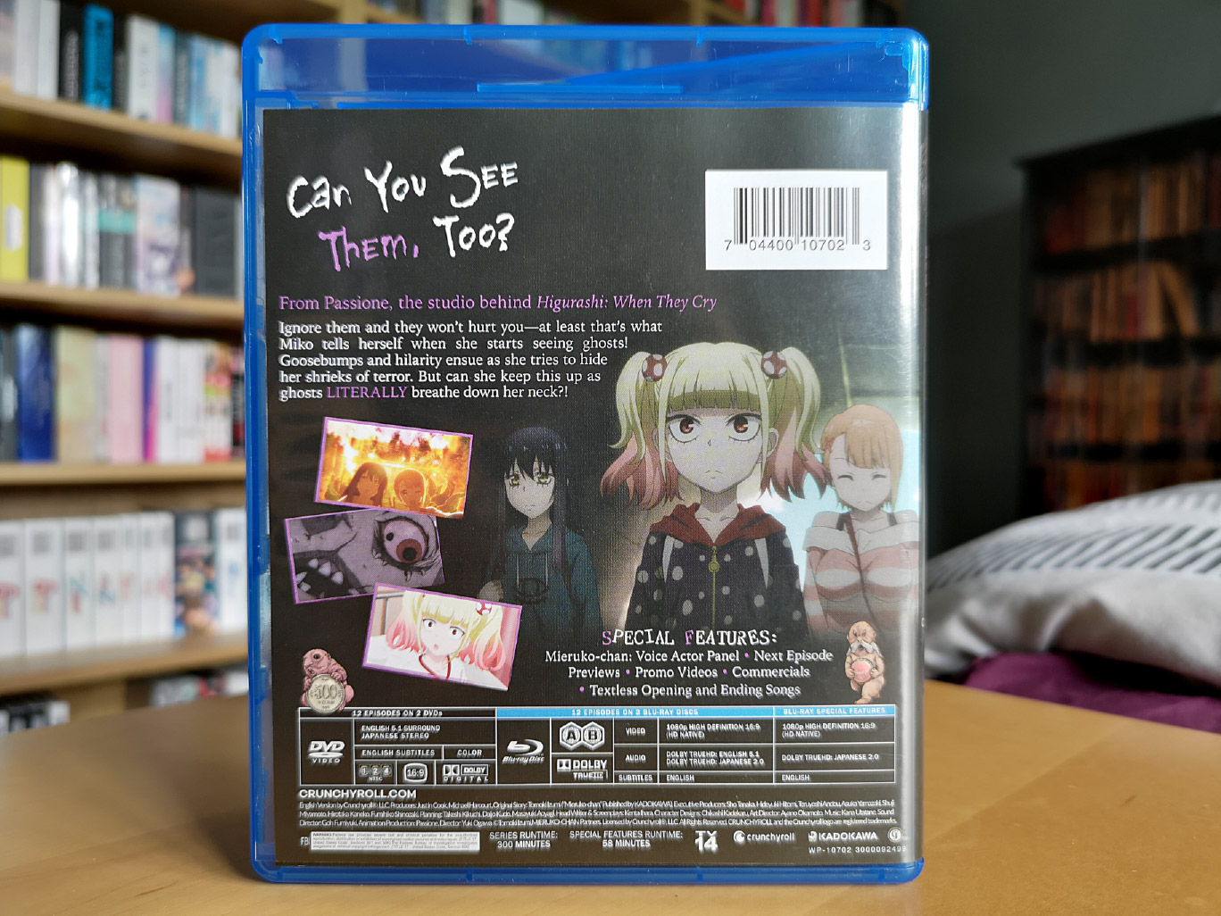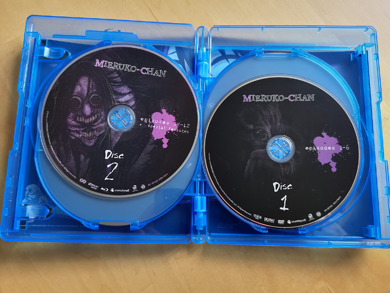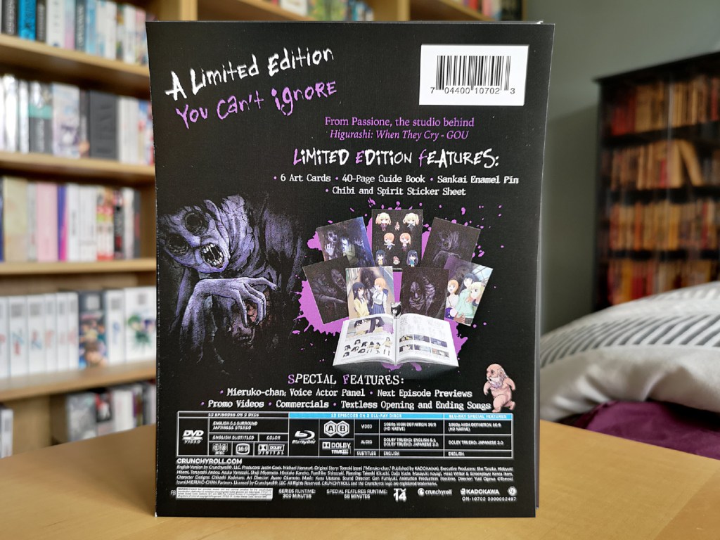 The limited edition release for Mieruko-chan contains all 12 episodes across two Blu-ray discs and two DVD discs, with the encode and authoring done by Crunchyroll.