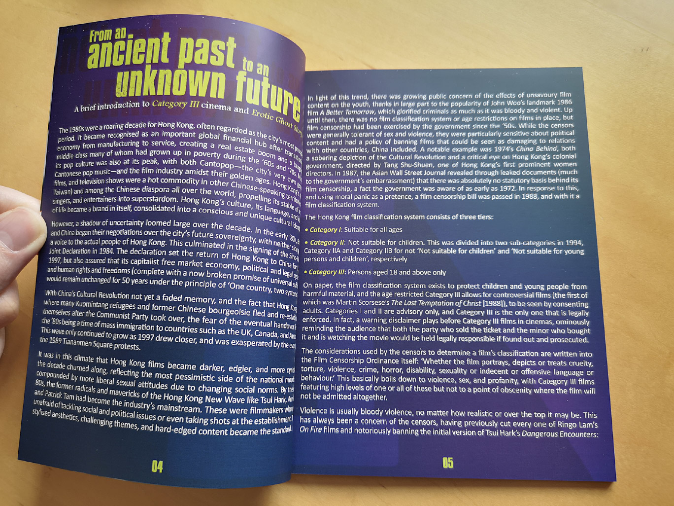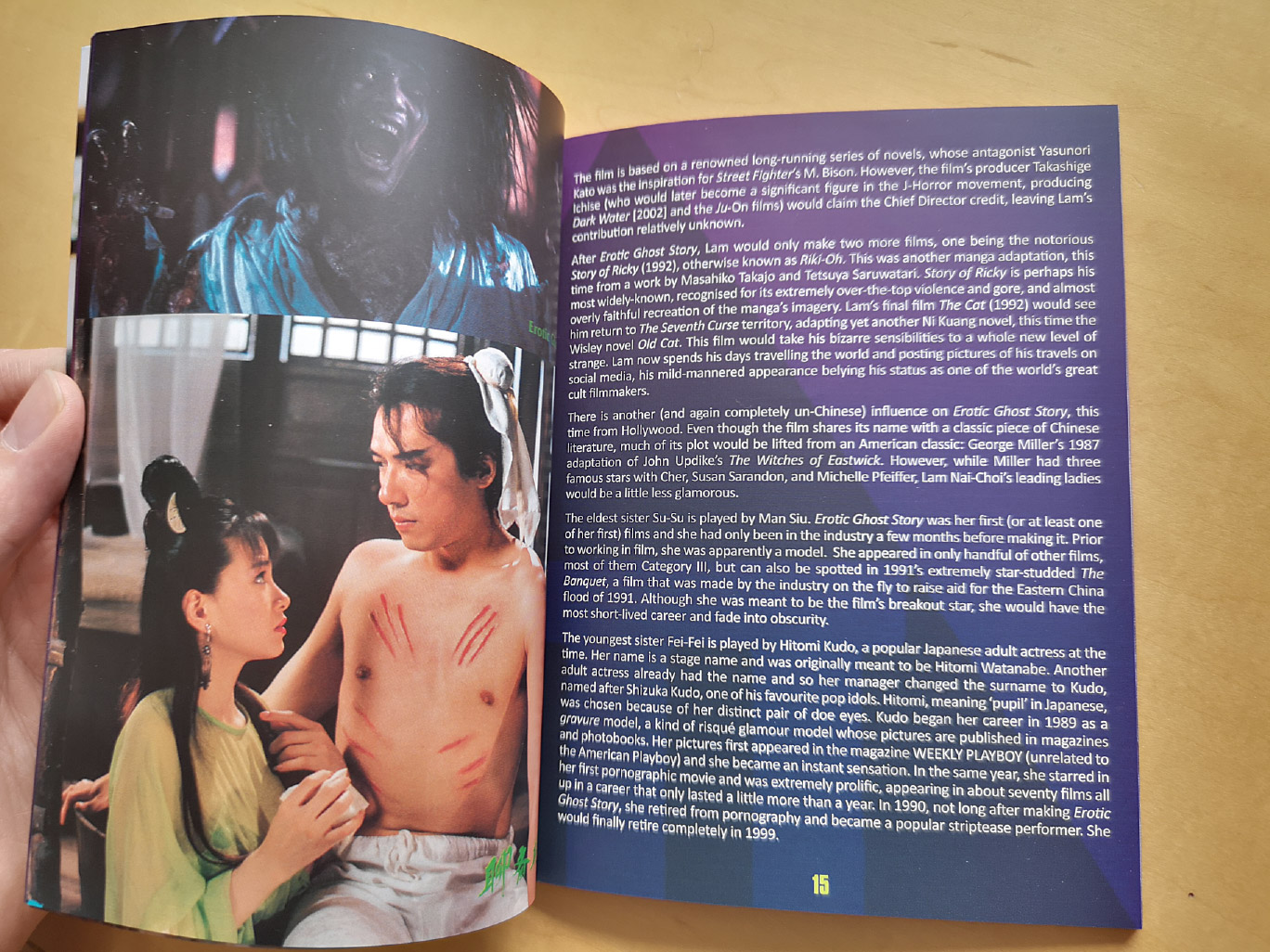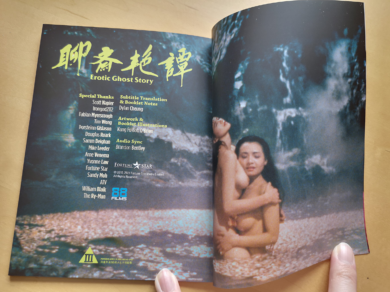 This deluxe collector’s edition release is presented with a rigid box showcasing newly illustrated artwork by R.P. “KUNG FU BOB” O’Brien, an Amaray case housing the disc, double-sided poster featuring the new artwork and the original theatrical poster artwork, and an 40-page perfect-bound book featuring the write-up ‘From an ancient past to an unknown future: A brief introduction to Category III cinema and Erotic Ghost Story’ by Dylan Cheung.