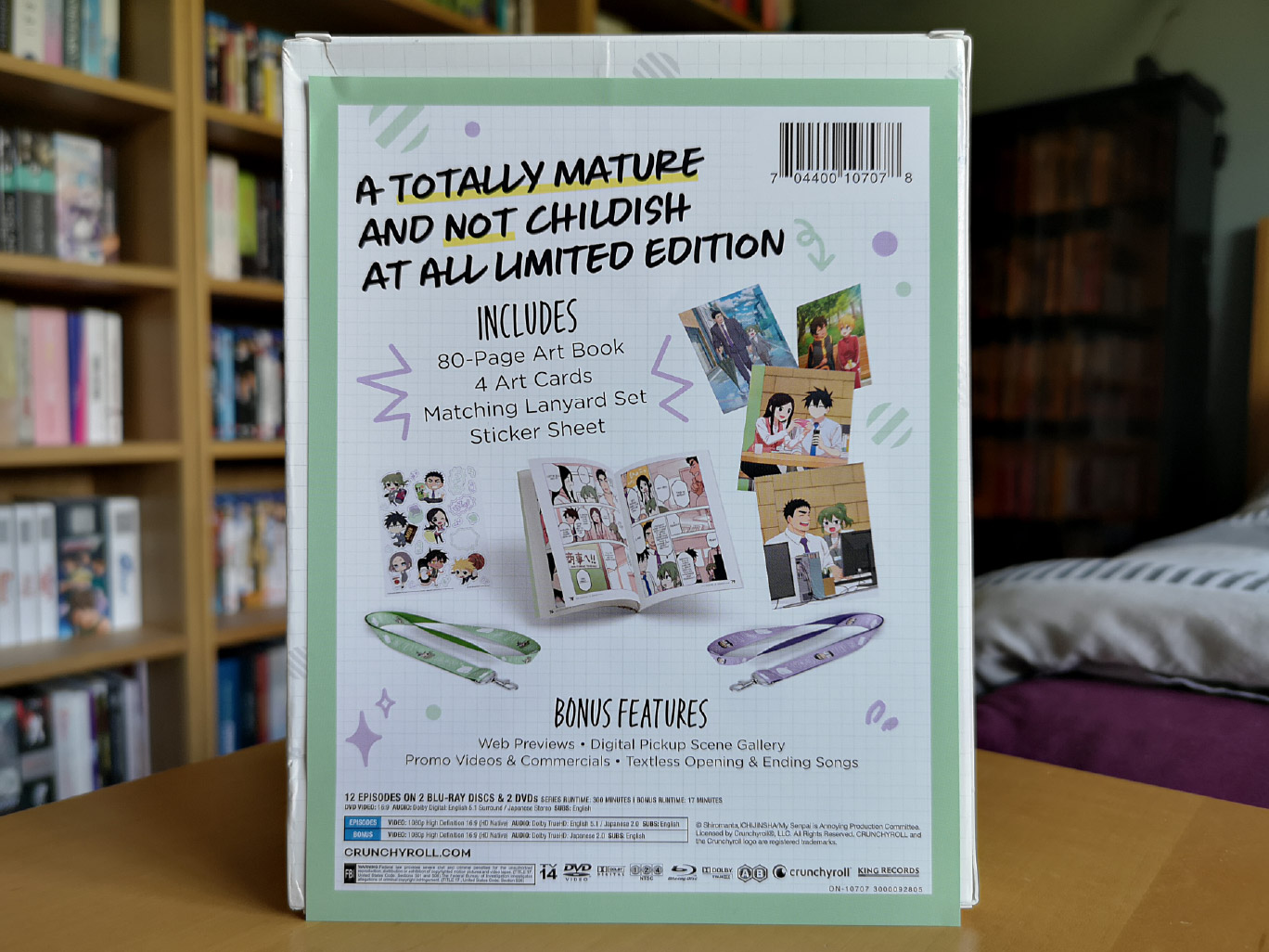 The limited edition release for My Senpai is Annoying contains all 12 episodes across two Blu-ray discs and two DVD discs, with the encode and authoring produced by Crunchyroll. The audio options include Japanese with English subtitles and the Funimation English dub.