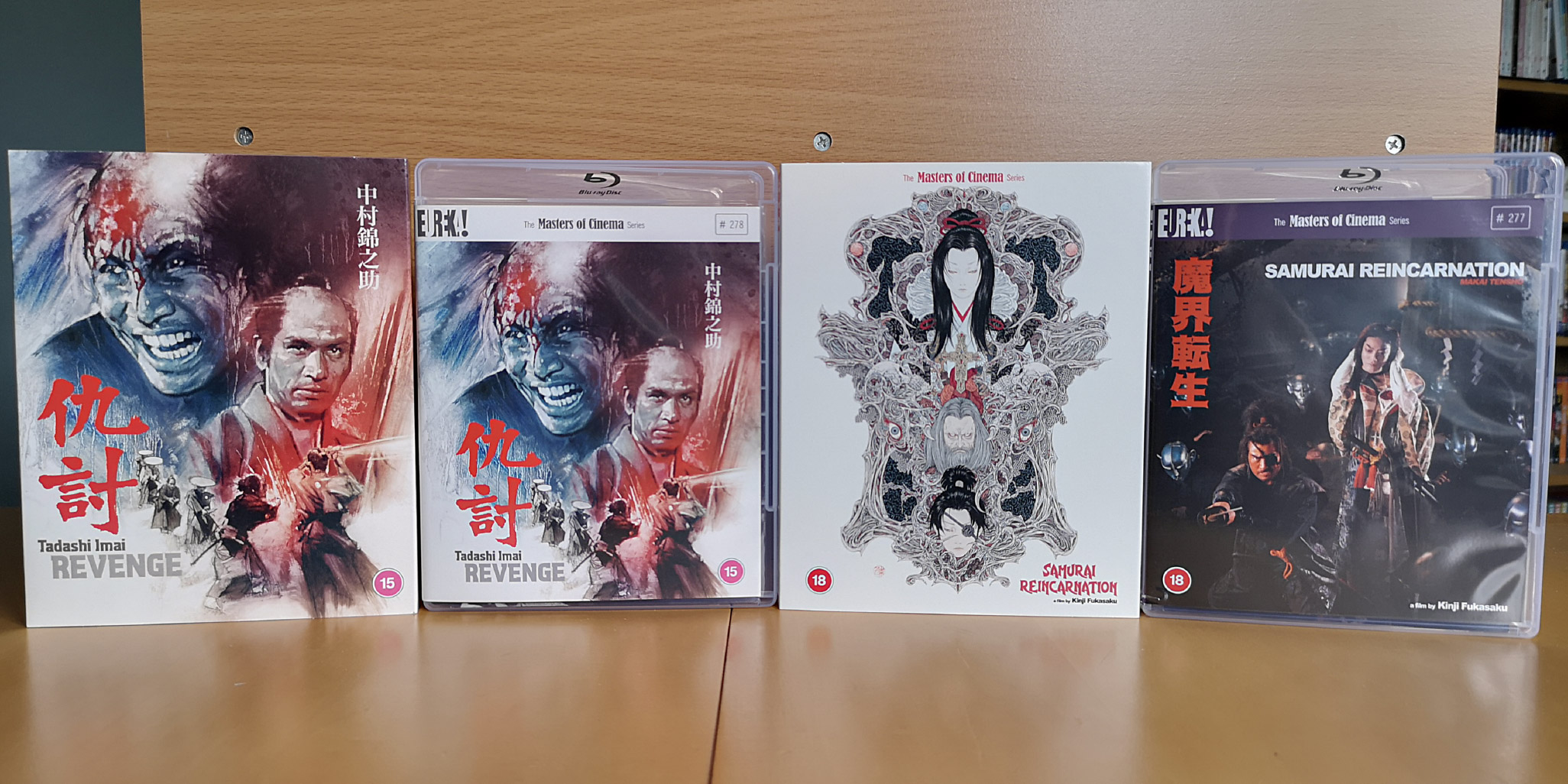 Two Eureka Entertainment Blu-rays arrived from their June pre-order bundle that was available a few months ago, which contained all three Asian Cinema releases scheduled for this month. The third film would then arrive later this month. The titles are Tadashi Imai’s Revenge (仇討) and Kinji Fukasaku’s Samurai Reincarnation (魔界転生), both are part of Eureka’s Masters of Cinema range and they are also in their first print editions which includes a slipcase (booklets stick around for these MoC titles).