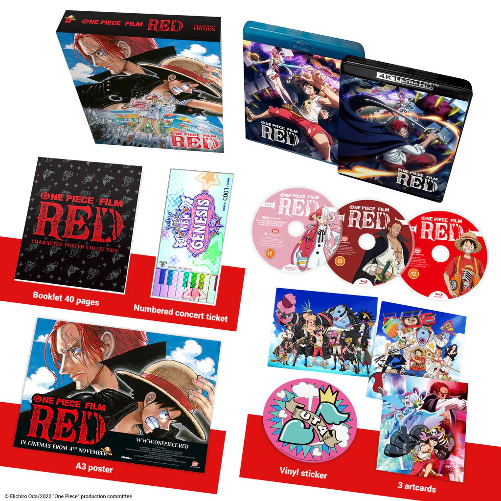 | TV Episode 1029: A Faint Memory! Luffy and Red-Haired’s Daughter Uta! TV Episode 1030: A Pledge for the New Genesis! Luffy and Uta! TV Episode Special: The Captain’s Log of the Legend! ‘Red-Haired’ Shanks! Interview with the film’s director Goro Taniguchi Trailers Web Previews | Rigid Box with UHD & Amaray packaging 40-page Booklet Numbered Concert Ticket 3 Art Cards A3 Poster Vinyl Sticker |