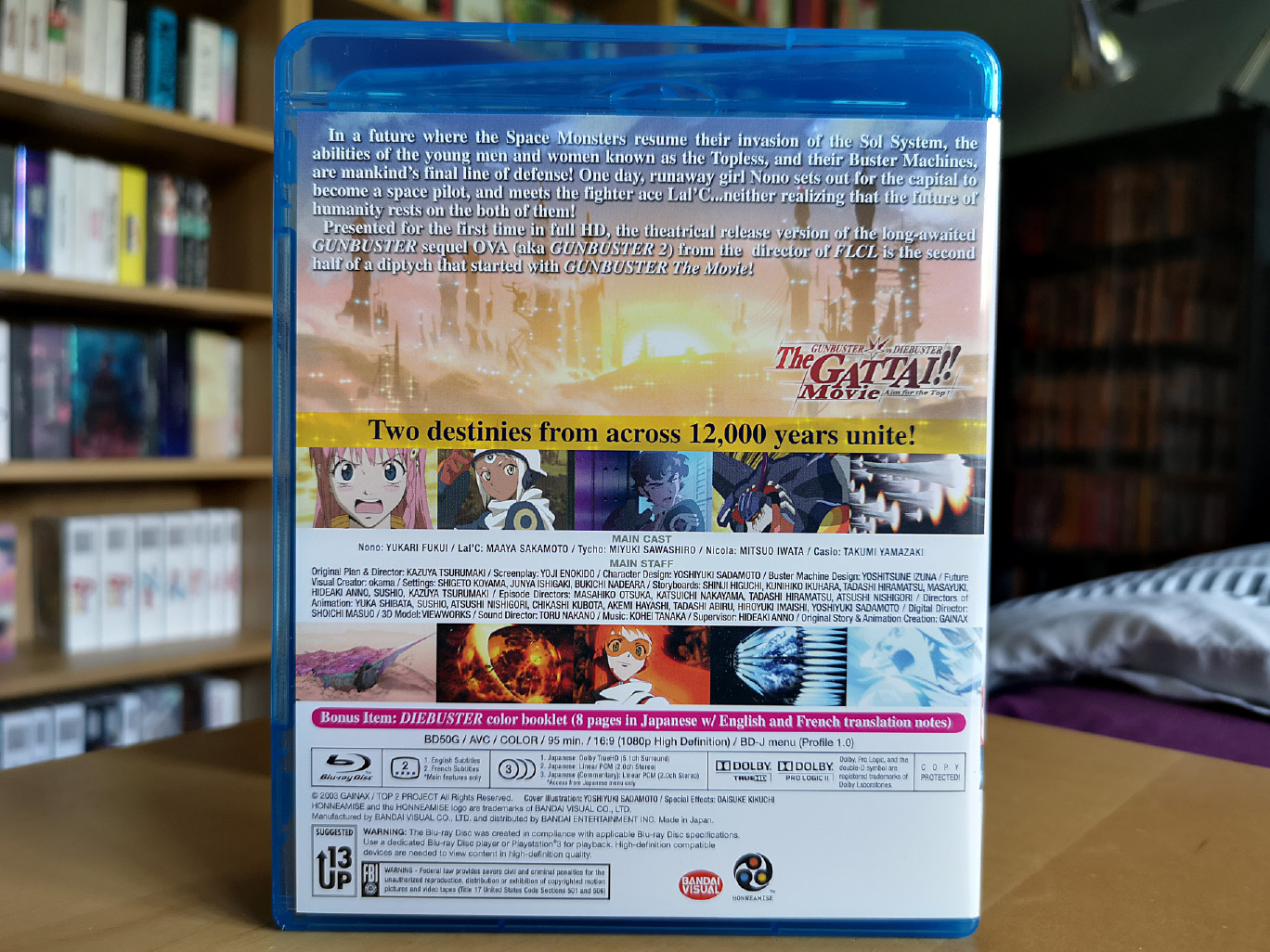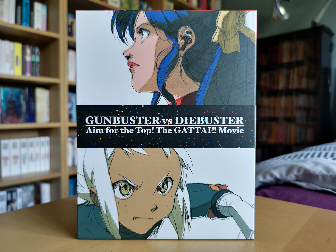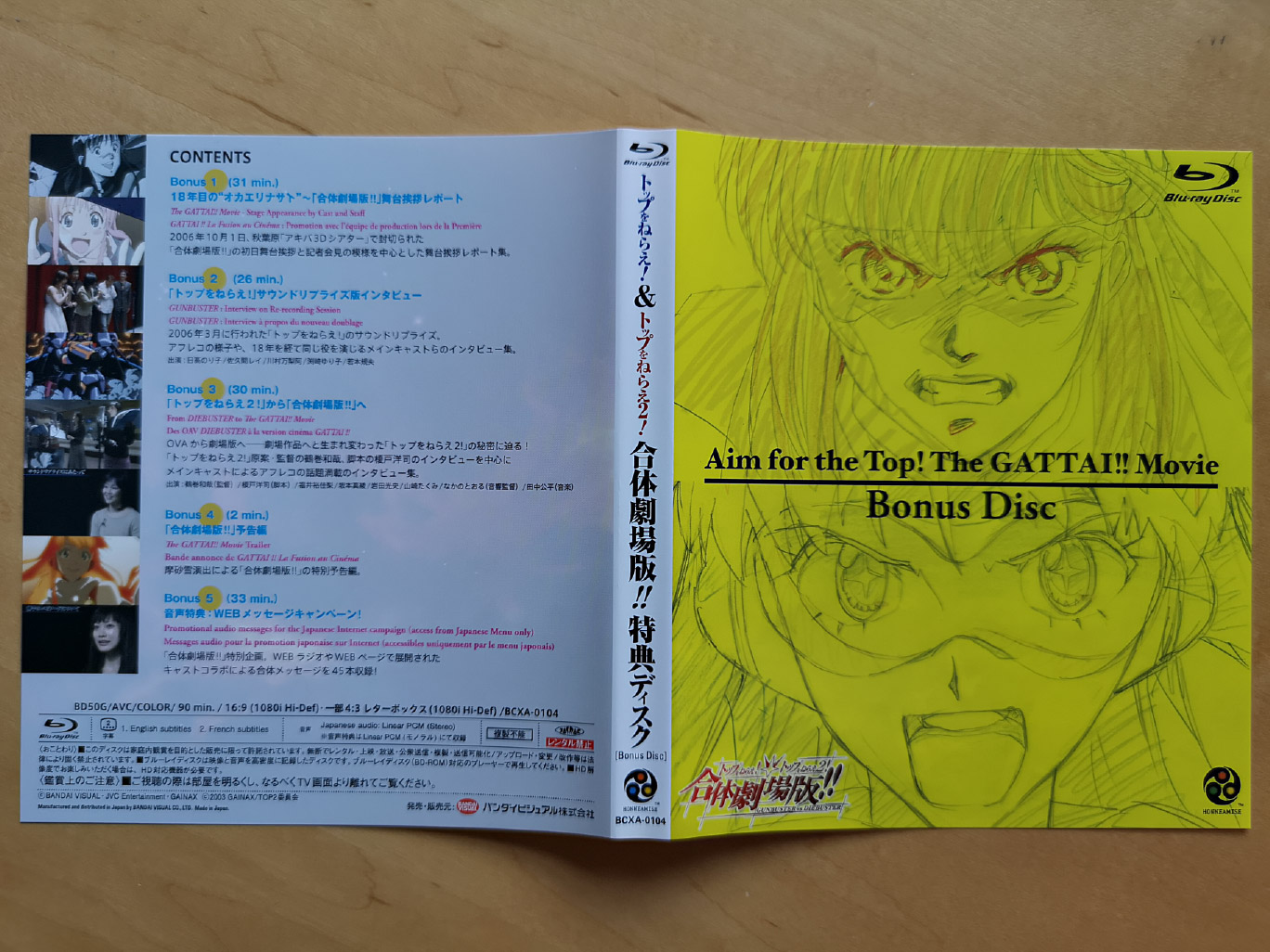 The limited edition release for Gunbuster vs Diebuster: Aim for the Top! The GATTAI!! Movie contains Gunbuster the Movie and Diebuster the Movie on a Blu-ray disc each, plus an additional Blu-ray disc dedicated to on-disc bonus features. The encode and authoring were produced by Bandai Visual & Honneamise.