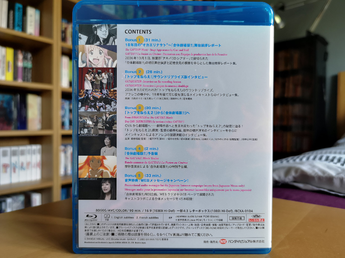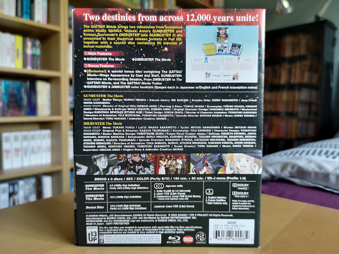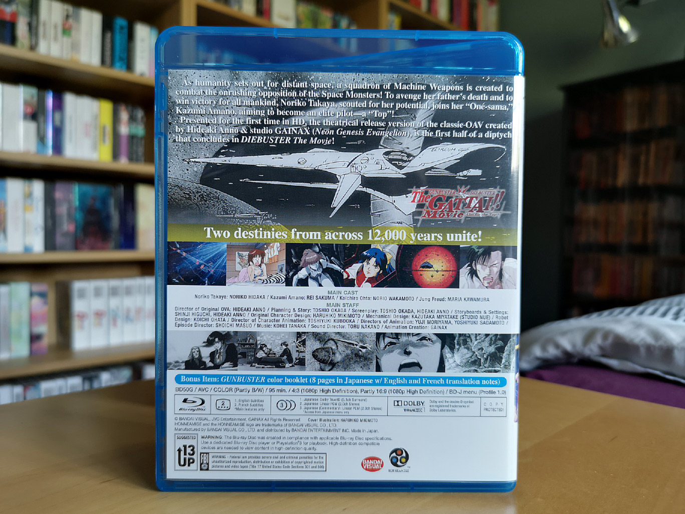 The limited edition release for Gunbuster vs Diebuster: Aim for the Top! The GATTAI!! Movie contains Gunbuster the Movie and Diebuster the Movie on a Blu-ray disc each, plus an additional Blu-ray disc dedicated to on-disc bonus features. The encode and authoring were produced by Bandai Visual & Honneamise.