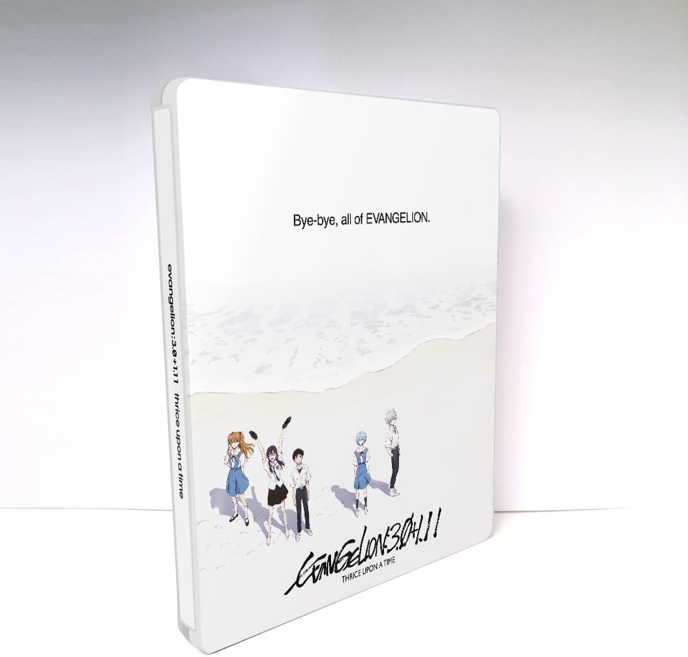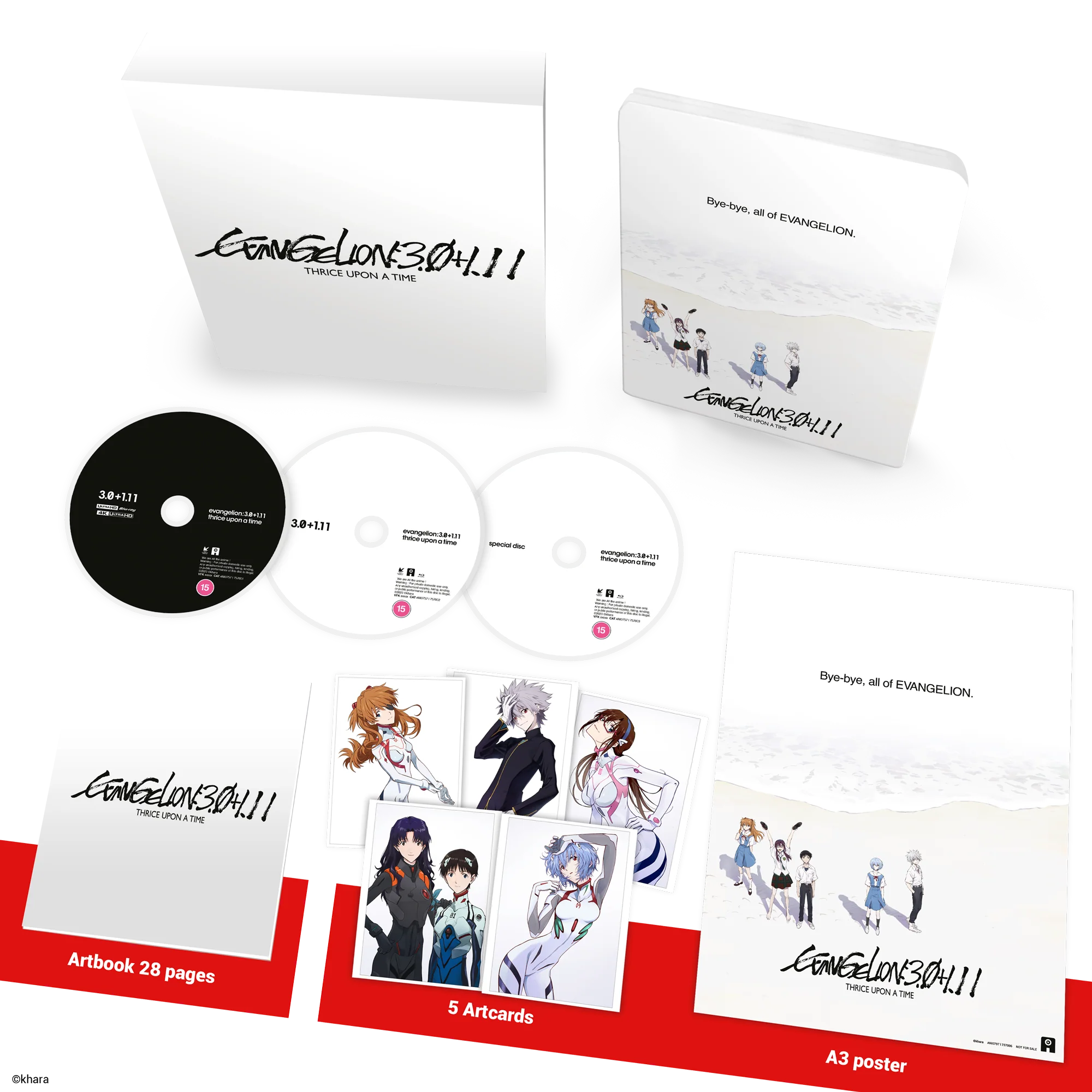 | – EVANGELION:3.0(-46h) – EVANGELION:3.0(-120min.) – Character Promotion Reels – Stage Greeting – Trailers | – Rigid Box with Steelbook Packaging – 28-page Artbook – 5 Art Cards – A3 Poster |