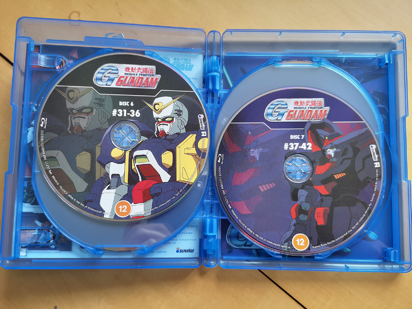 The collector’s edition releases for Mobile Fighter G Gundam were released across two parts for the UK & US. The first part contains episodes 1 to 24 across four Blu-ray discs and the second part contains episodes 25 to 49 across another four Blu-ray discs, both parts were authored and encoded by Rightstuf with Anime Limited’s logos included at the intro. The audio options available for the series includes Japanese with English subtitles and the Ocean Group English dub commissioned by Bandai Entertainment.