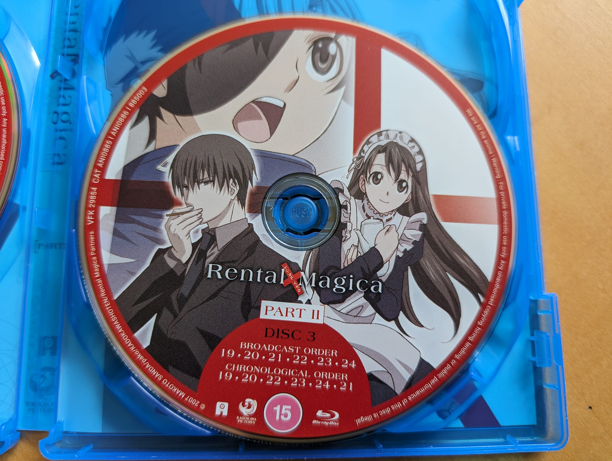The collector’s edition releases for Rental Magica contains the entire series across two part sets. The anime has two different ways to watch the series (like Haruhi Suzumiya), with a broadcast order and chronological order, which is why we have six Blu-ray discs in total (3 per part). To better explain the episode disc split, here’s a small table: