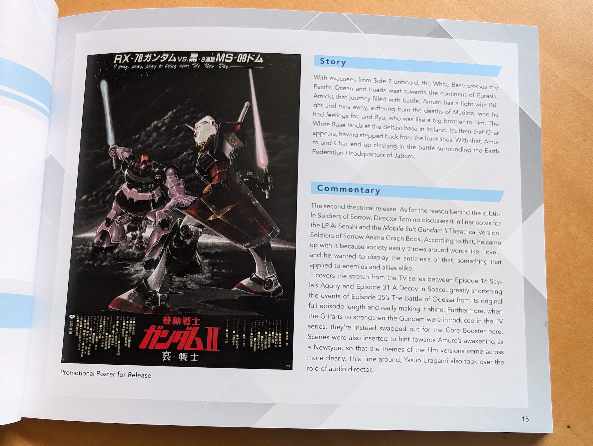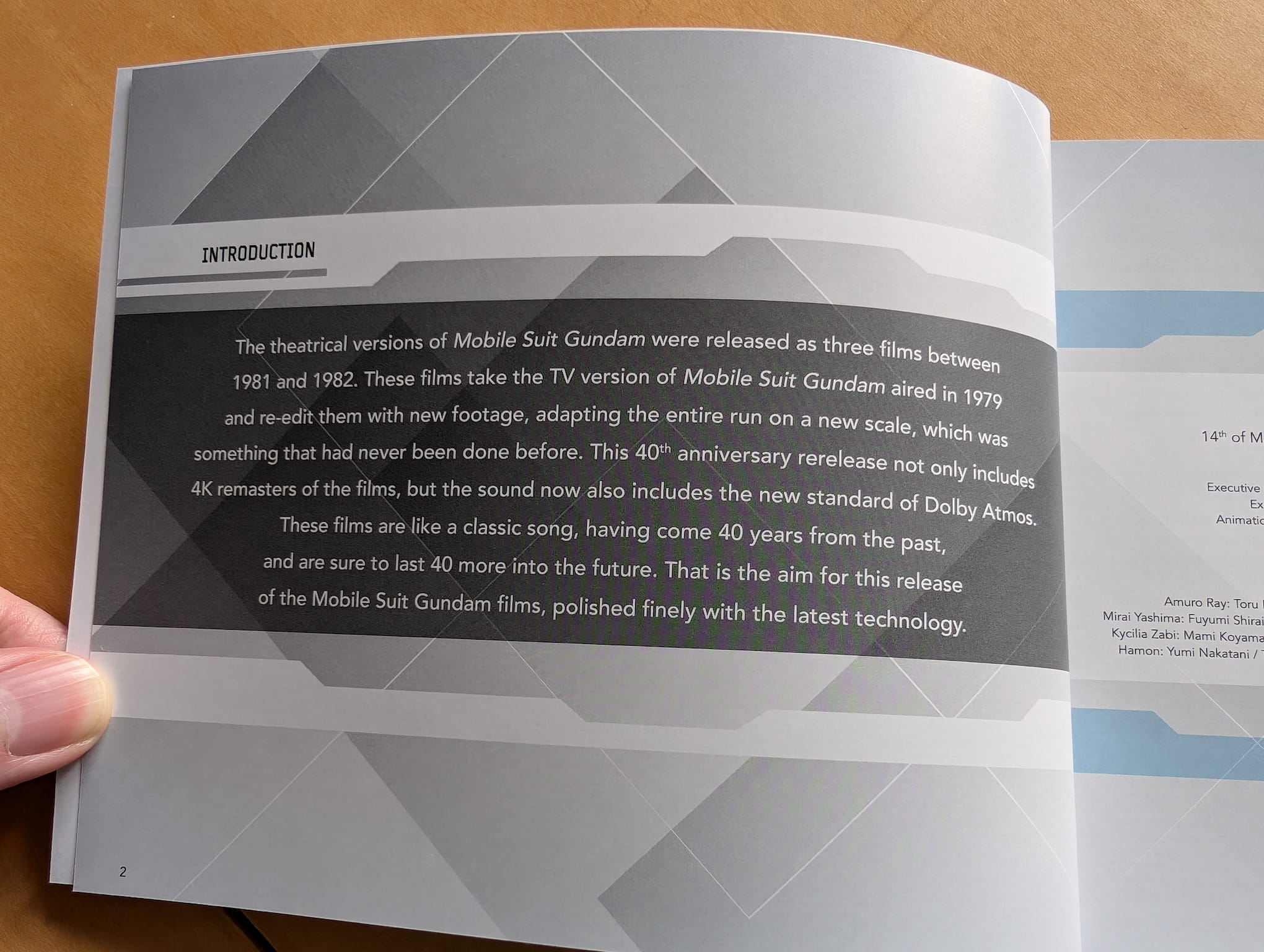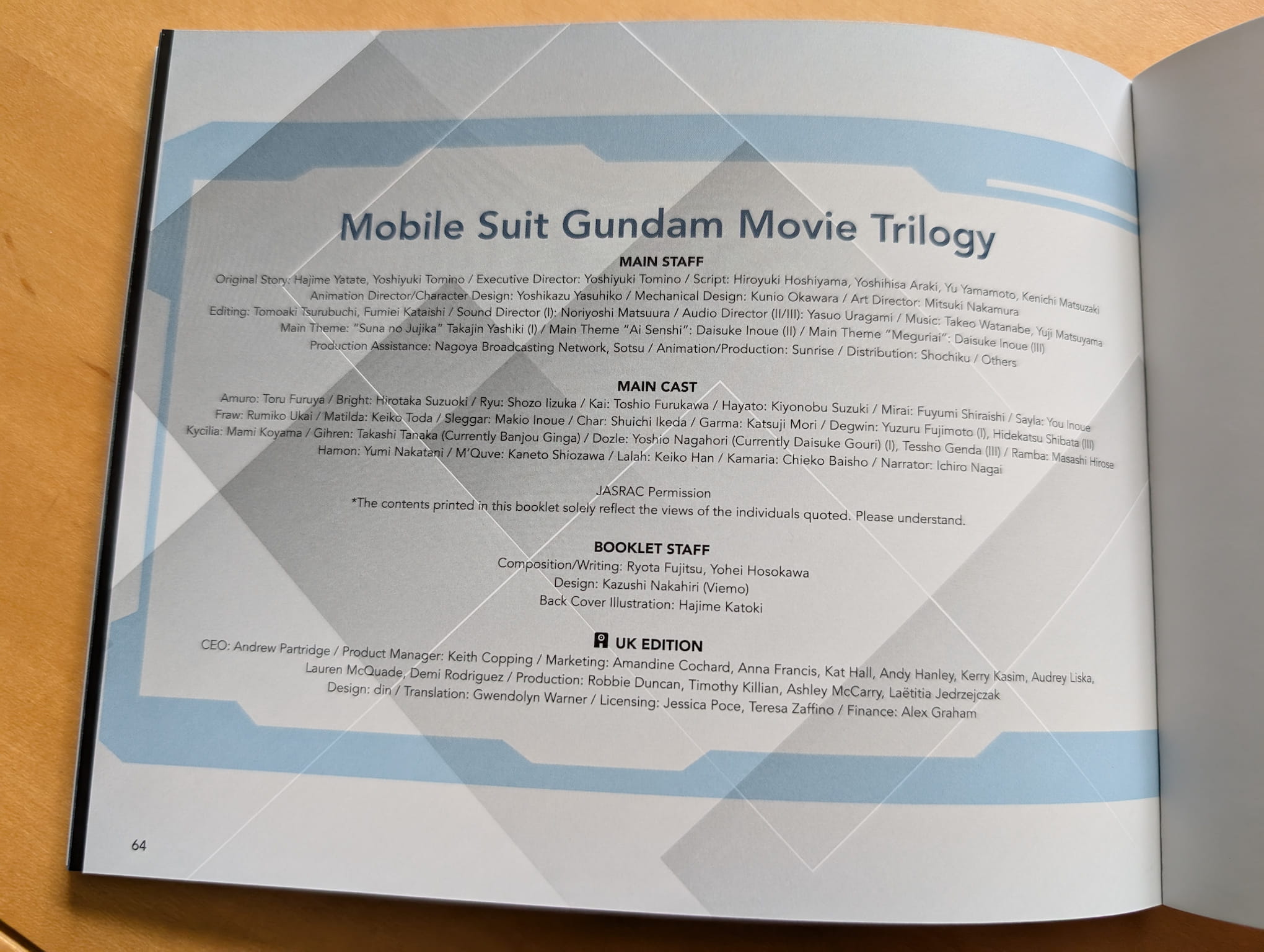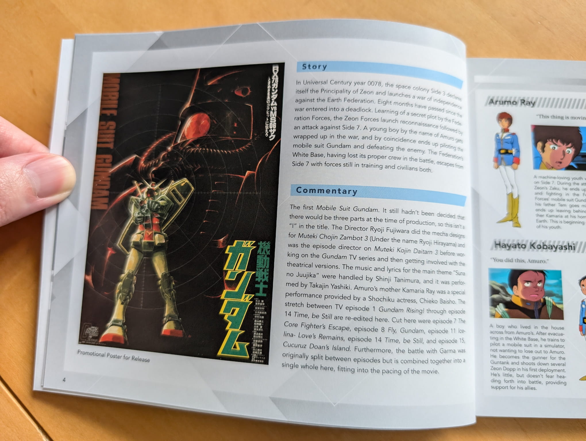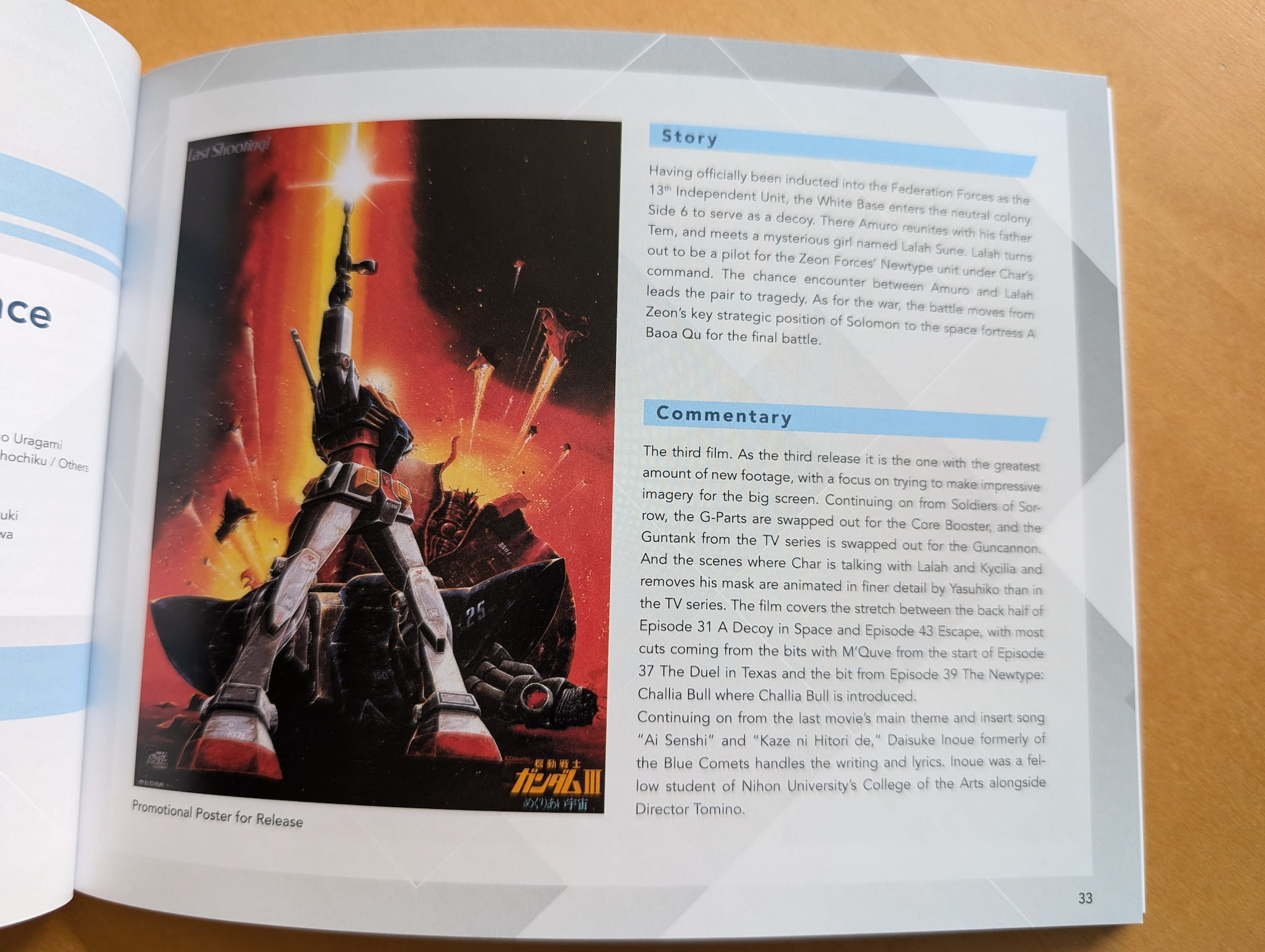 Much like the Blu-ray release, this package contains a rigid box to house three 4K Amaray cases with each case covering each film and their respective disc. Also included is a 68-page Booklet called “Beyond the Universal Century” which is pretty much covering the same content (or at least most) of what was included in the Japanese 4K UHD Disc Box release back in 2020. The booklet includes film information, character details, storyboards, interviews from the director and staff, and an extensive guide on the film’s Universal Century lore pretty much. There are spoilers here and there so it’s recommended you watch the films first before reading them.