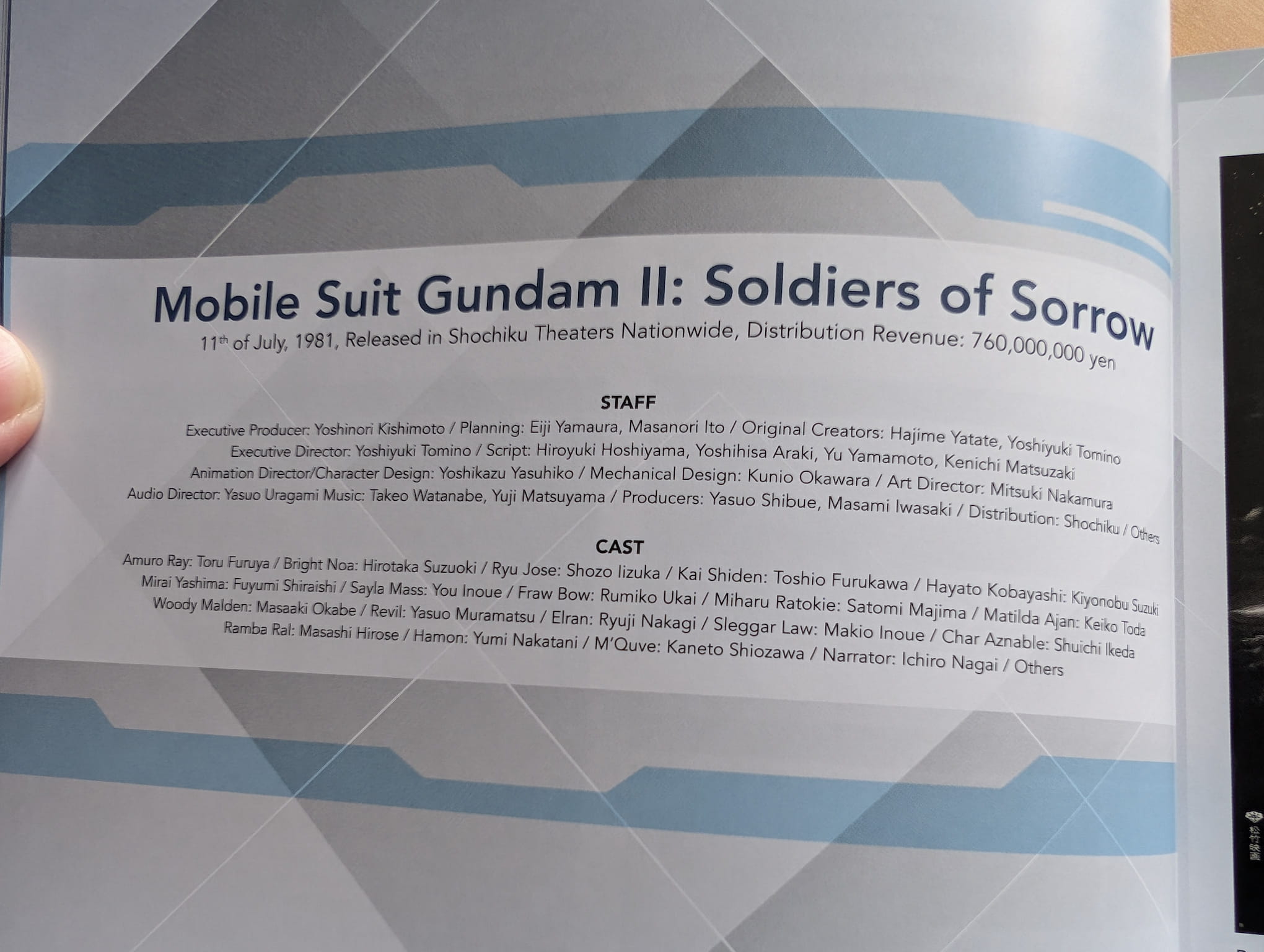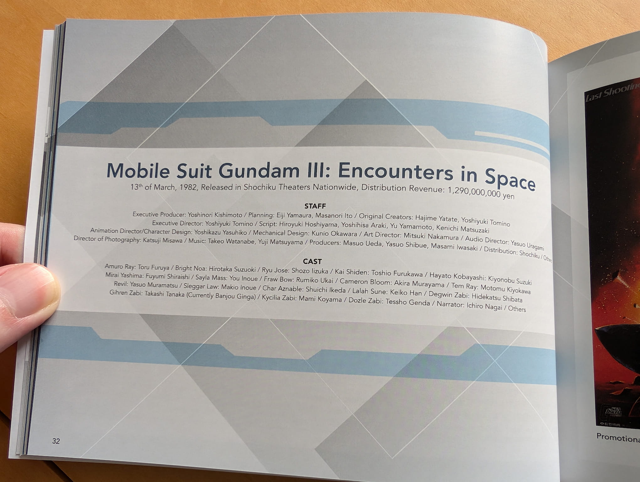 The films featured are Mobile Suit Gundam I (機動戦士ガンダム I, Kidō Senshi Gandamu I), released theatrically in Japan on March 1981, Mobile Suit Gundam II: Soldiers of Sorrow (機動戦士ガンダムⅡ 哀・戦士編, Kidō Senshi Gandamu II: Ai Senshi-hen), released theatrically in Japan on July 1981, and Mobile Suit Gundam III: Encounters in Space (機動戦士ガンダムⅢ めぐりあい宇宙編, Kidō Senshi Gandamu III: Meguriai Sora-hen), released theatrically in Japan on March 1982.