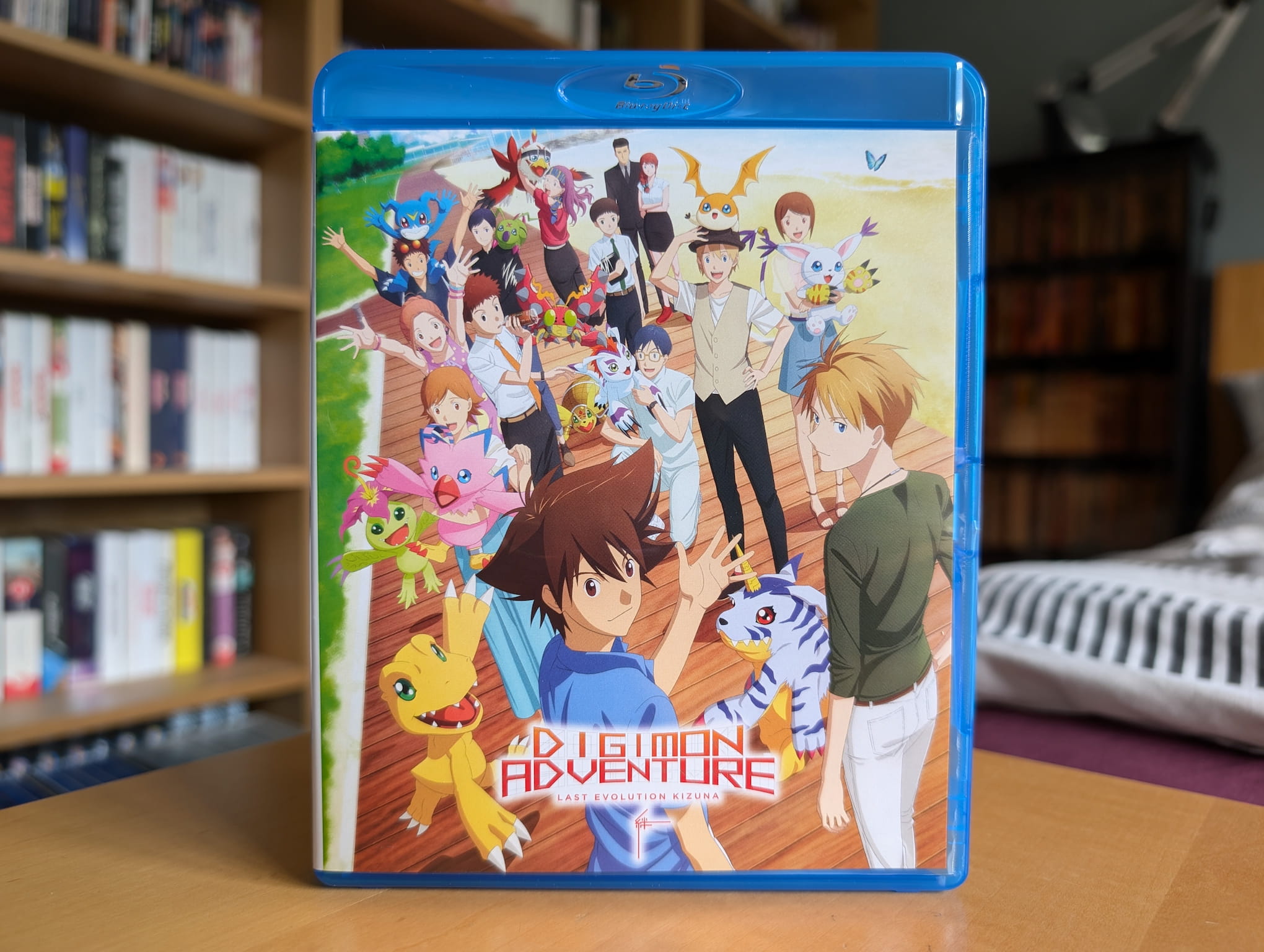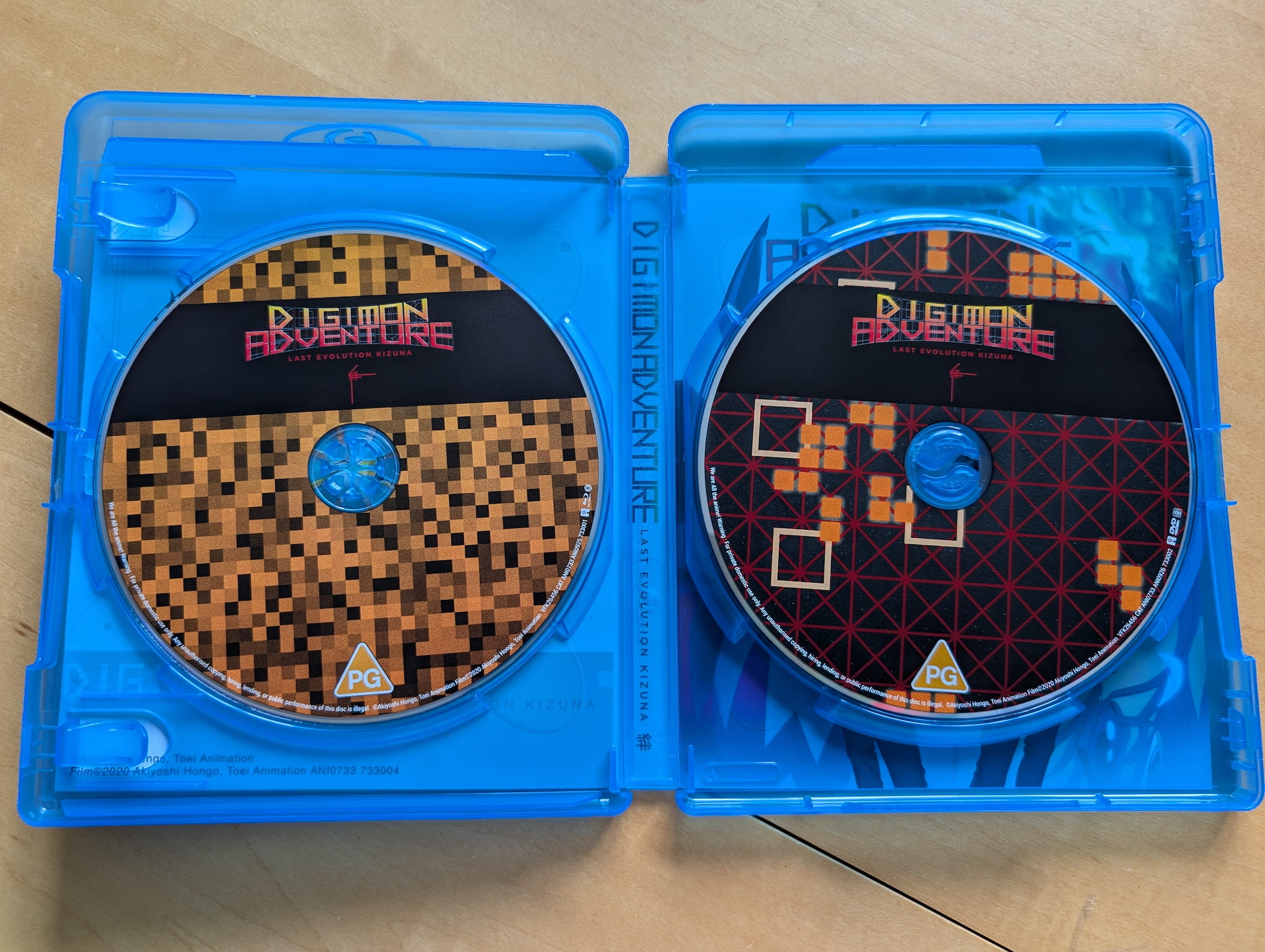 The collector’s edition release for Digimon Adventure: Last Evolution Kizuna contains the film on a single Blu-ray disc and a single DVD disc, with the encode and authoring done by Shout! Factory via their release in 2020.