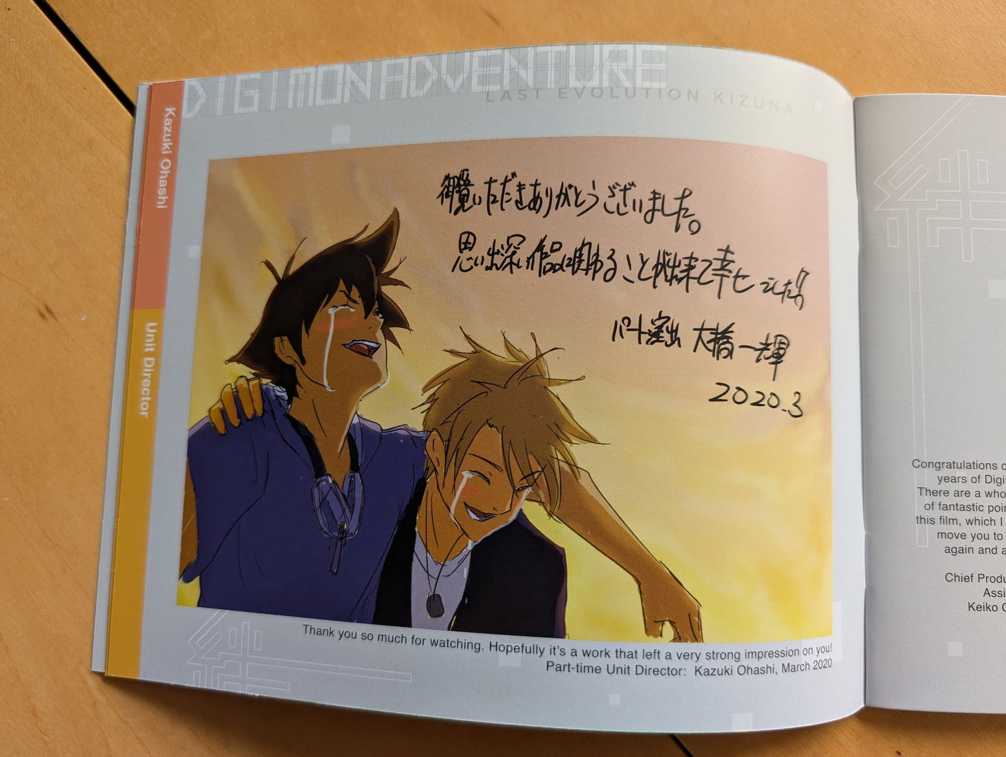 Digimon Adventure: Last Evolution Kizuna (デジモンアドベンチャー LAST EVOLUTION 絆) is a 2020 original theatrical anime film directed by Tomohisa Taguchi, and produced by studio Toei Animation. Staff credits also include writer Akatsuki Yamatoya, character designer Katsuyoshi Nakatsuru, and music composer Harumi Fuuki. The film released theatrically in Japan on February 2020.