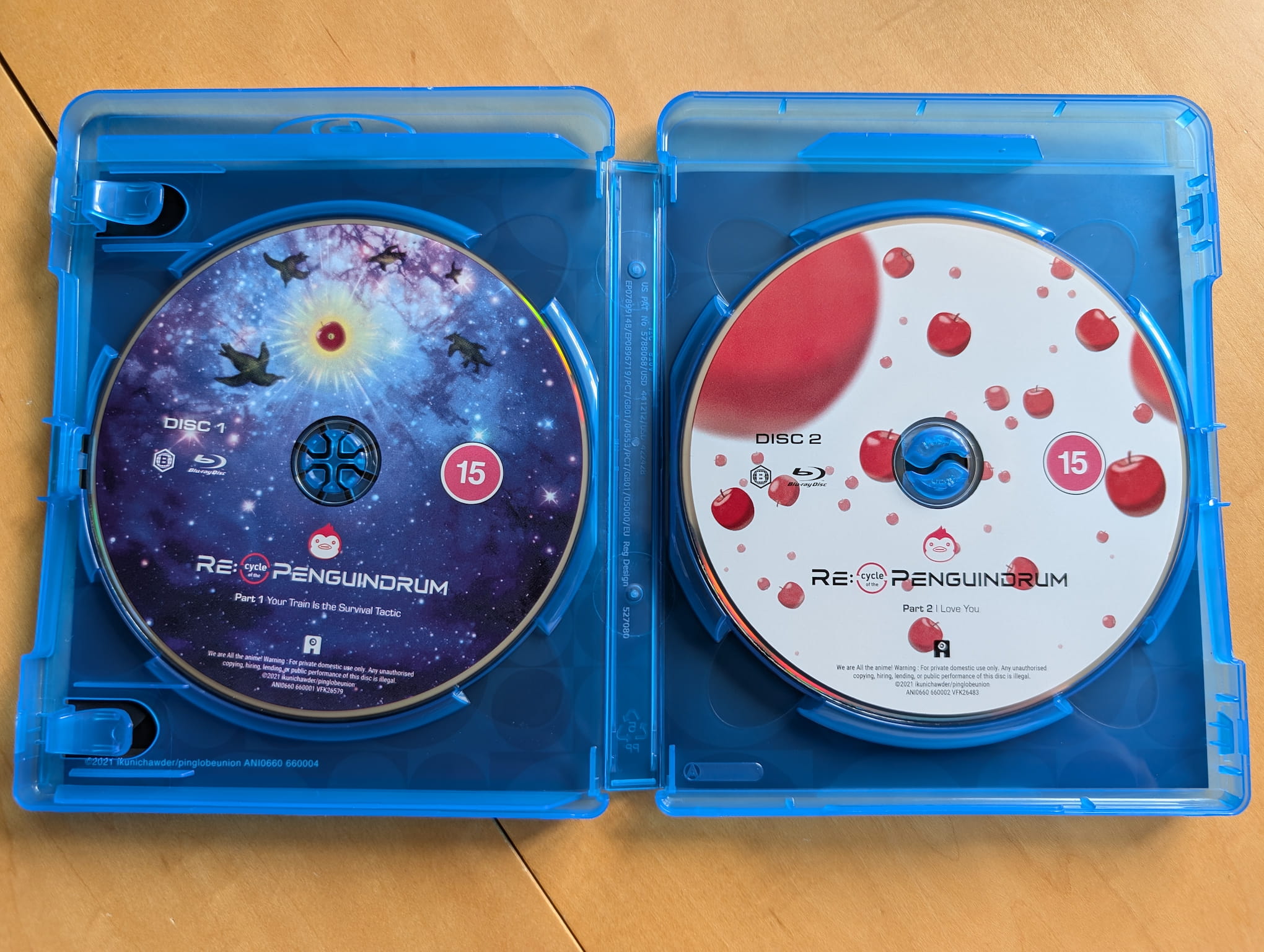 The collector’s edition release for Re:cycle of the Penguimdrum contains both compilation films across two Blu-ray discs, with the encode and authoring by Sentai Filmworks via their 2023 release (with Anime Limited’s logos at the disc start).