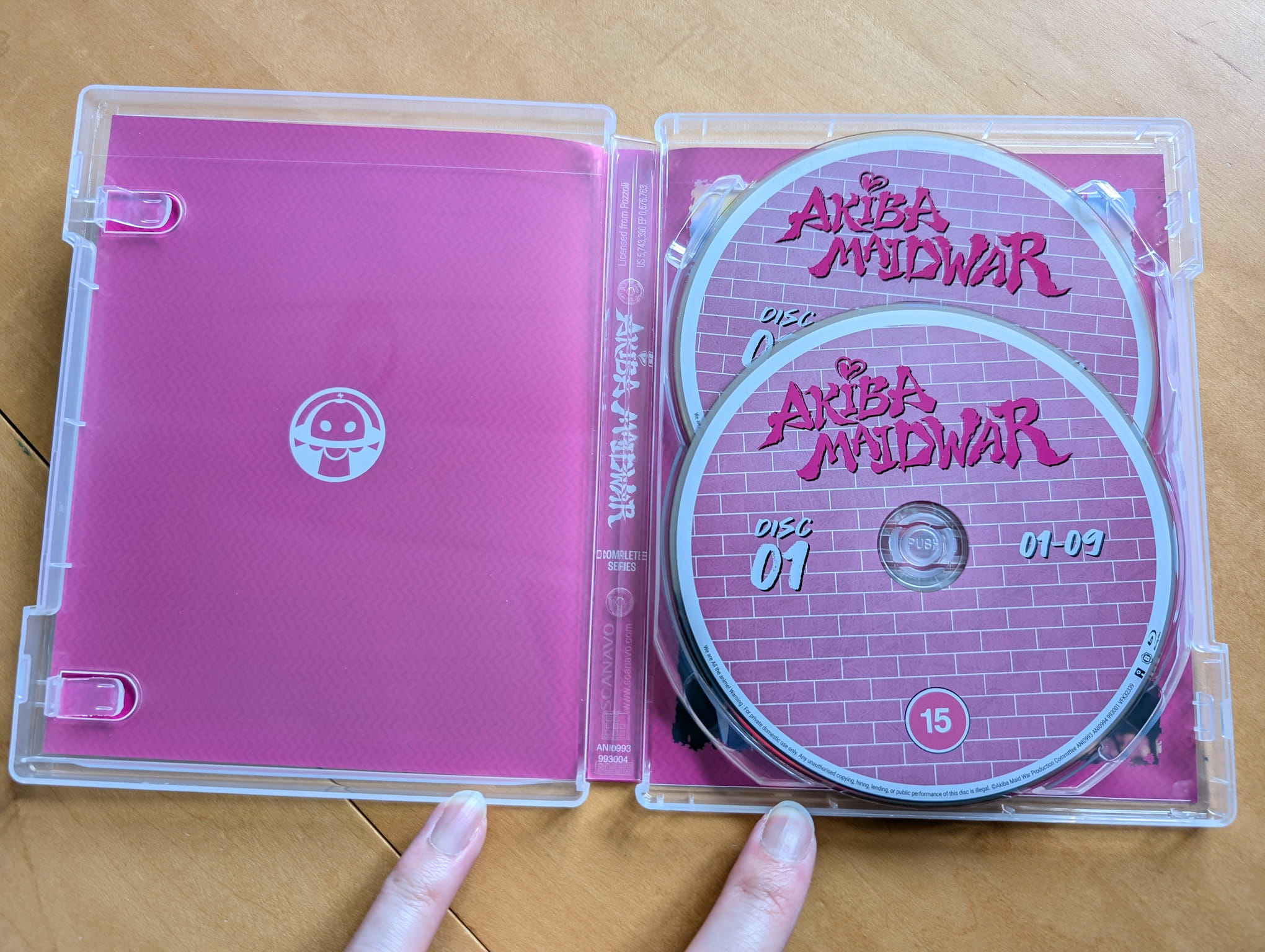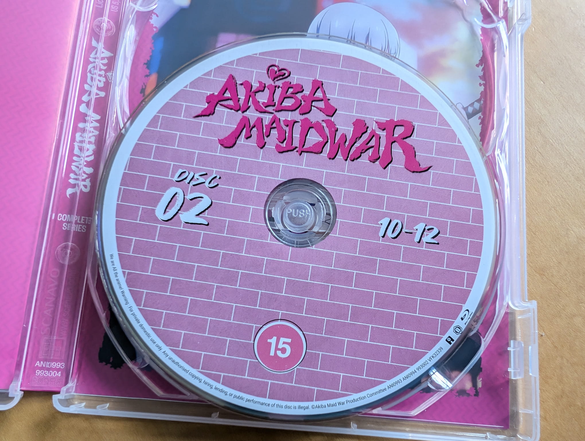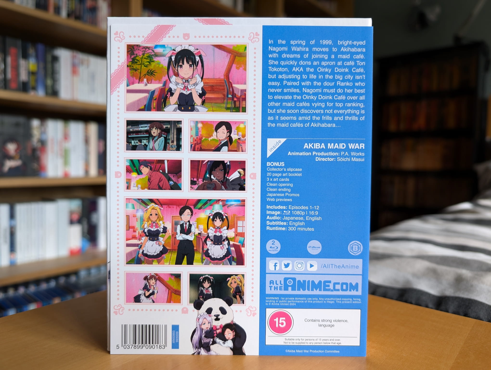 The collector’s edition release for Akiba Maid War contains all 12 episodes of the series across two Blu-ray discs, with the encode & authoring done by Sentai Filmworks via their March 2024 release.