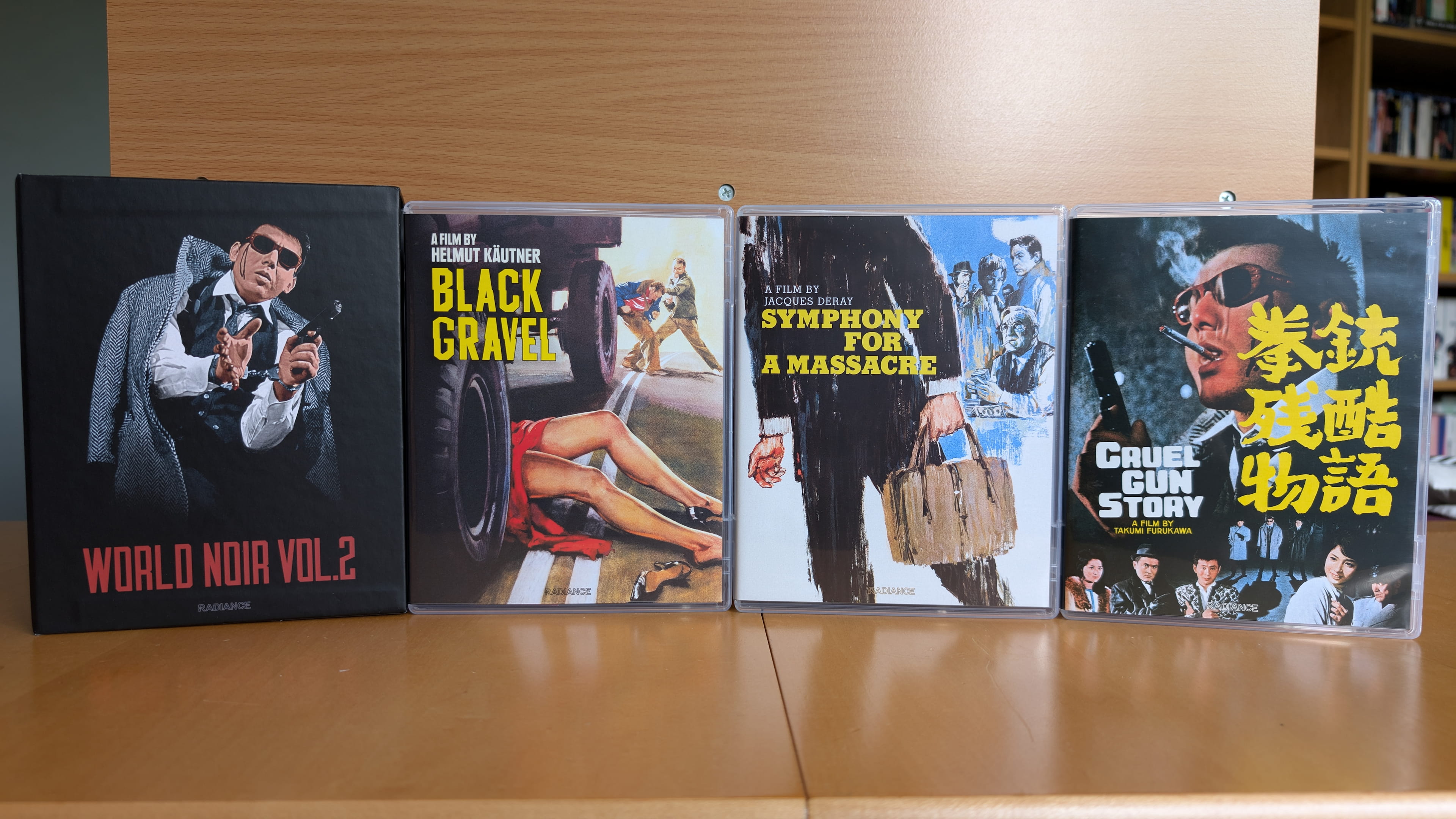 The other release I ordered with the Japanese titles comes the latest big box release from Radiance Films with World Noir Vol. 2, which contains three more international non-English films set during the early 60s. In this volume we have Helmut Käutner’s Black Gravel (Schwarzer Kies) released in 1961 from Germany, Jacques Deray’s Symphony for a Massacre (Symphonie pour un massacre) released in 1963 from France, and Takumi Furukawa’s Cruel Gun Story (拳銃残酷物語) released in 1964 from Japan.
