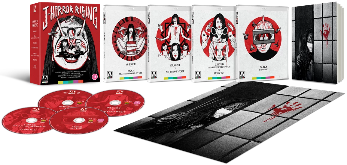 | Disc 1: Shikoku & Isola: Multiple Personality Girl – Brand new audio commentary on Shikoku by Japanese cinema expert Tom Mes – Brand new audio commentary on Isola: Multiple Personality Girl by critics and Japanese cinema experts Jasper Sharp and Amber T. – The Aftermath, Tom Mes discusses J-Horror at the turn of the millennium – Something in the Water, a brand new interview with Shikoku director Shunichi Nagasaki – Archive interviews with director Shunichi Nagasaki and actors Chiaki Kuriyama and Yui Natsukawa on Shikoku – Archive interview with actors Yoshino Kimura and Yu Kurosawa on Isola: Multiple Personality Girl – On-set footage of the filming of Shikoku – Original trailers and TV spots for both films – Image galleries Disc 2: Inugami & St. John’s Wort – Brand new audio commentary on Inugami by Japanese cinema expert Jonathan Clements – Brand new audio commentary on St. John’s Wort by Japanese cinema expert Amber T. – Dog Days, brand new video interview with Inugami director Masato Harada – The Making of St. John’s Wort, archival featurette – Archive interviews with St. John’s Wort actors Megumi Okina, Koichiro Saito, Reiko Matsuo and Koji Okura – On-set behind-the-scenes footage of the filming of St. John’s Wort – Original trailers and TV spots for St. John’s Wort – Image galleries Disc 3: Carved: The Slit-Mouthed Woman & Persona – Brand new audio commentary on Carved: The Slit-Mouthed Woman by Japanese folklore expert Zack Davisson – Why So Serious?, a brand new interview with Carved: The Slit-Mouthed Woman director Koji Shiraishi – Weapon of Choice, a brand new video essay on Carved: The Slit-Mouthed Woman by Japanese horror specialist Lindsay Nelson – Confessions of a Mask, a brand new interview with Persona director Takashi Komatsu – Image galleries Disc 4: Noroi: The Curse – Brand new audio commentary by film critic Julian Singleton – Director’s POV, a brand new video interview with Noroi: The Curse director Koji Shiraishi – The Man in the Shadows, a brand new interview with Noroi: The Curse producer Taka Ichise – Changing Perspective, a brand new video essay on Noroi: The Curse by Japanese horror specialist Lindsay Nelson – Ectoplasmic Worms, a brand new video essay on Noroi: The Curse and Japanese cosmic horror by Japanese cinema expert Amber T. – How to Protect Yourself Against Curses – Urgent report! Pursuing the Truth about Kagutaba!! TV Special – Over half an hour of deleted scenes – Trailers and TV spots – Image gallery |
