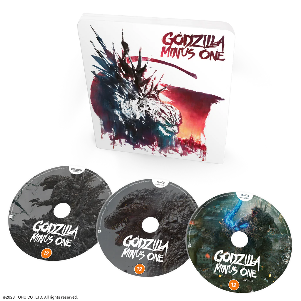 | Deluxe Edition: – Rigid slipcase outer packaging with four-tray digipack – Godzilla Minus One/Minus Color on Blu-ray – 68-page Booklet featuring a message from director Takashi Yamazaki, an introduction to the film, character bios, host of promotional artwork, and a wealth of interviews and information including interviews with director Takashi Yamazaki, VFX director Kiyoko Shibuya, audio recording and sound engineers Hisashi Takeuchi and Natsuko Inoue respectively, thoughts from Masahiro Ishiyama on colour-grading the film for both its original release and Godzilla Minus Color, as well as an article about the operation to bring Godzilla Minus One to the attention of an international audience, ultimately culminating in its Academy Award winning success. – Additional Blu-ray disc for Bonus Features subtitled in English (US release was not translated). Steelbook Edition: – Steelbook packaging – Additional Blu-ray disc for Bonus Features subtitled in English (US release was not translated). |