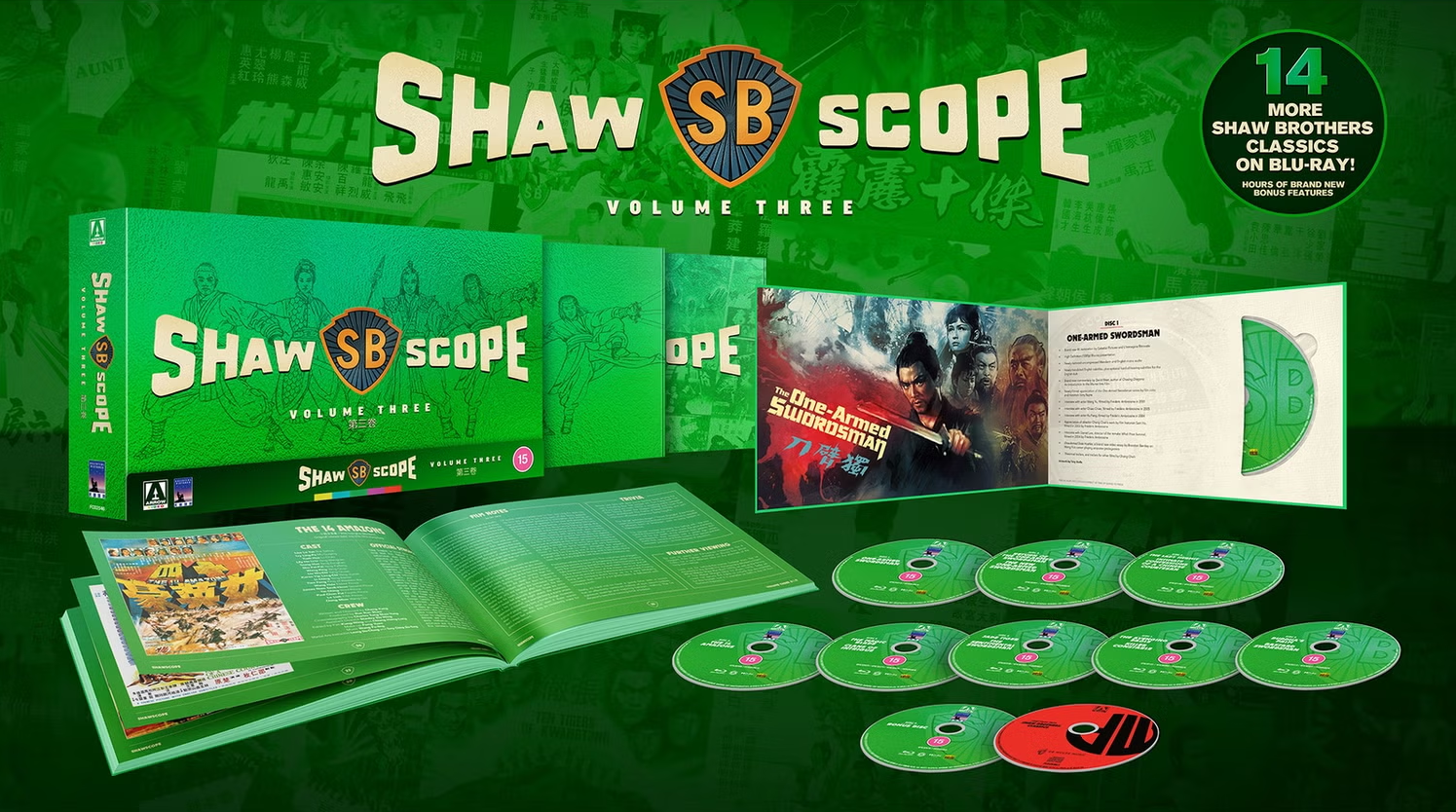 | Disc 1: One-Armed Swordsman – Brand new commentary by David West, author of Chasing Dragons: An Introduction to the Martial Arts Film – Newly filmed appreciation of the One-Armed Swordsman series by film critic and historian Tony Rayns – Interview with actor Wang Yu, filmed in 2001 – Interview with actor Chiao Chiao, filmed in 2005 – Interview with actor Ku Feng, filmed in 2004 – Appreciation of director Chang Cheh’s work by film historian Sam Ho, filmed in 2003 – Interview with Daniel Lee, director of the remake What Price Survival, filmed in 2004 – One-Armed Side Hustles, a brand new video essay by Brandon Bentley on Wang Yu’s career playing amputee protagonists – Theatrical trailers, and trailers for other films by Chang Cheh Disc 2: Return of the One-Armed Swordsman & The New One-Armed Swordsman – Brand new commentary on Return of the One-Armed Swordsman by critic Samm Deighan – Brand new commentary on The New One-Armed Swordsman by martial arts cinema expert Brian Bankston – Theatrical trailers for both films Disc 3: The Lady Hermit & Intimate Confessions of a Chinese Courtesan – Brand new commentary on The Lady Hermit by critic James Mudge – Two brand new commentaries on Intimate Confessions of a Chinese Courtesan, one by film critic and historian Tony Rayns, one by critic Samm Deighan – Alternate English export credits for Intimate Confessions of a Chinese Courtesan – Theatrical trailers for both films Disc 4: The 14 Amazons – Brand new commentary by Jonathan Clements, author of A Brief History of China – Interview with stuntwoman Sharon Yeung, filmed in 2004 – Interview with film historian Bede Chang, filmed in 2005 – Interview with film critic Law Kar, filmed in 2005 – Theatrical trailers Disc 5: The Magic Blade & Clans of Intrigue – Brand new commentary on The Magic Blade by critic Samm Deighan – Brand new commentary on Clans of Intrigue by critic James Mudge – Alternate version of Clans of Intrigue via seamless branching, featuring four extended scenes previously censored for explicit material – Theatrical trailers for both films Disc 6: Jade Tiger & The Sentimental Swordsman – Brand new commentary on Jade Tiger by critic Ian Jane – Brand new commentary on The Sentimental Swordsman by David West, author of Chasing Dragons: An Introduction to the Martial Arts Film – Theatrical trailers for both films Disc 7: The Avenging Eagle & Killer Constable – Brand new commentary on The Avenging Eagle by martial arts cinema expert Frank Djeng – Three brand new commentaries on Killer Constable: one by film critic and historian Tony Rayns; one by Frank Djeng; one by martial arts cinema expert Brian Bankston – Additional and alternate scenes from the South Korean version of Killer Constable (in standard-definition) – Alternate English-language title sequences for both films – Theatrical trailers for both films Disc 8: Buddha’s Palm & Bastard Swordsman – Brand new commentary on Buddha’s Palm by critic and translator Dylan Cheung – Brand new commentary on Bastard Swordsman by martial arts cinema expert Frank Djeng – Alternate English title sequence for Buddha’s Palm, as Raiders of the Magic Palm – Theatrical trailers for both films Disc 9: Additional Bonus Features – High Definition (with standard-definition VHS inserts) presentation of the rare Korean version of Killer Constable with newly-translated English subtitles, featuring over half an hour of exclusive alternate footage never released outside South Korea before – Newly filmed appreciation of director Chor Yuen by film critic and historian Tony Rayns – Interview with stuntwoman Sharon Yeung on Intimate Confessions of a Chinese Courtesan, filmed in 2005 – Appreciation of Intimate Confessions of a Chinese Courtesan from 2003 by academic Sze Man-hung, musician Kwan King-chung, and filmmaker Clarence Fok (Naked Killer) – Interview with actor Ti Lung, recorded in 2004 – Archive interviews with director Chor Yuen, actors Yuen Wah and Li Ching on The Magic Blade – Appreciation of Chor Yuen’s career by film historian Sam Ho, filmed in 2003 – Interview with screenwriter Sze-to On on The Magic Blade, filmed in 2003 – Interview with actor Ku Feng on The Avenging Eagle, filmed in 2004 – Interview with actor Eddy Ko on The Avenging Eagle, filmed in 2004 |